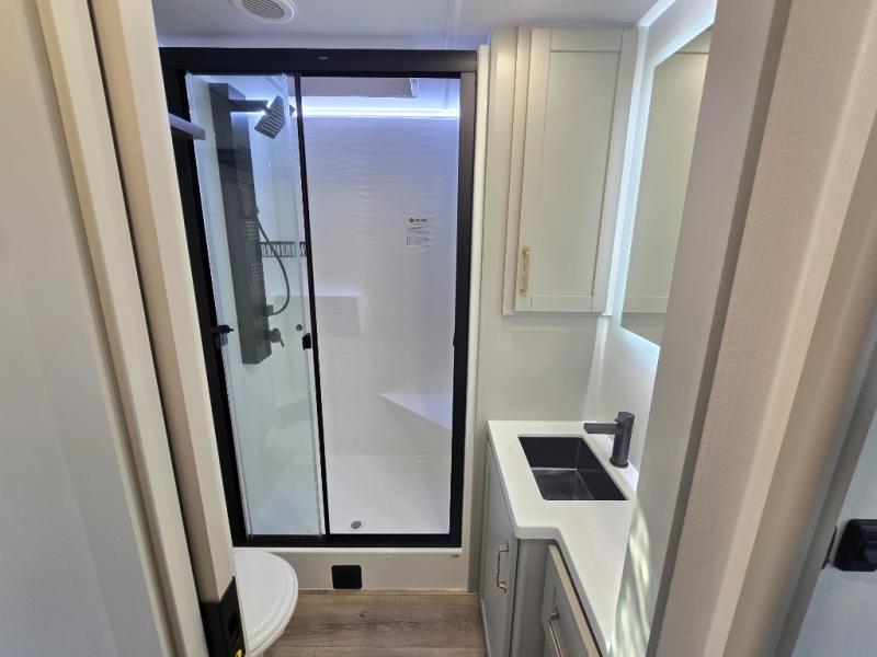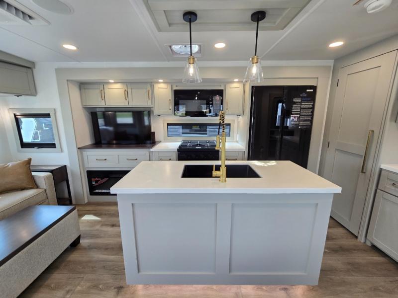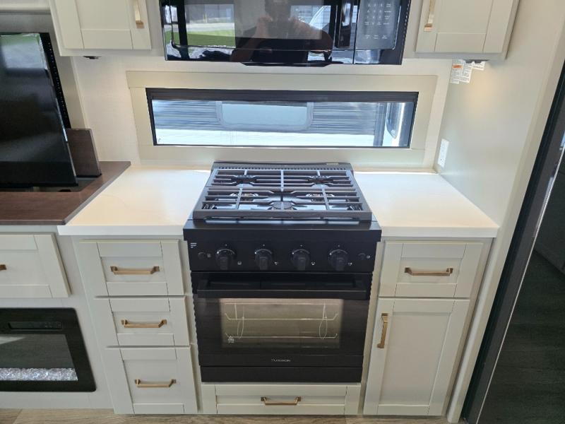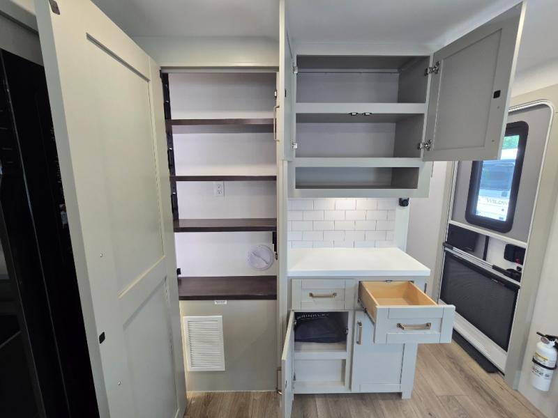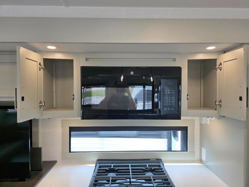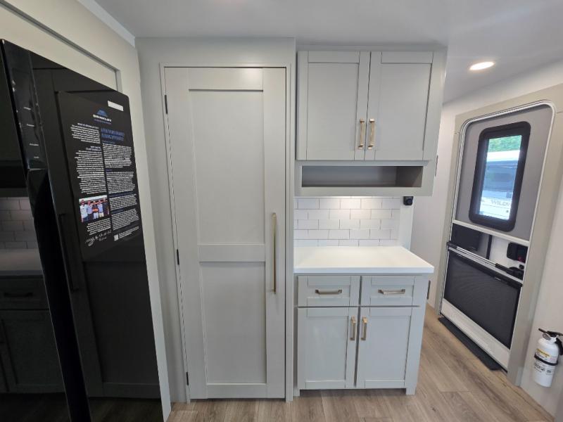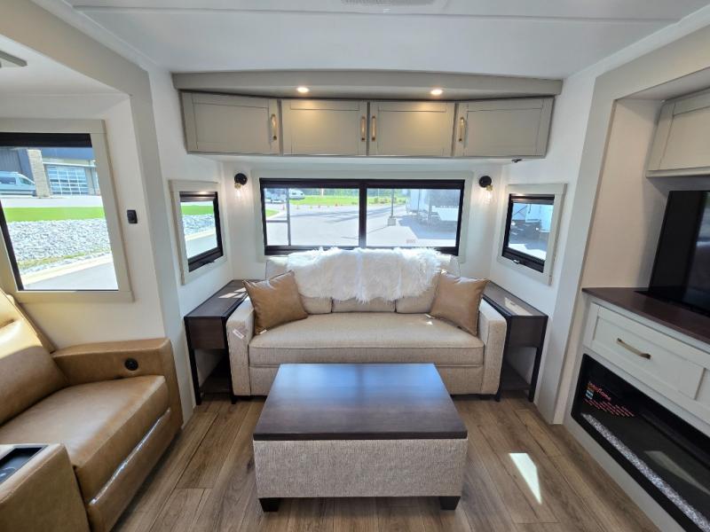 This travel trailer is spacious thanks to the dual opposing slides in the combined kitchen and living area. There is a rear 72" tri-fold sofa here, theater seating, and a sliding desk/dining table. The televator and fireplace will let you relax each evening with a movie or good book, and the full kitchen lets you make meals wherever you go. The chef of your group will also appreciate the pantry with adjustable shelving for all their ingredients, a hutch, 30" residential microwave, and even a pull-out trash bin for easy clean-up. When you're ready to call it a night, the front private bedroom will be waiting for you. This room includes a queen bed with four underbed drawers, a closet with pass-thru access to the bathroom closet, plus washer and dryer prep if you want the option to go full-time!