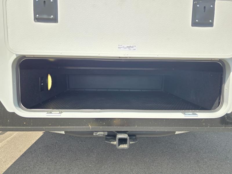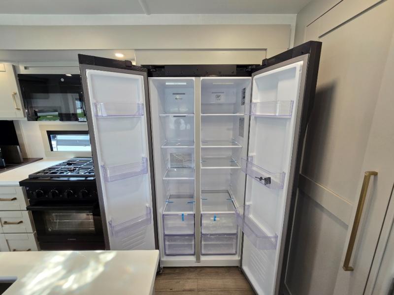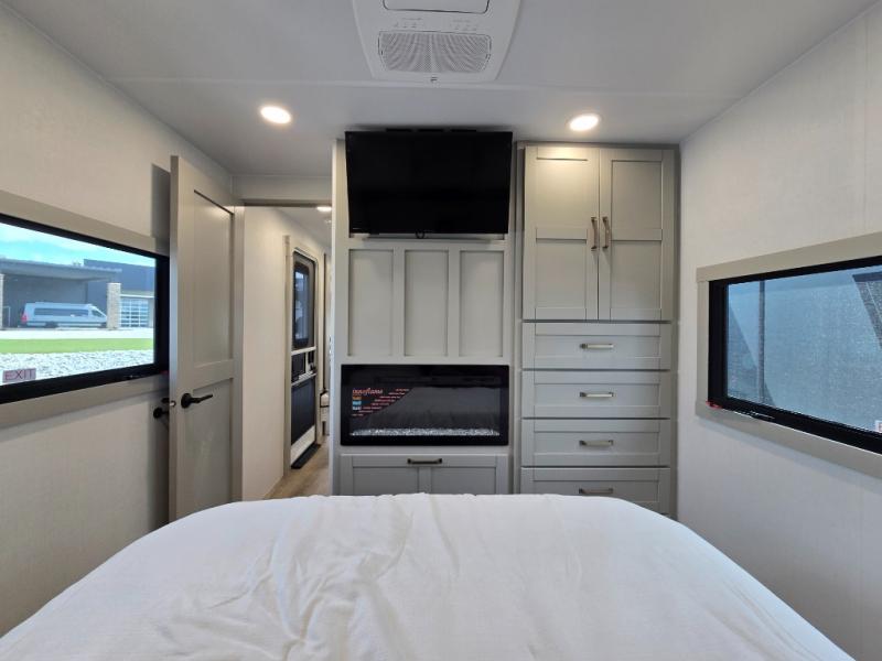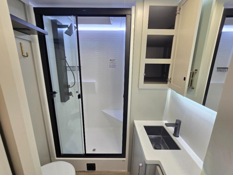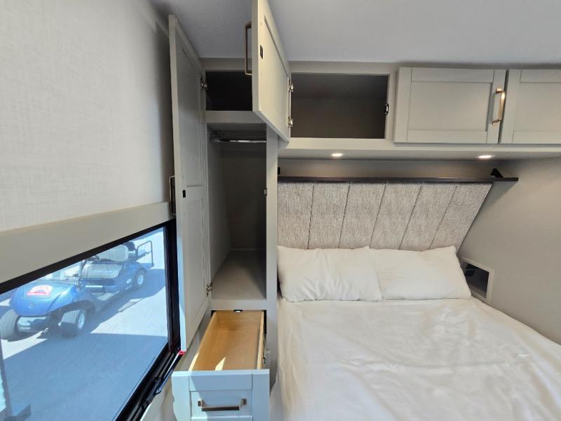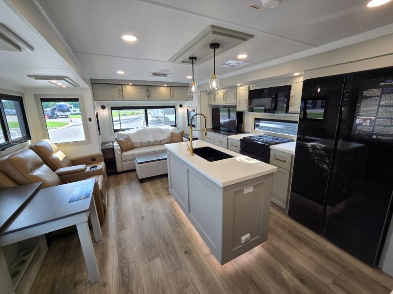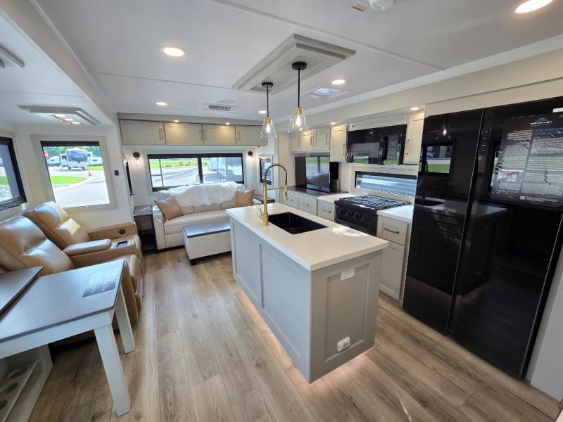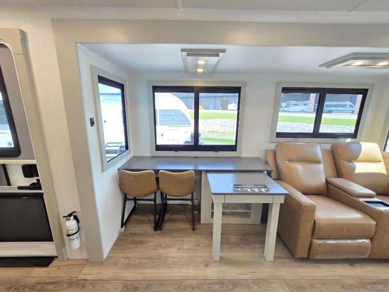 This travel trailer is spacious thanks to the dual opposing slides in the combined kitchen and living area. There is a rear 72" tri-fold sofa here, theater seating, and a sliding desk/dining table. The televator and fireplace will let you relax each evening with a movie or good book, and the full kitchen lets you make meals wherever you go. The chef of your group will also appreciate the pantry with adjustable shelving for all their ingredients, a hutch, 30" residential microwave, and even a pull-out trash bin for easy clean-up. When you're ready to call it a night, the front private bedroom will be waiting for you. This room includes a queen bed with four underbed drawers, a closet with pass-thru access to the bathroom closet, plus washer and dryer prep if you want the option to go full-time!