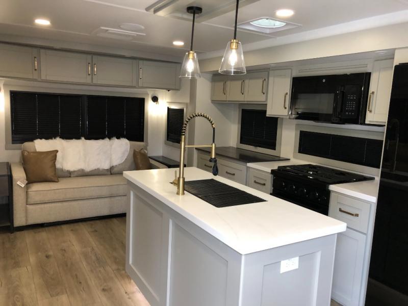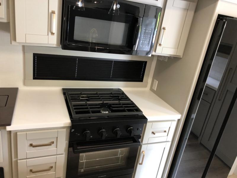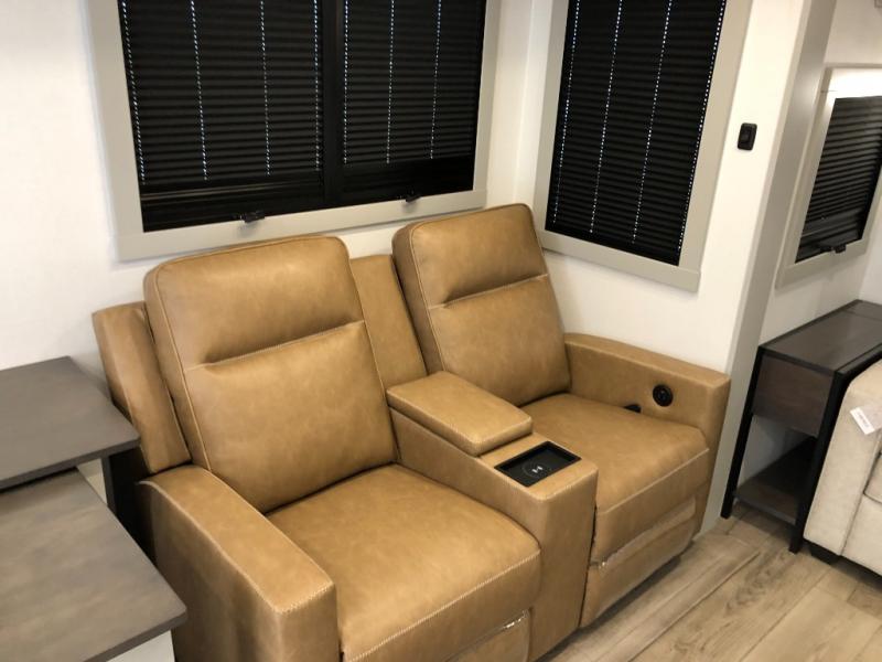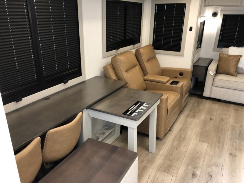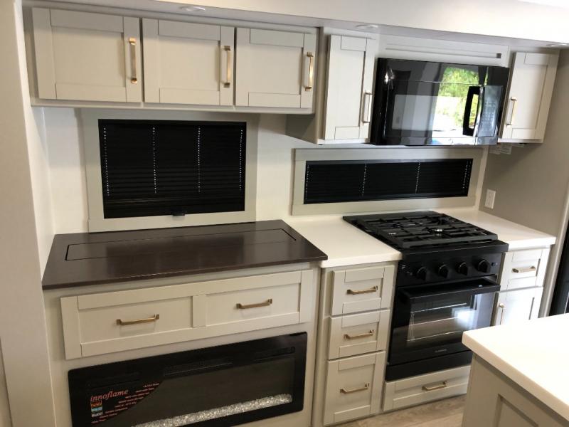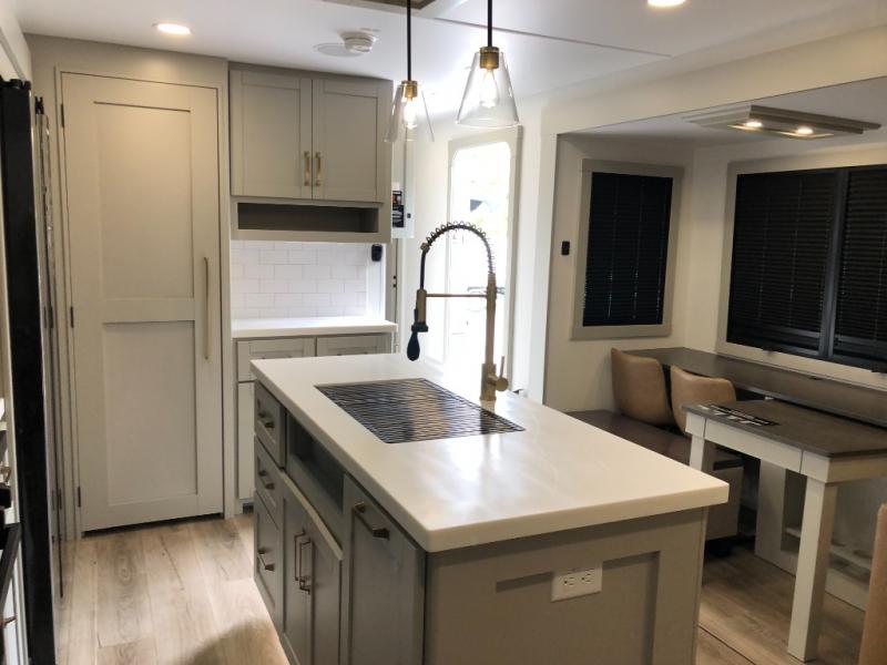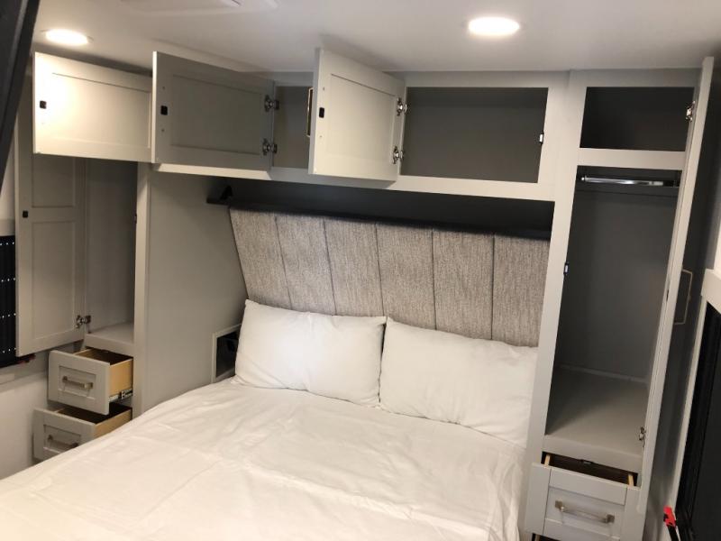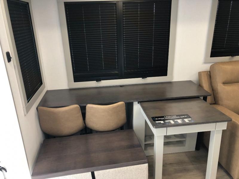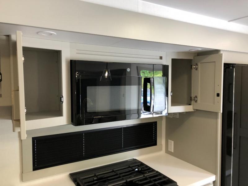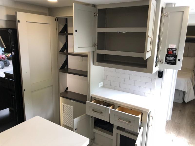 This travel trailer is spacious thanks to the dual opposing slides in the combined kitchen and living area. There is a rear 72" tri-fold sofa here, theater seating, and a sliding desk/dining table. The televator and fireplace will let you relax each evening with a movie or good book, and the full kitchen lets you make meals wherever you go. The chef of your group will also appreciate the pantry with adjustable shelving for all their ingredients, a hutch, 30" residential microwave, and even a pull-out trash bin for easy clean-up. When you're ready to call it a night, the front private bedroom will be waiting for you. This room includes a queen bed with four underbed drawers, a closet with pass-thru access to the bathroom closet, plus washer and dryer prep if you want the option to go full-time!
