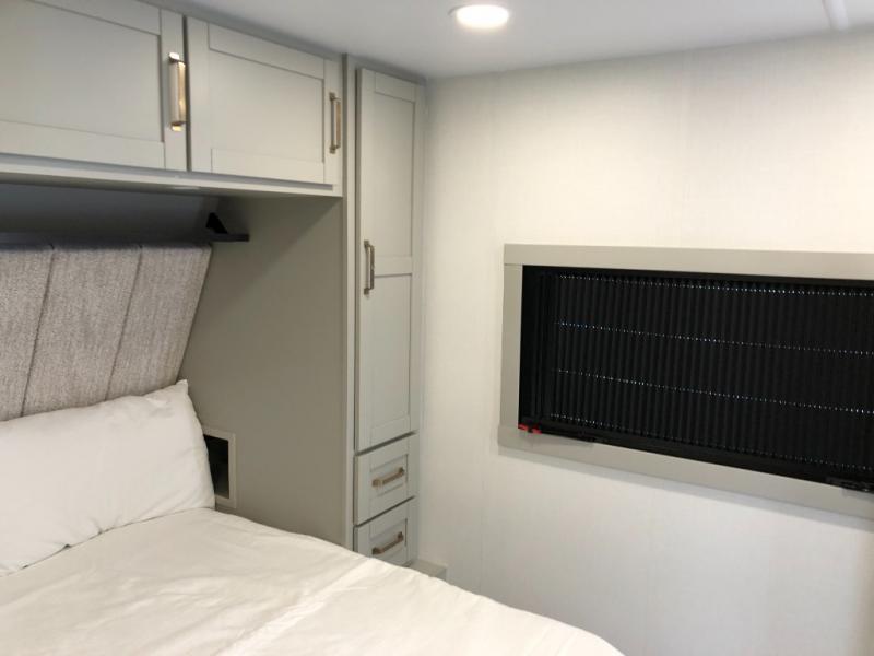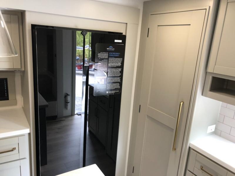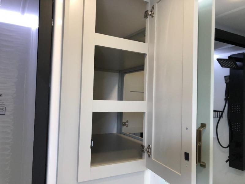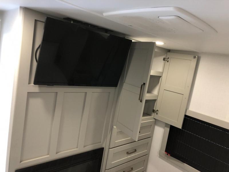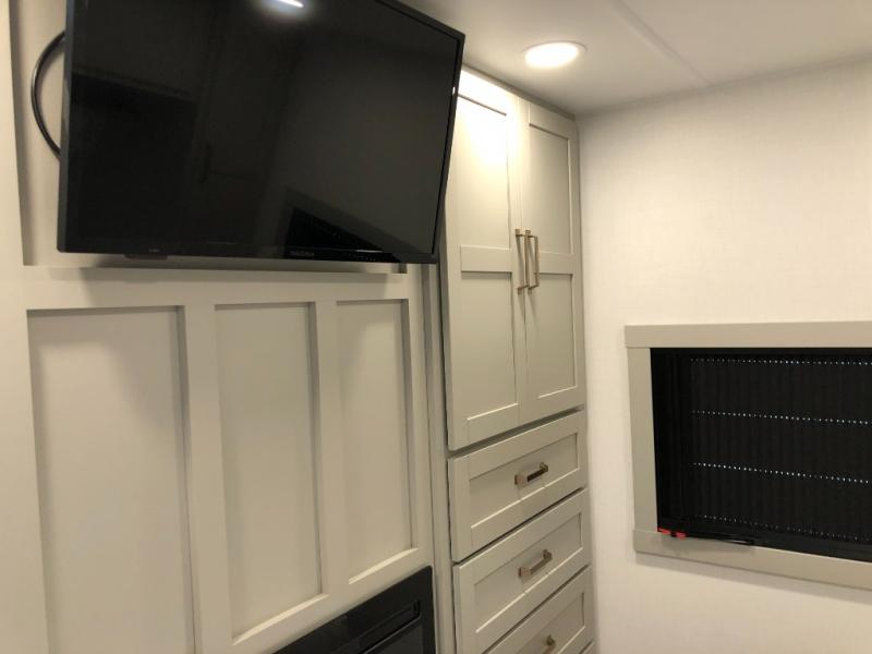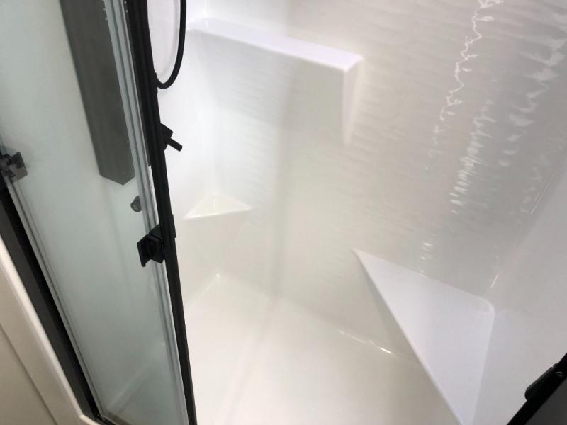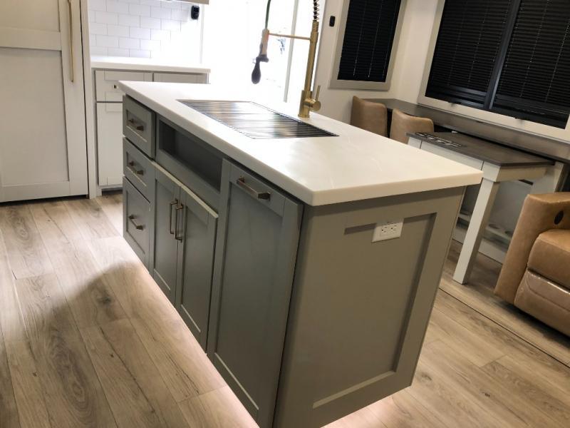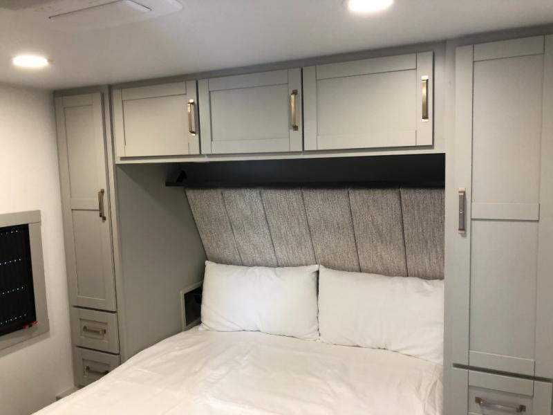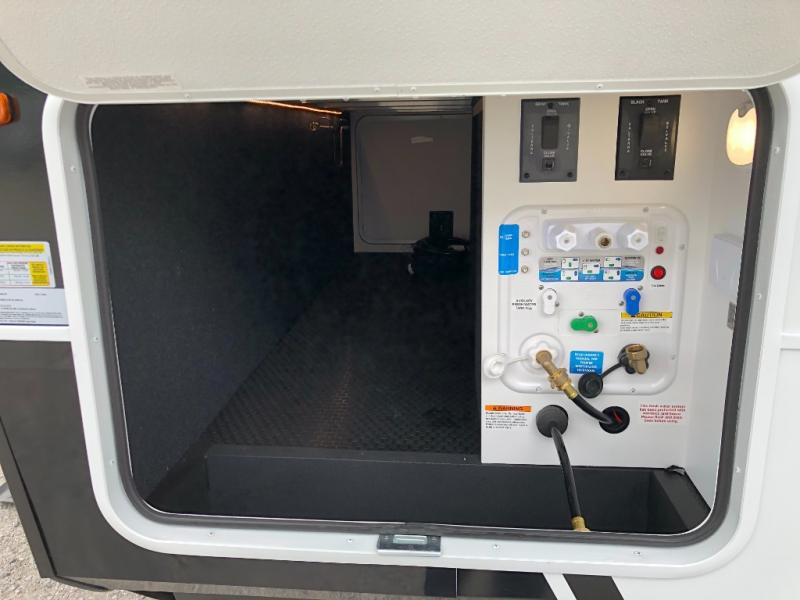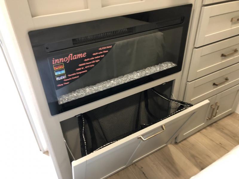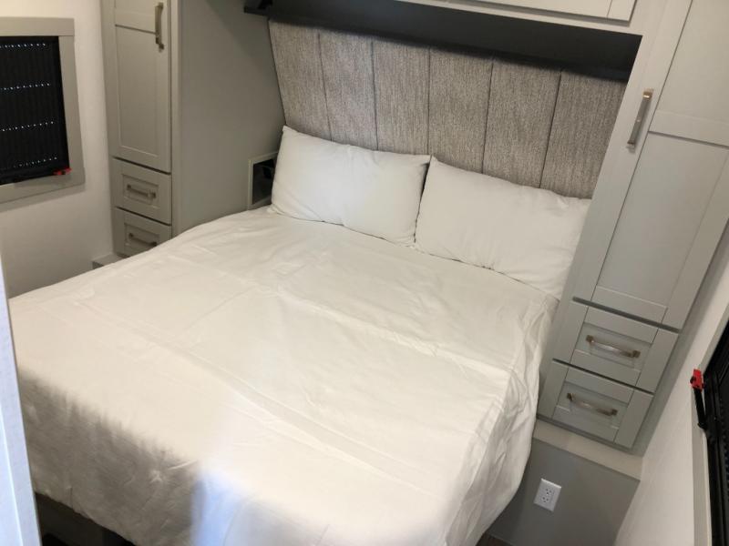 This travel trailer is spacious thanks to the dual opposing slides in the combined kitchen and living area. There is a rear 72" tri-fold sofa here, theater seating, and a sliding desk/dining table. The televator and fireplace will let you relax each evening with a movie or good book, and the full kitchen lets you make meals wherever you go. The chef of your group will also appreciate the pantry with adjustable shelving for all their ingredients, a hutch, 30" residential microwave, and even a pull-out trash bin for easy clean-up. When you're ready to call it a night, the front private bedroom will be waiting for you. This room includes a queen bed with four underbed drawers, a closet with pass-thru access to the bathroom closet, plus washer and dryer prep if you want the option to go full-time!