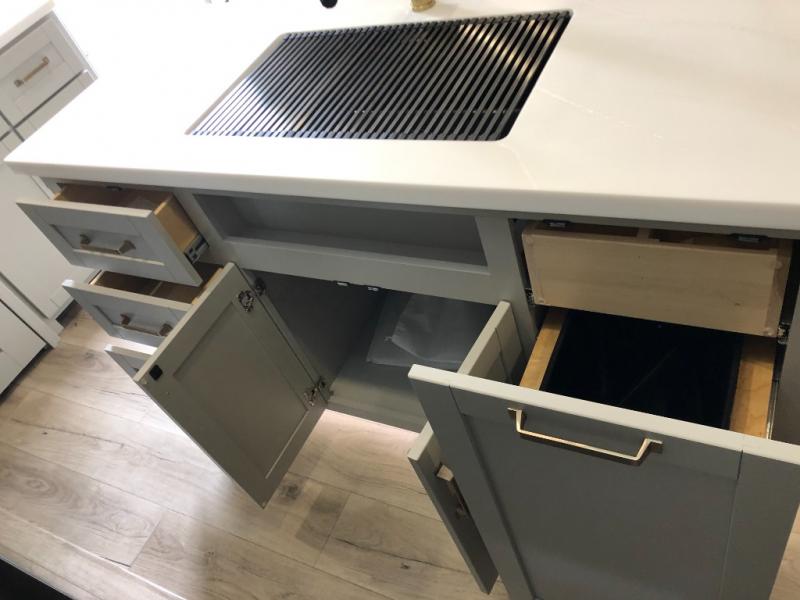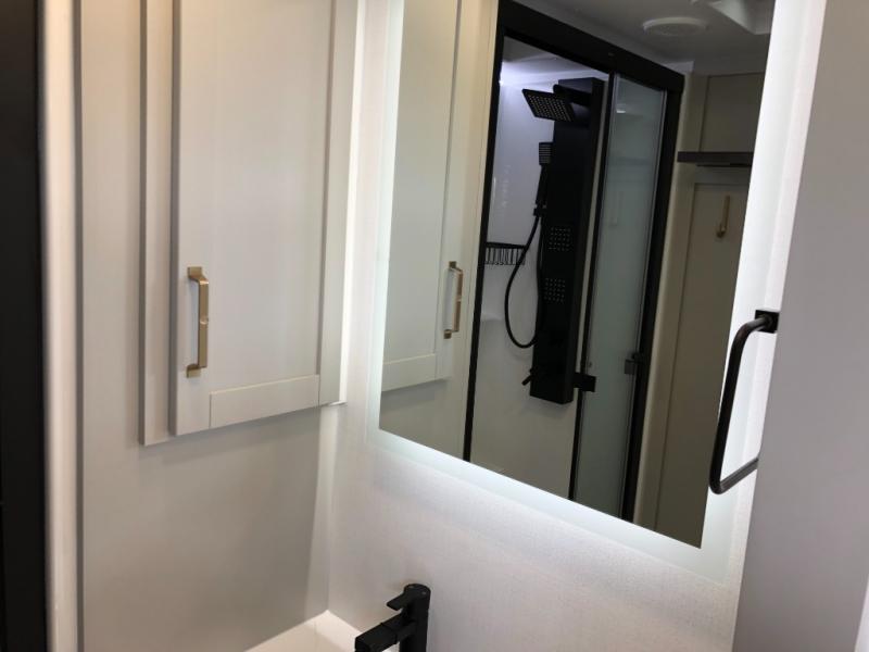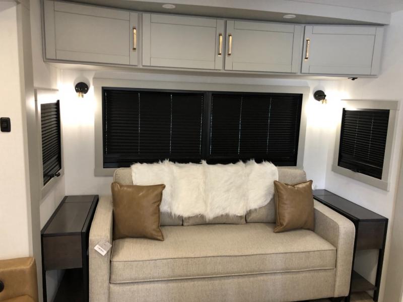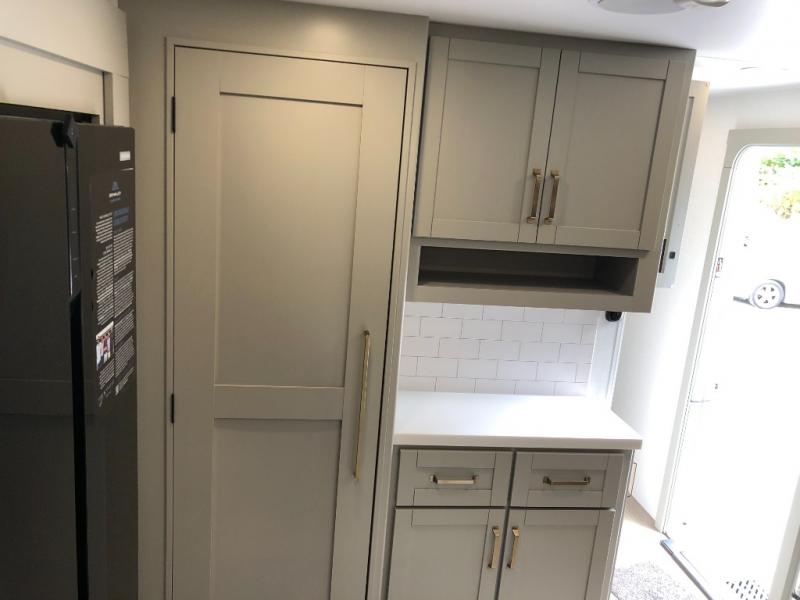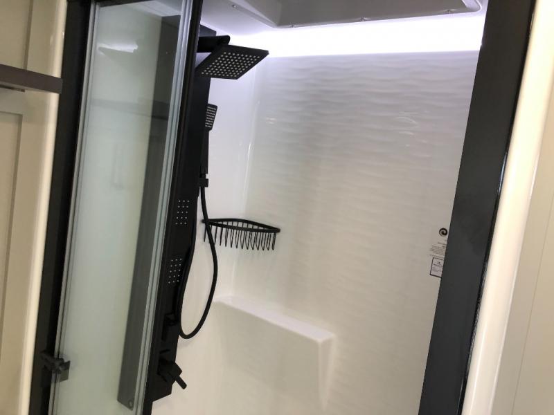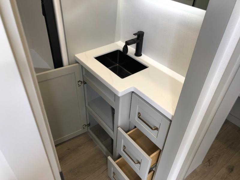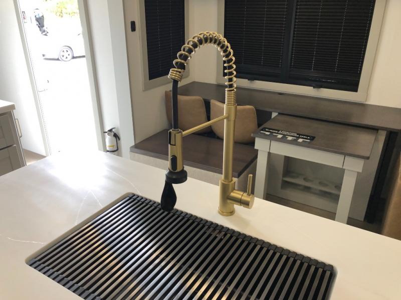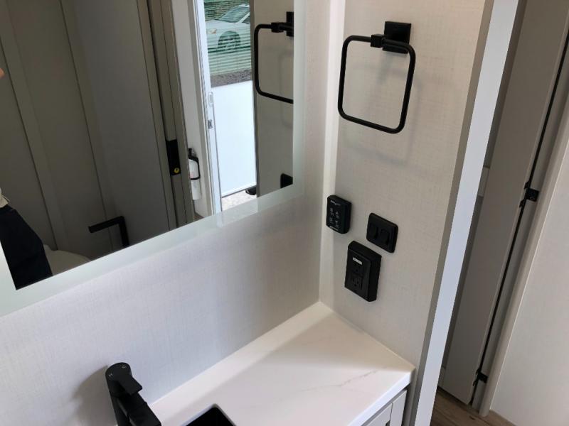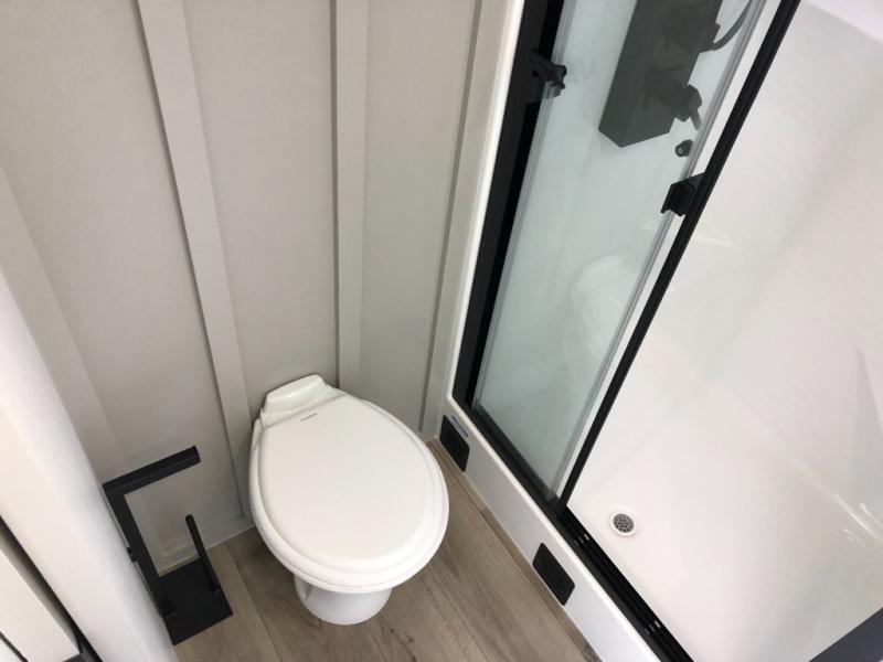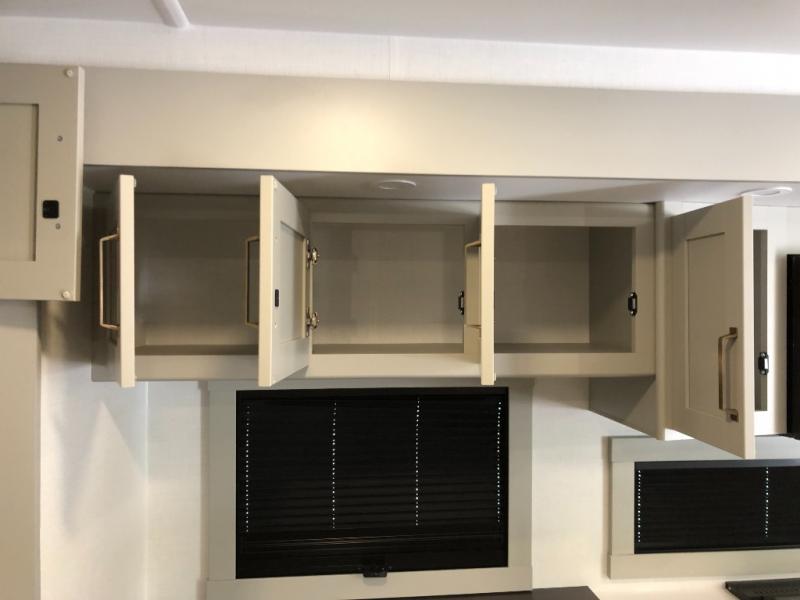 This travel trailer is spacious thanks to the dual opposing slides in the combined kitchen and living area. There is a rear 72" tri-fold sofa here, theater seating, and a sliding desk/dining table. The televator and fireplace will let you relax each evening with a movie or good book, and the full kitchen lets you make meals wherever you go. The chef of your group will also appreciate the pantry with adjustable shelving for all their ingredients, a hutch, 30" residential microwave, and even a pull-out trash bin for easy clean-up. When you're ready to call it a night, the front private bedroom will be waiting for you. This room includes a queen bed with four underbed drawers, a closet with pass-thru access to the bathroom closet, plus washer and dryer prep if you want the option to go full-time!