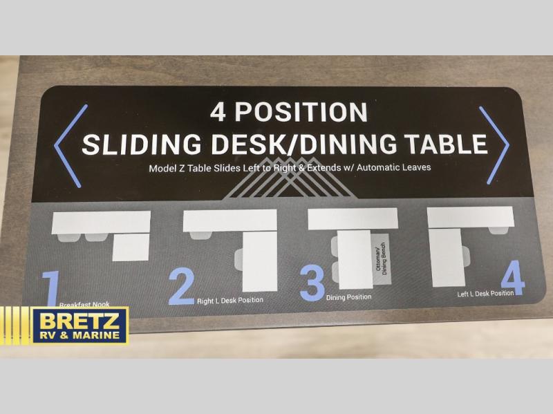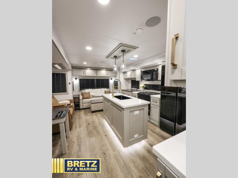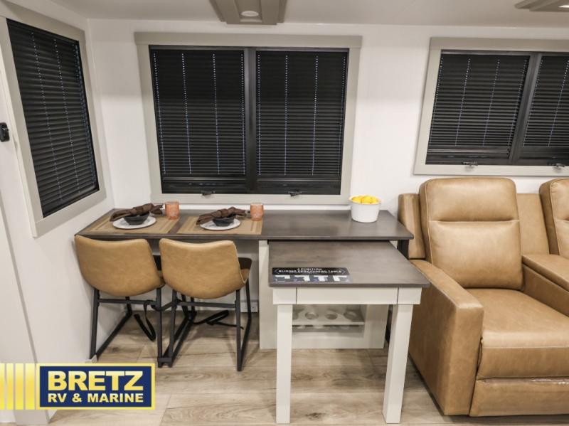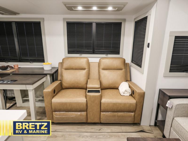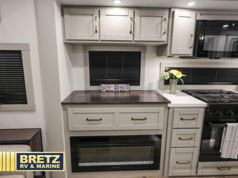This travel trailer is spacious thanks to the dual opposing slides in the combined kitchen and living area. There is a rear 72" tri-fold sofa here, theater seating, and a sliding desk/dining table. The televator and fireplace will let you relax each evening with a movie or good book, and the full kitchen lets you make meals wherever you go. The chef of your group will also appreciate the pantry with adjustable shelving for all their ingredients, a hutch, 30" residential microwave, and even a pull-out trash bin for easy clean-up. When you're ready to call it a night, the front private bedroom will be waiting for you. This room includes a queen bed with four underbed drawers, a closet with pass-thru access to the bathroom closet, plus washer and dryer prep if you want the option to go full-time!