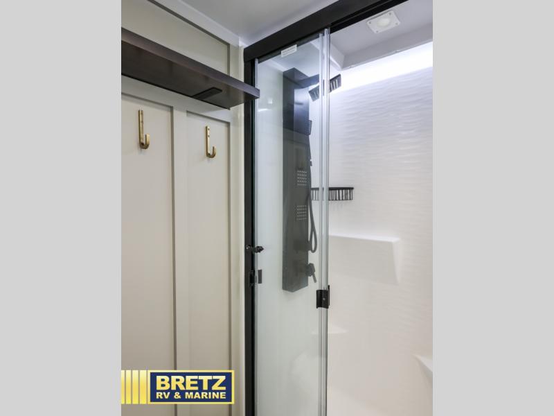 With any Model Z Air travel trailer by Brinkley, you will enjoy premium features at every turn. The industry-first low maintenance roof is sure to be appreciated, plus there are industry-first brass plumbing connections for excellent resistance to corrosion. The drop-frame chassis with ample exterior storage will allow you to bring along camp gear galore, plus there are motion lighting and power outlets for added convenience! You'll also find two hot/cold showers outdoors, along with a 370-watt solar panel, a custom LP box with locked battery storage, and a premium utility center with a retractable 65' water hose to wash off mud from the lake. The interior is just as accommodating with its solid surface countertops, Brinkley CraftSense wood trim construction, integrated window screens and insulated blackout blinds, and the list of luxury features goes on!