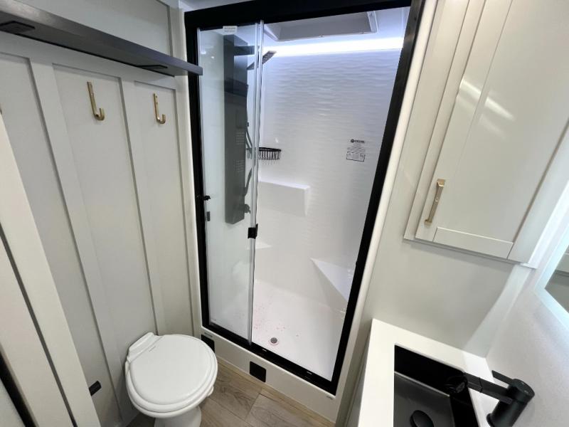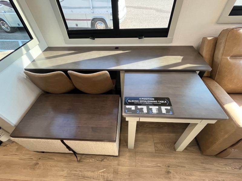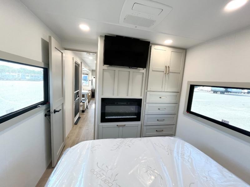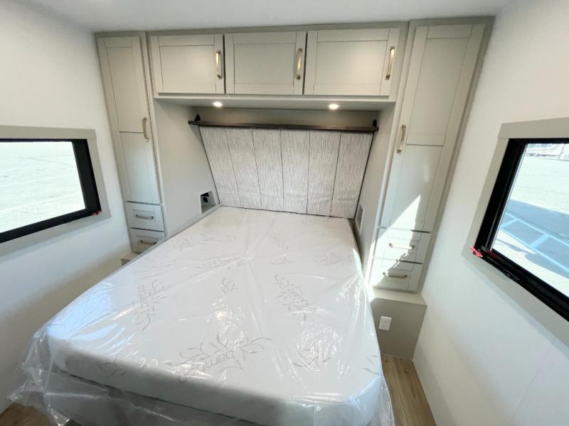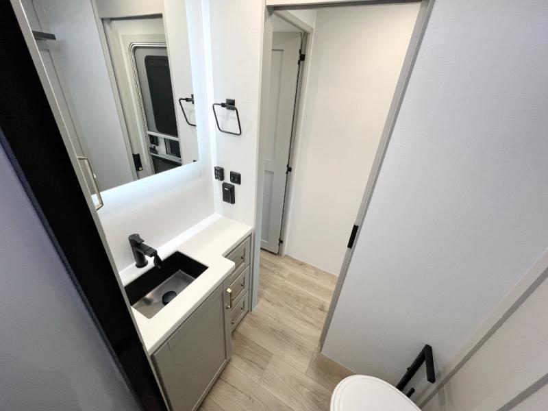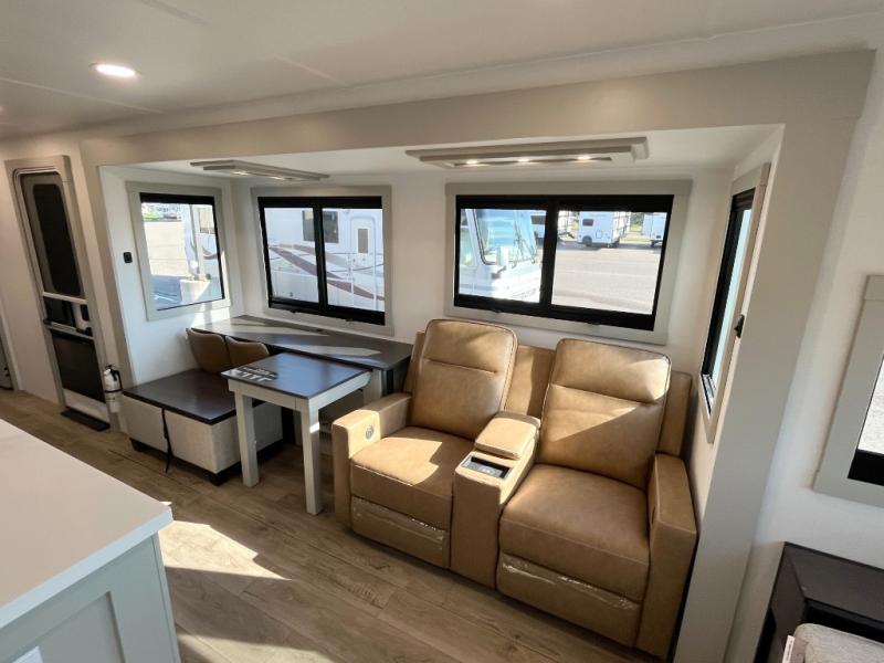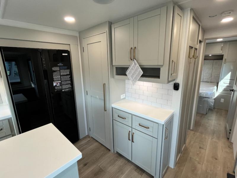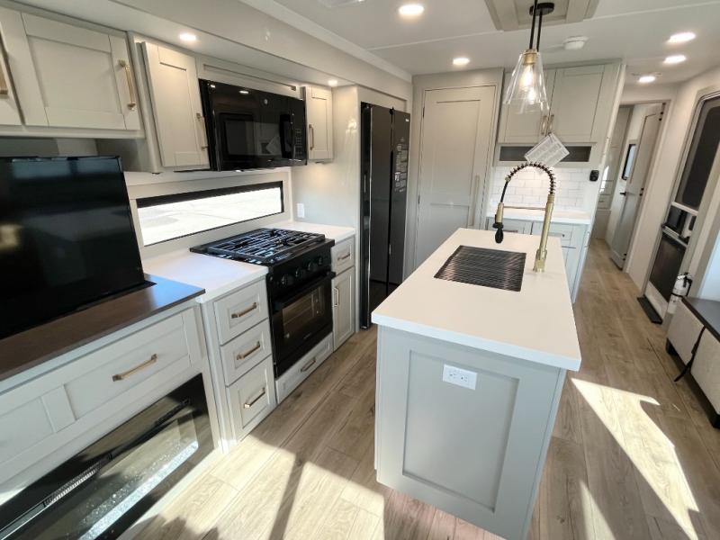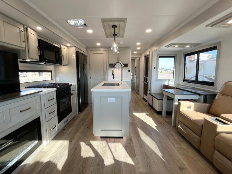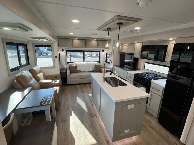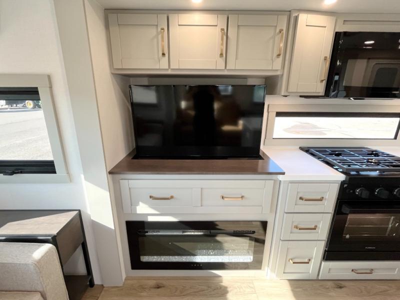 This travel trailer is spacious thanks to the dual opposing slides in the combined kitchen and living area. There is a rear 72" tri-fold sofa here, theater seating, and a sliding desk/dining table. The televator and fireplace will let you relax each evening with a movie or good book, and the full kitchen lets you make meals wherever you go. The chef of your group will also appreciate the pantry with adjustable shelving for all their ingredients, a hutch, 30" residential microwave, and even a pull-out trash bin for easy clean-up. When you're ready to call it a night, the front private bedroom will be waiting for you. This room includes a queen bed with four underbed drawers, a closet with pass-thru access to the bathroom closet, plus washer and dryer prep if you want the option to go full-time!