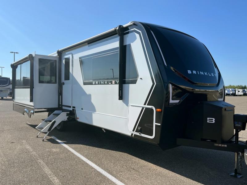 With any Model Z Air travel trailer by Brinkley, you will enjoy premium features at every turn. The industry-first low maintenance roof is sure to be appreciated, plus there are industry-first brass plumbing connections for excellent resistance to corrosion. The drop-frame chassis with ample exterior storage will allow you to bring along camp gear galore, plus there are motion lighting and power outlets for added convenience! You'll also find two hot/cold showers outdoors, along with a 370-watt solar panel, a custom LP box with locked battery storage, and a premium utility center with a retractable 65' water hose to wash off mud from the lake. The interior is just as accommodating with its solid surface countertops, Brinkley CraftSense wood trim construction, integrated window screens and insulated blackout blinds, and the list of luxury features goes on!