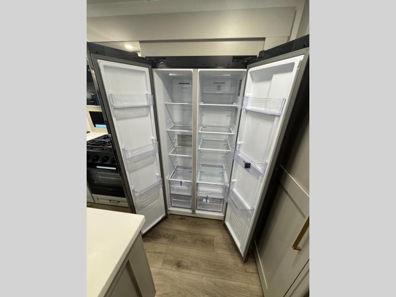 This travel trailer is spacious thanks to the dual opposing slides in the combined kitchen and living area. There is a rear 72" tri-fold sofa here, theater seating, and a sliding desk/dining table. The televator and fireplace will let you relax each evening with a movie or good book, and the full kitchen lets you make meals wherever you go. The chef of your group will also appreciate the pantry with adjustable shelving for all their ingredients, a hutch, 30" residential microwave, and even a pull-out trash bin for easy clean-up. When you're ready to call it a night, the front private bedroom will be waiting for you. This room includes a queen bed with four underbed drawers, a closet with pass-thru access to the bathroom closet, plus washer and dryer prep if you want the option to go full-time!