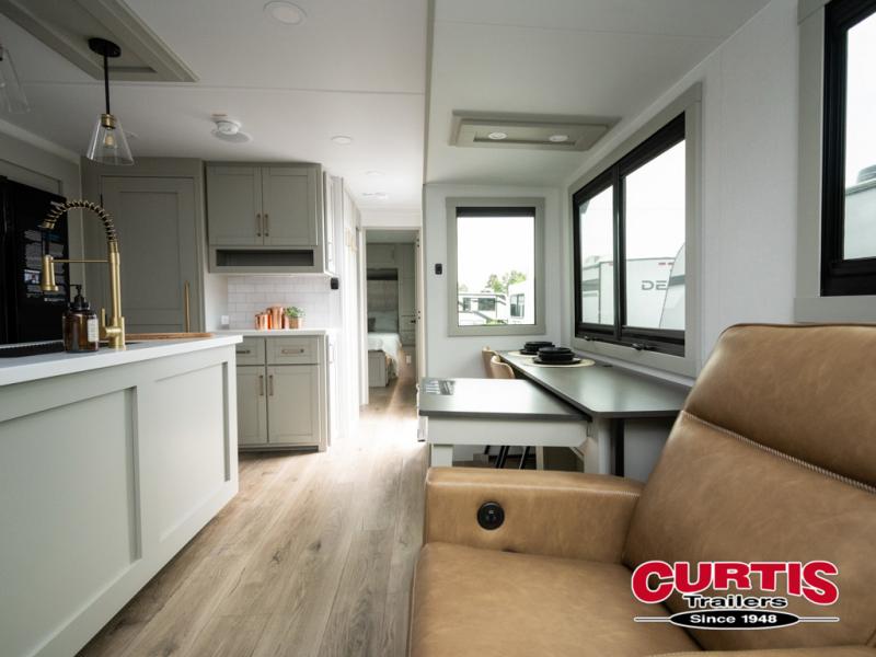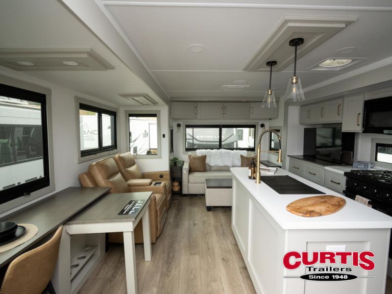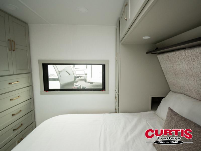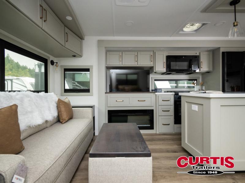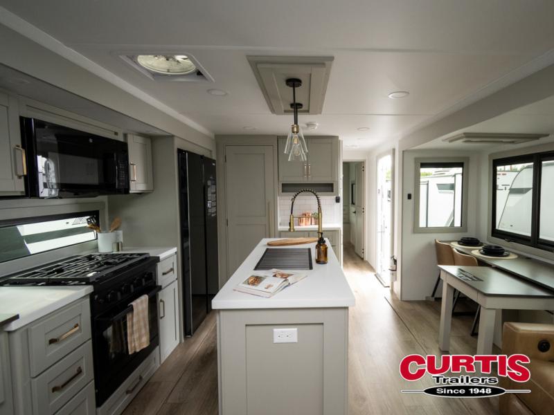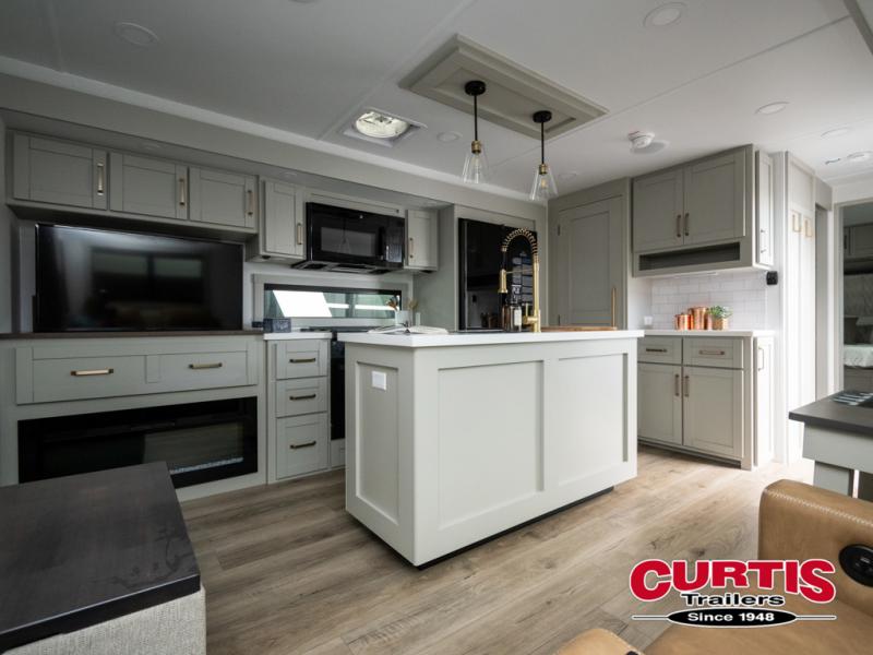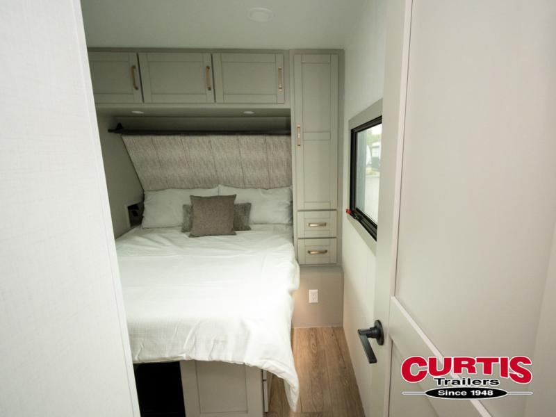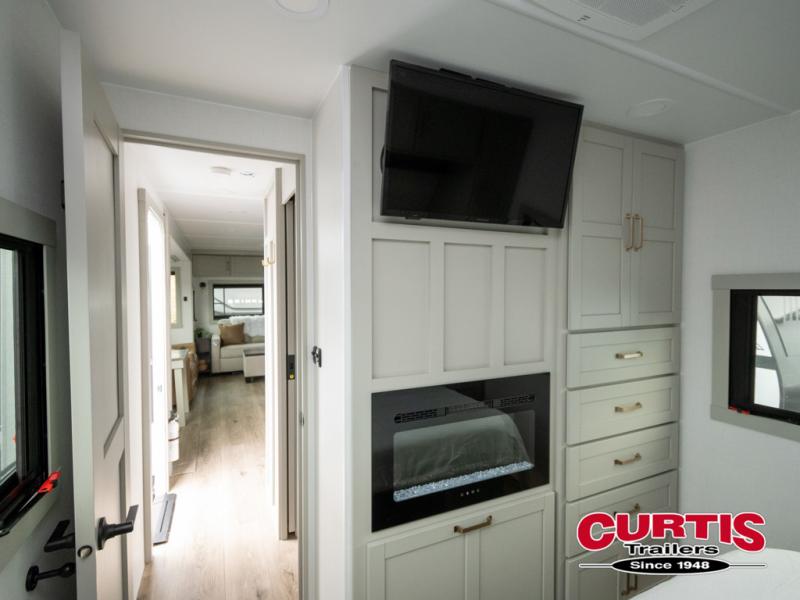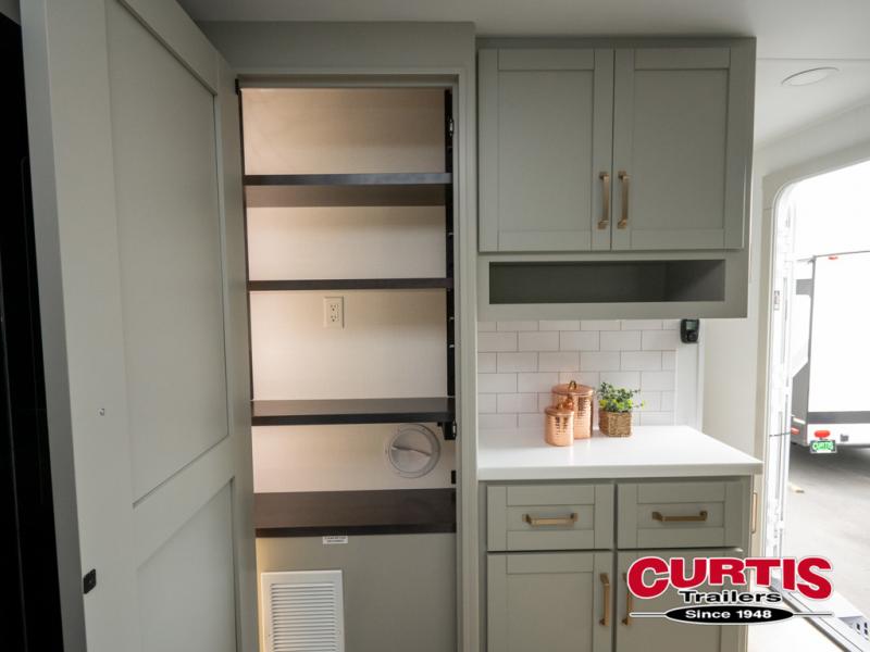 This travel trailer is spacious thanks to the dual opposing slides in the combined kitchen and living area. There is a rear 72" tri-fold sofa here, theater seating, and a sliding desk/dining table. The televator and fireplace will let you relax each evening with a movie or good book, and the full kitchen lets you make meals wherever you go. The chef of your group will also appreciate the pantry with adjustable shelving for all their ingredients, a hutch, 30" residential microwave, and even a pull-out trash bin for easy clean-up. When you're ready to call it a night, the front private bedroom will be waiting for you. This room includes a queen bed with four underbed drawers, a closet with pass-thru access to the bathroom closet, plus washer and dryer prep if you want the option to go full-time!