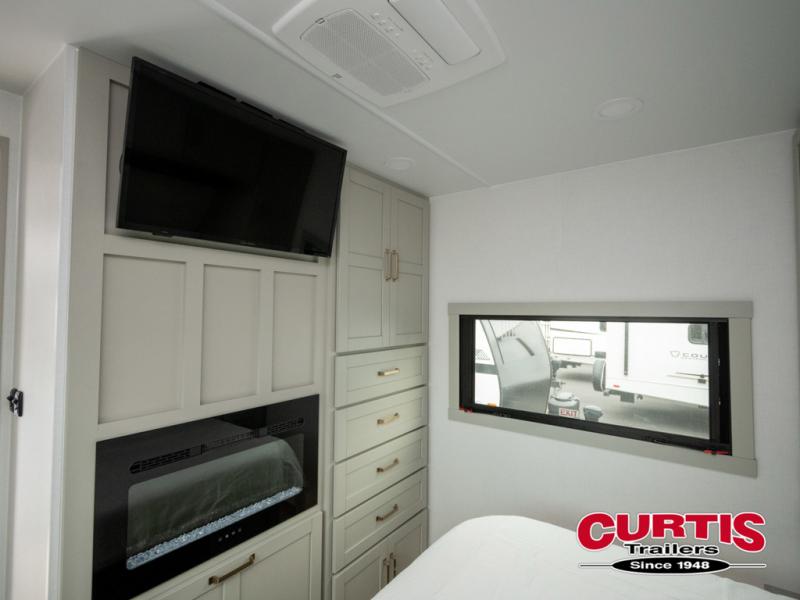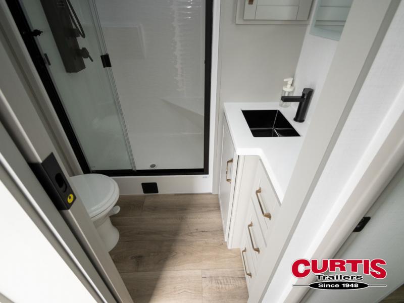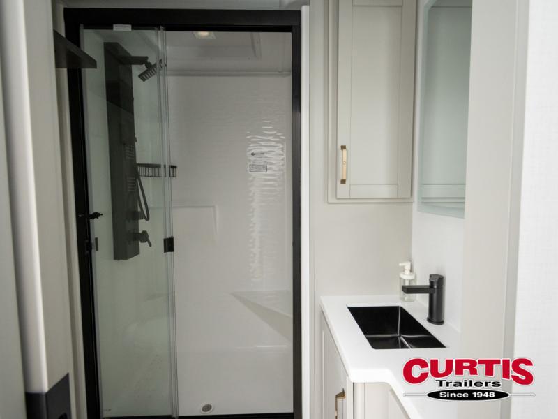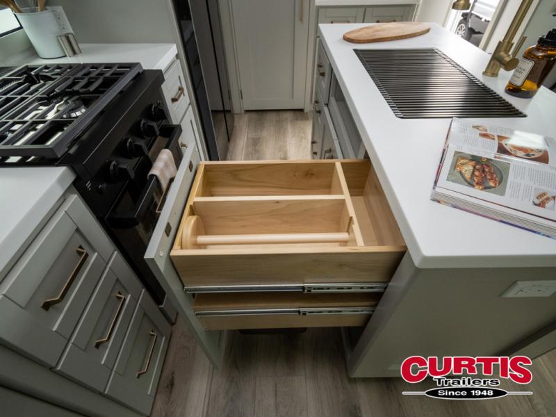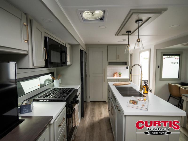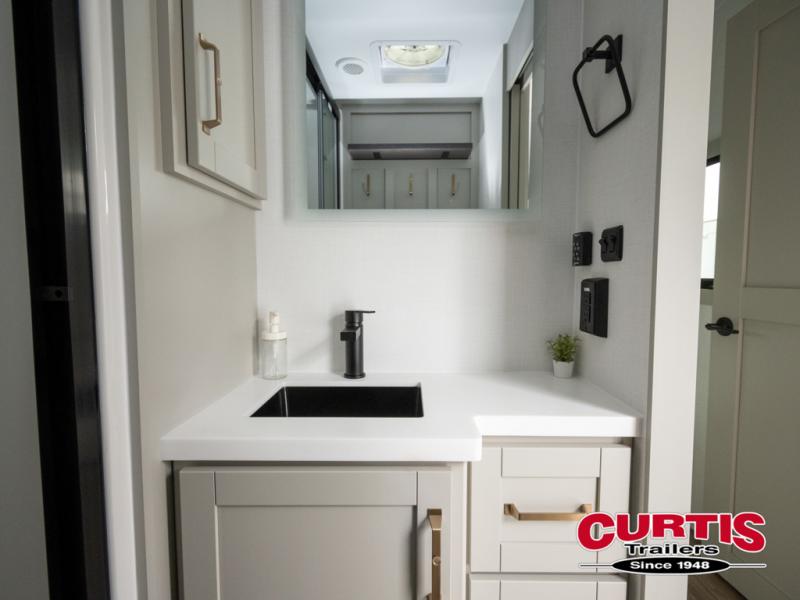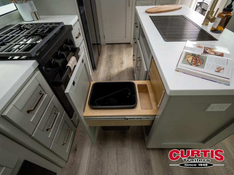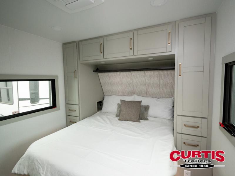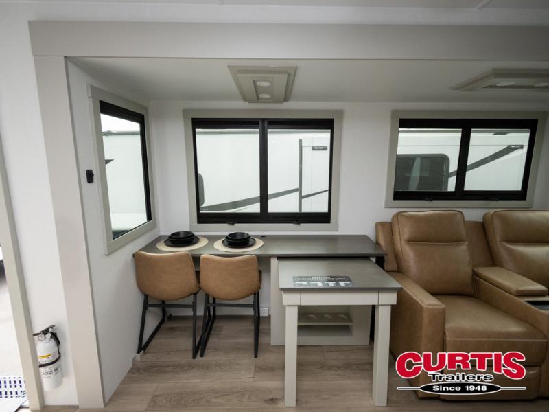 This travel trailer is spacious thanks to the dual opposing slides in the combined kitchen and living area. There is a rear 72" tri-fold sofa here, theater seating, and a sliding desk/dining table. The televator and fireplace will let you relax each evening with a movie or good book, and the full kitchen lets you make meals wherever you go. The chef of your group will also appreciate the pantry with adjustable shelving for all their ingredients, a hutch, 30" residential microwave, and even a pull-out trash bin for easy clean-up. When you're ready to call it a night, the front private bedroom will be waiting for you. This room includes a queen bed with four underbed drawers, a closet with pass-thru access to the bathroom closet, plus washer and dryer prep if you want the option to go full-time!