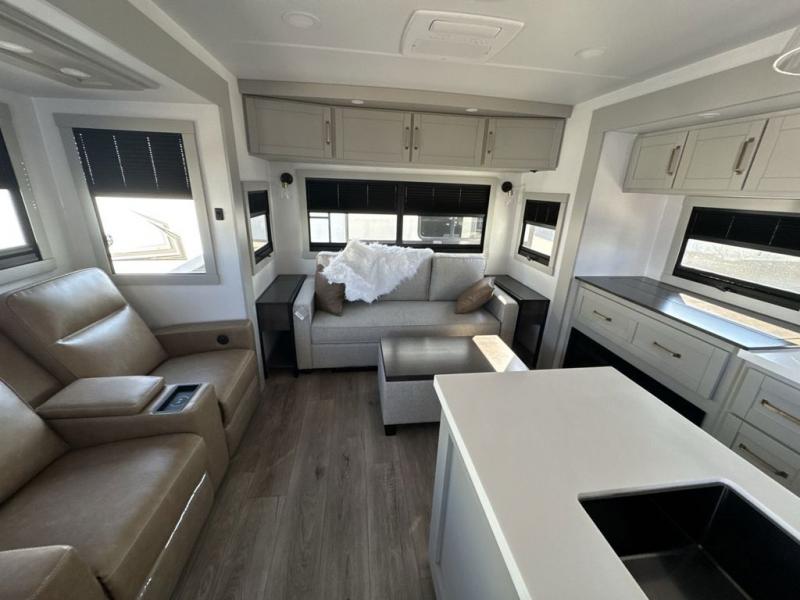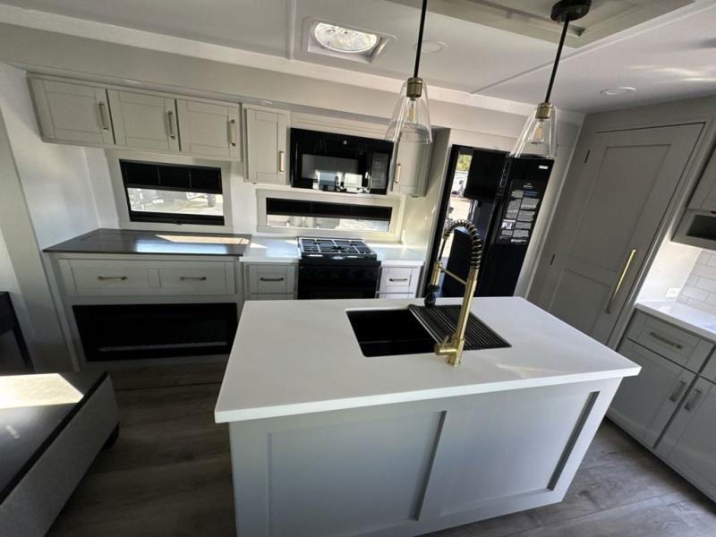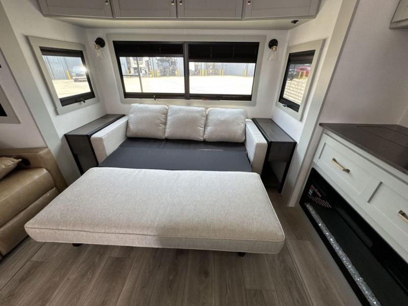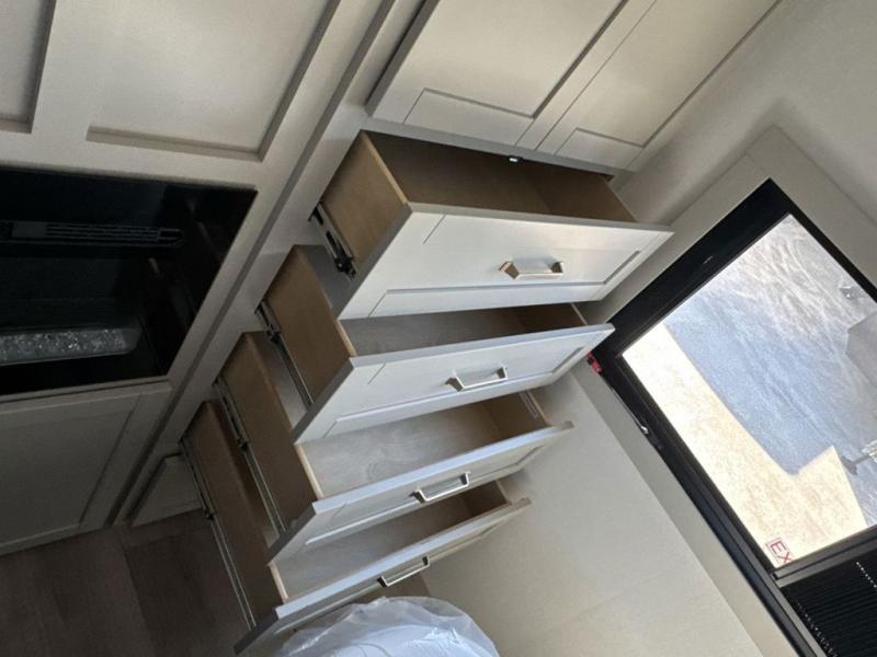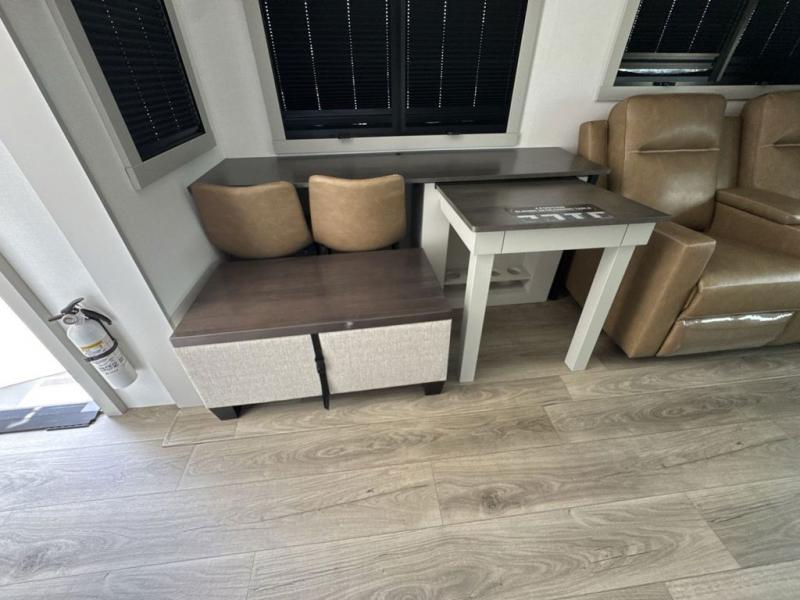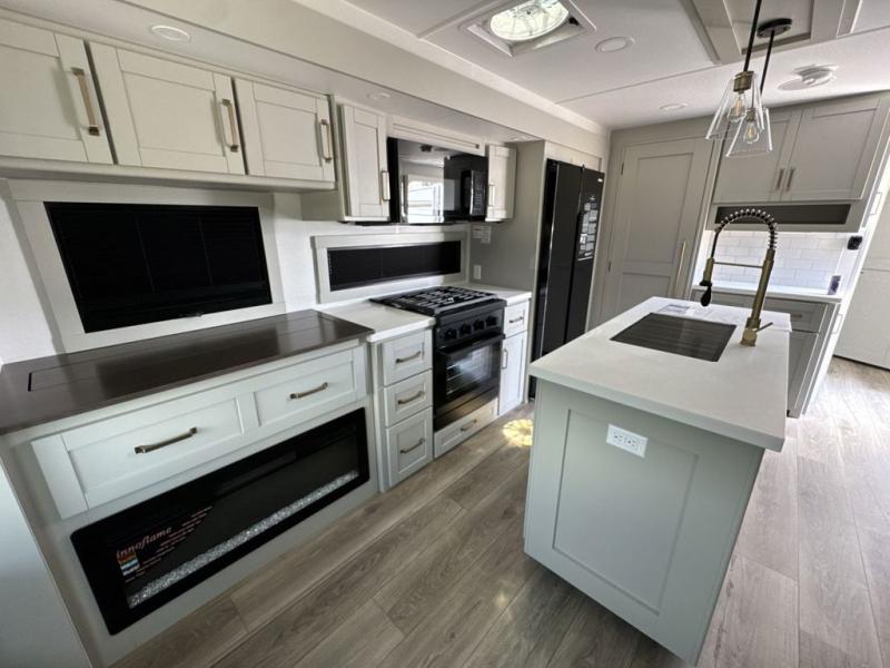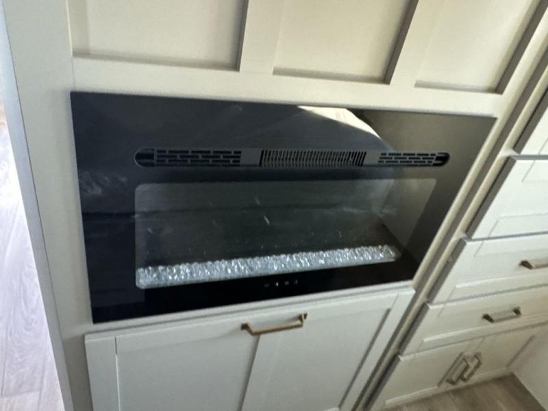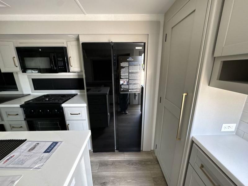 This travel trailer is spacious thanks to the dual opposing slides in the combined kitchen and living area. There is a rear 72" tri-fold sofa here, theater seating, and a sliding desk/dining table. The televator and fireplace will let you relax each evening with a movie or good book, and the full kitchen lets you make meals wherever you go. The chef of your group will also appreciate the pantry with adjustable shelving for all their ingredients, a hutch, 30" residential microwave, and even a pull-out trash bin for easy clean-up. When you're ready to call it a night, the front private bedroom will be waiting for you. This room includes a queen bed with four underbed drawers, a closet with pass-thru access to the bathroom closet, plus washer and dryer prep if you want the option to go full-time!