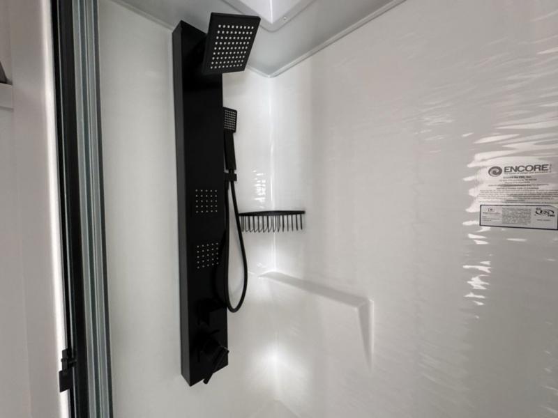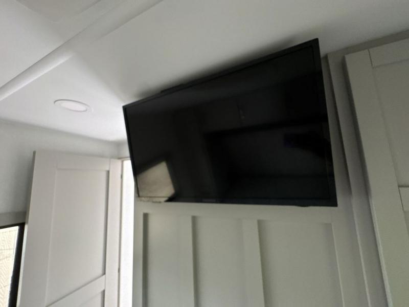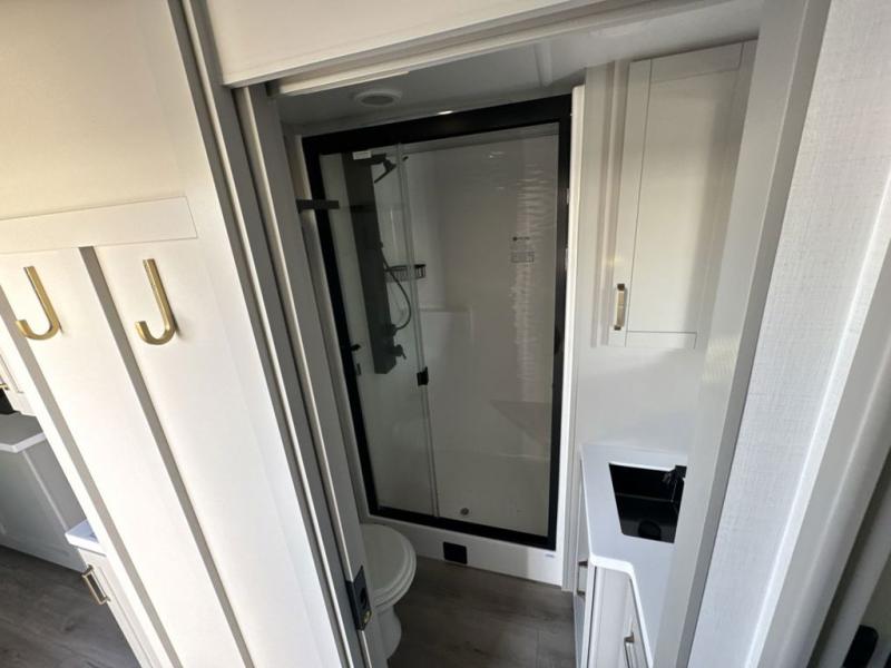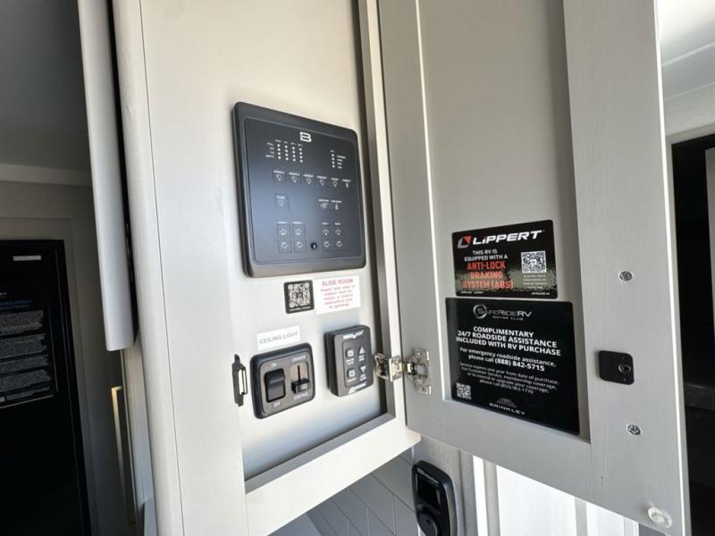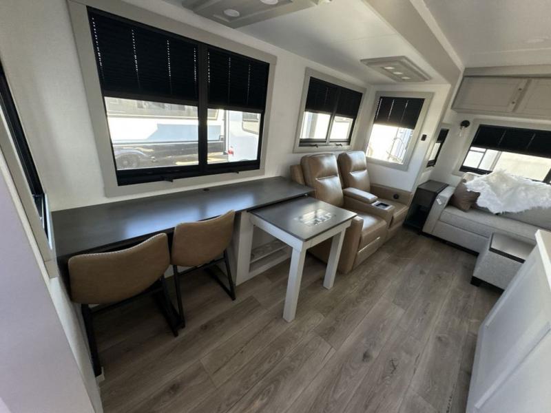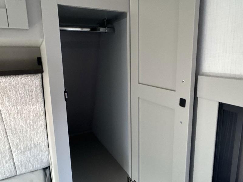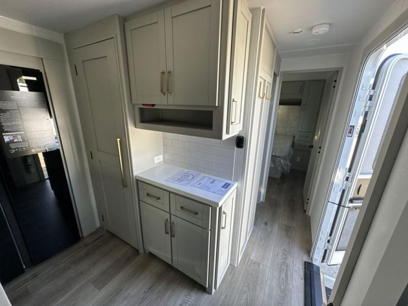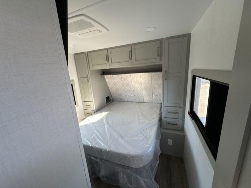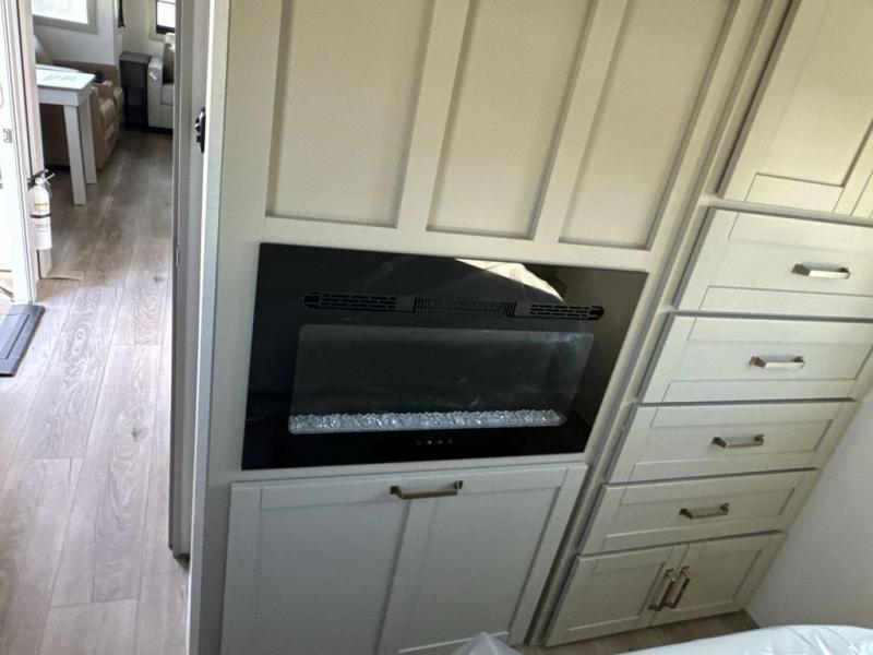 This travel trailer is spacious thanks to the dual opposing slides in the combined kitchen and living area. There is a rear 72" tri-fold sofa here, theater seating, and a sliding desk/dining table. The televator and fireplace will let you relax each evening with a movie or good book, and the full kitchen lets you make meals wherever you go. The chef of your group will also appreciate the pantry with adjustable shelving for all their ingredients, a hutch, 30" residential microwave, and even a pull-out trash bin for easy clean-up. When you're ready to call it a night, the front private bedroom will be waiting for you. This room includes a queen bed with four underbed drawers, a closet with pass-thru access to the bathroom closet, plus washer and dryer prep if you want the option to go full-time!