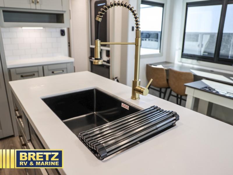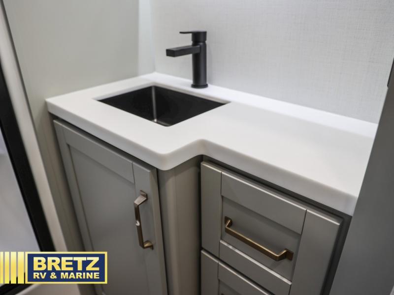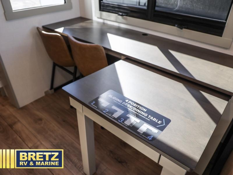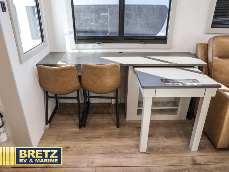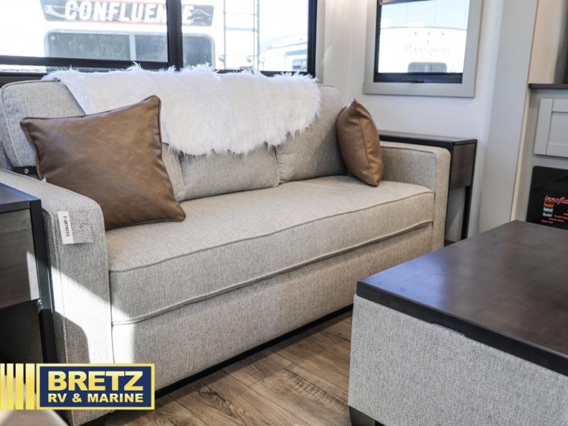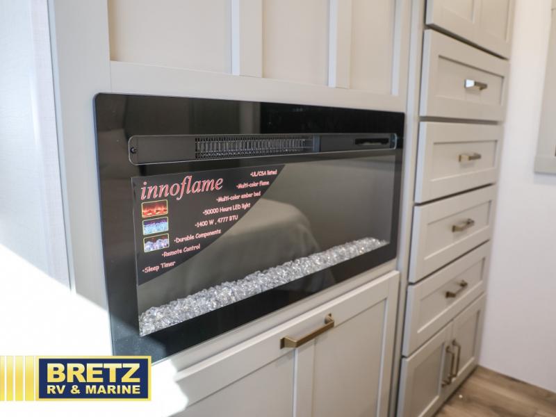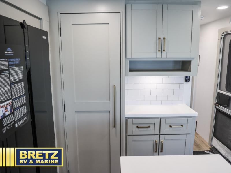 This travel trailer is spacious thanks to the dual opposing slides in the combined kitchen and living area. There is a rear 72" tri-fold sofa here, theater seating, and a sliding desk/dining table. The televator and fireplace will let you relax each evening with a movie or good book, and the full kitchen lets you make meals wherever you go. The chef of your group will also appreciate the pantry with adjustable shelving for all their ingredients, a hutch, 30" residential microwave, and even a pull-out trash bin for easy clean-up. When you're ready to call it a night, the front private bedroom will be waiting for you. This room includes a queen bed with four underbed drawers, a closet with pass-thru access to the bathroom closet, plus washer and dryer prep if you want the option to go full-time!