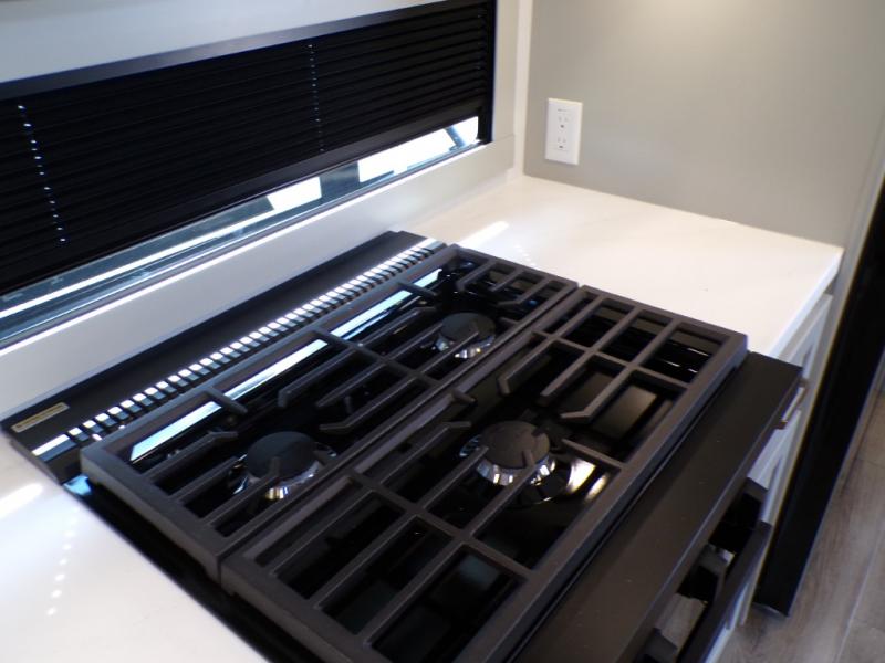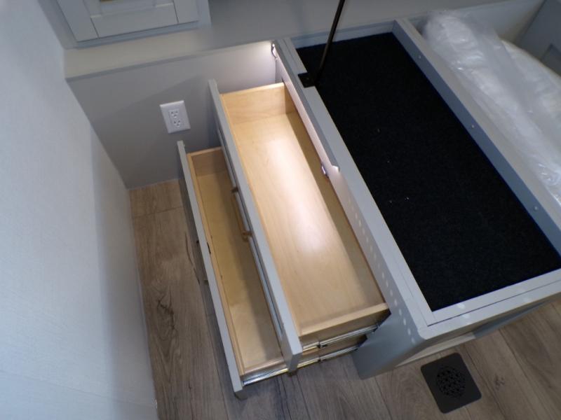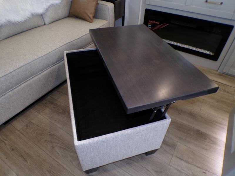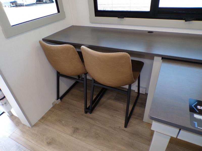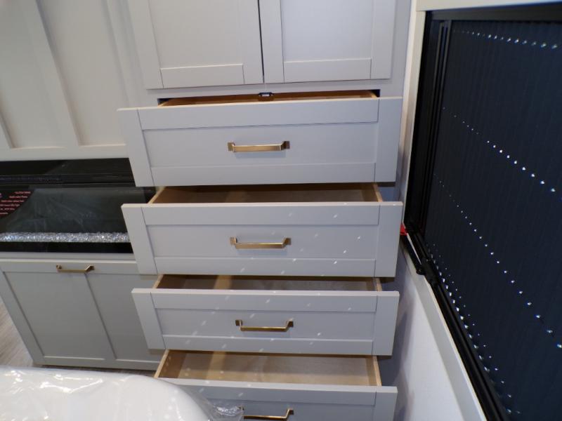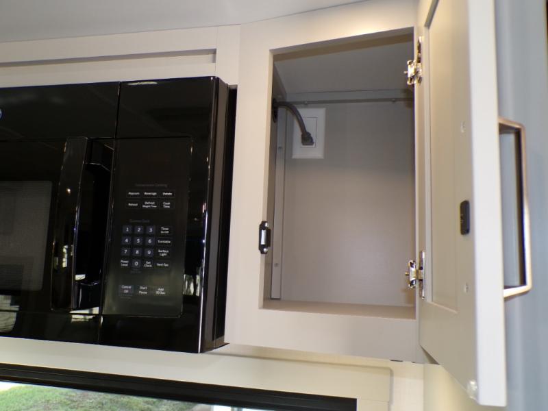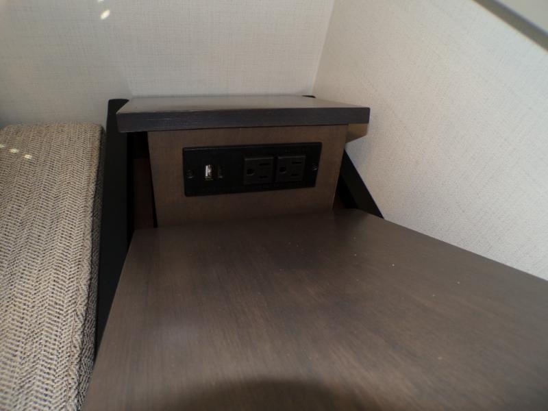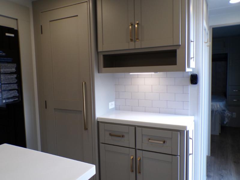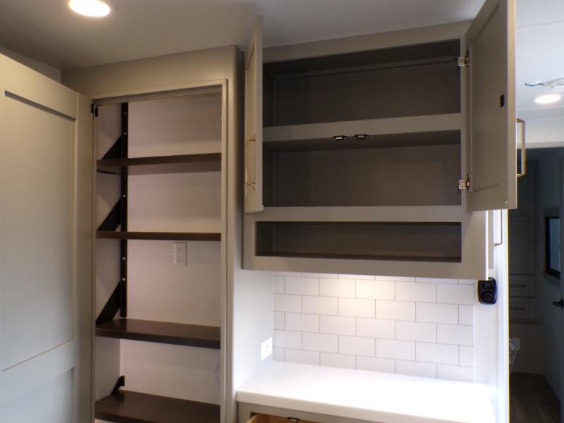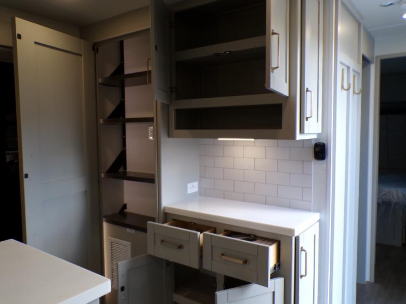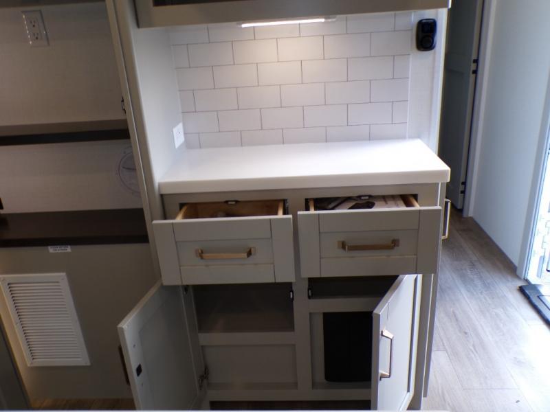 This travel trailer is spacious thanks to the dual opposing slides in the combined kitchen and living area. There is a rear 72" tri-fold sofa here, theater seating, and a sliding desk/dining table. The televator and fireplace will let you relax each evening with a movie or good book, and the full kitchen lets you make meals wherever you go. The chef of your group will also appreciate the pantry with adjustable shelving for all their ingredients, a hutch, 30" residential microwave, and even a pull-out trash bin for easy clean-up. When you're ready to call it a night, the front private bedroom will be waiting for you. This room includes a queen bed with four underbed drawers, a closet with pass-thru access to the bathroom closet, plus washer and dryer prep if you want the option to go full-time!