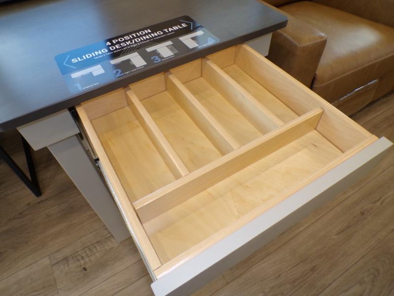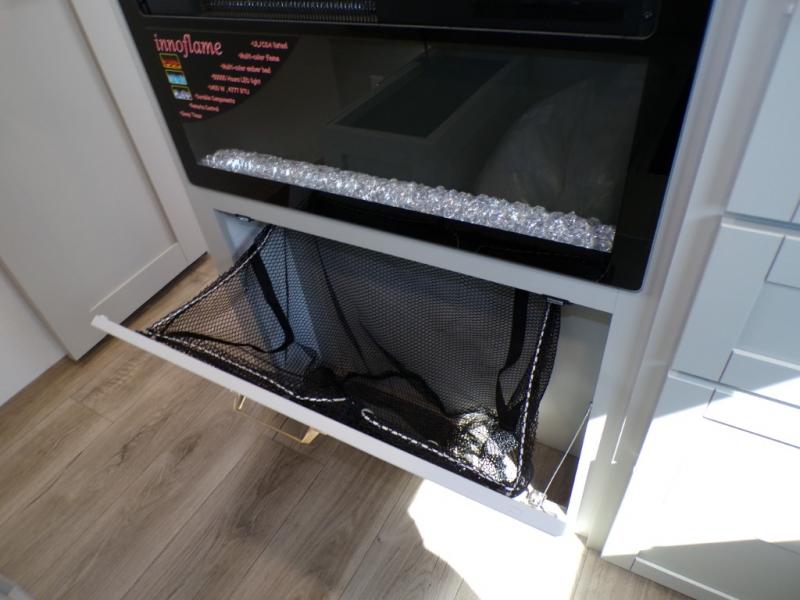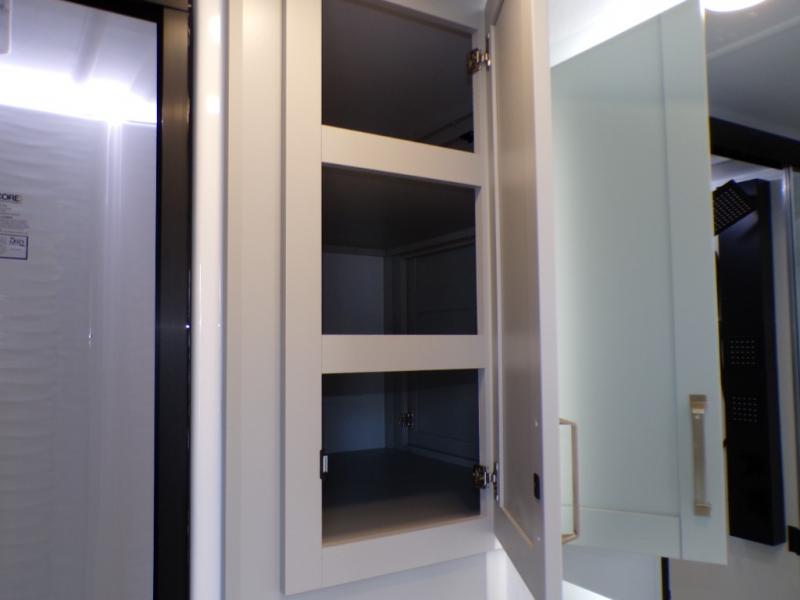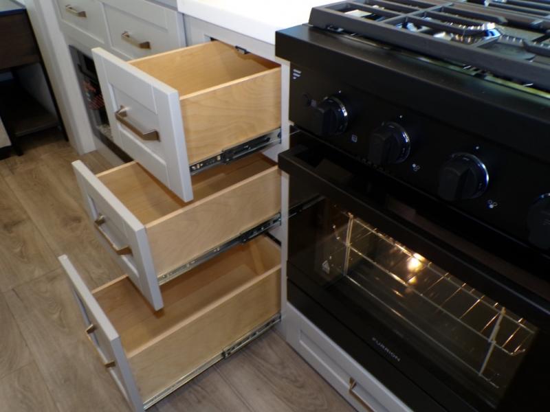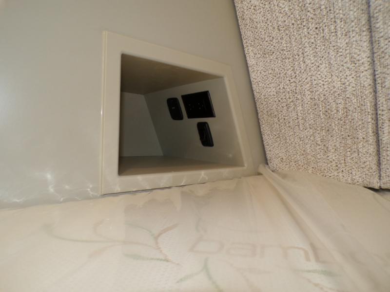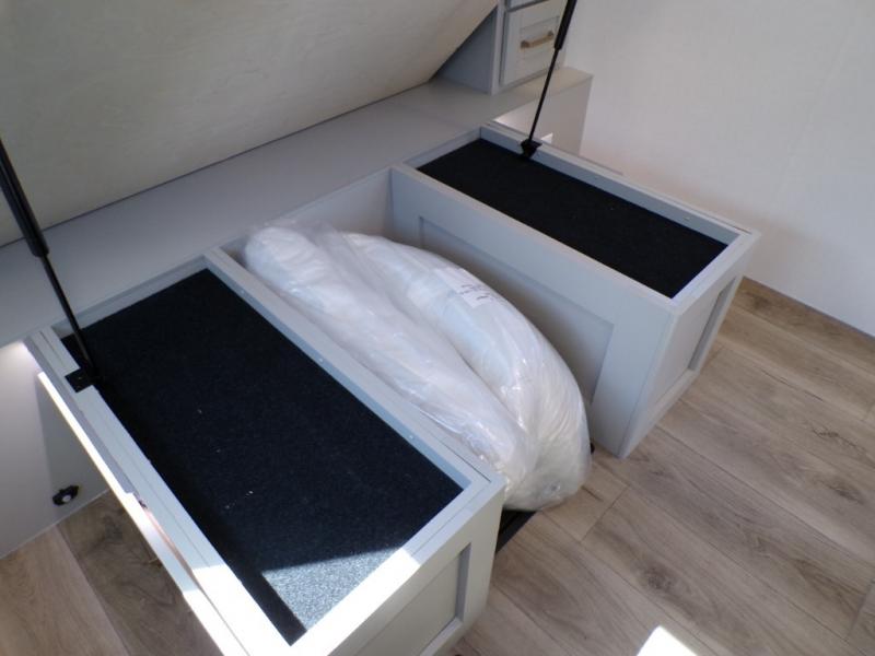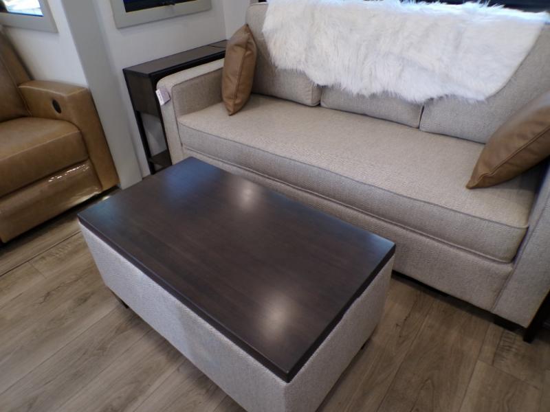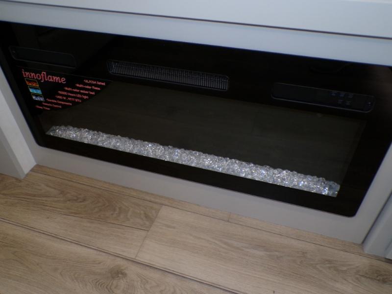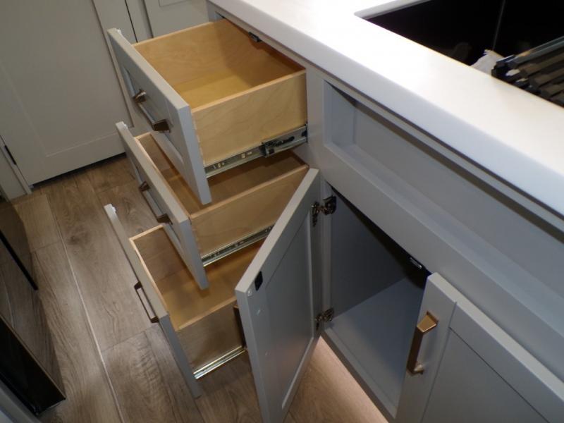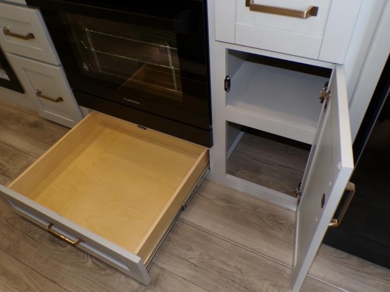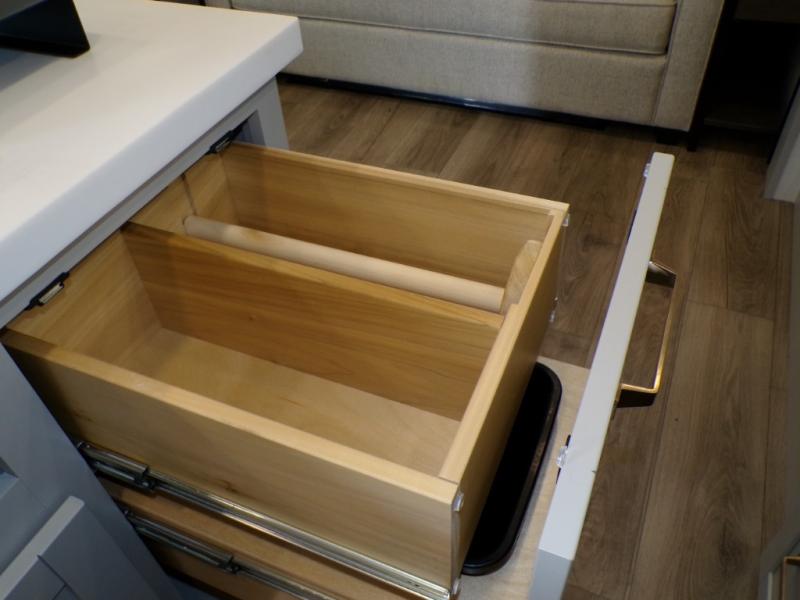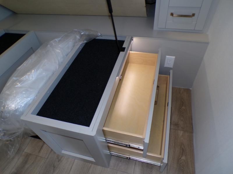 This travel trailer is spacious thanks to the dual opposing slides in the combined kitchen and living area. There is a rear 72" tri-fold sofa here, theater seating, and a sliding desk/dining table. The televator and fireplace will let you relax each evening with a movie or good book, and the full kitchen lets you make meals wherever you go. The chef of your group will also appreciate the pantry with adjustable shelving for all their ingredients, a hutch, 30" residential microwave, and even a pull-out trash bin for easy clean-up. When you're ready to call it a night, the front private bedroom will be waiting for you. This room includes a queen bed with four underbed drawers, a closet with pass-thru access to the bathroom closet, plus washer and dryer prep if you want the option to go full-time!