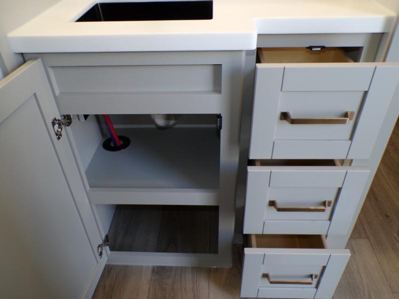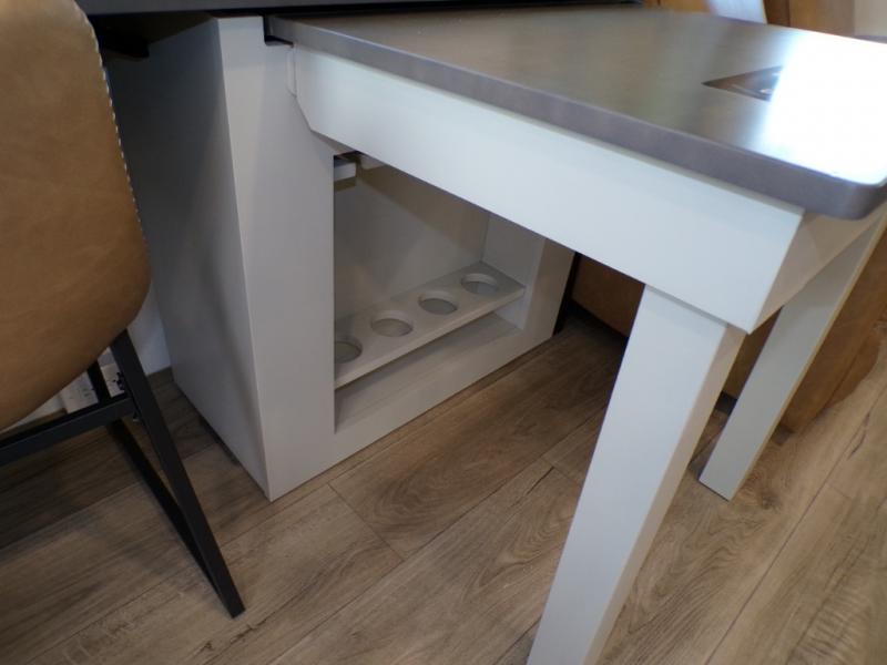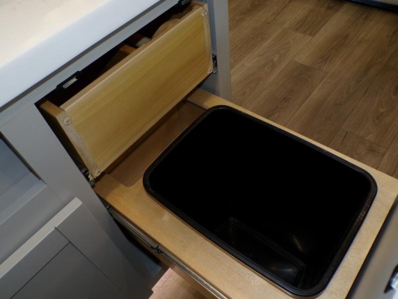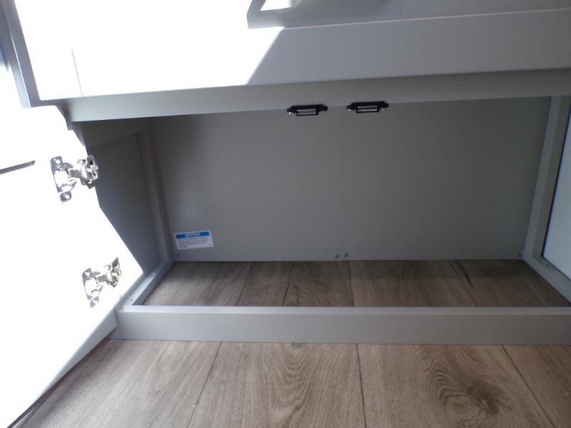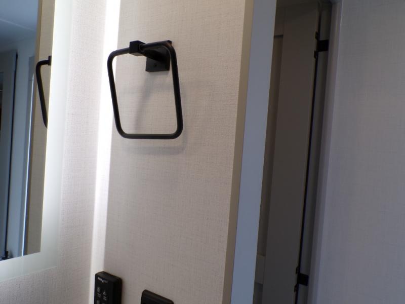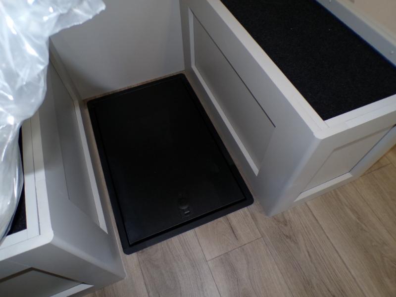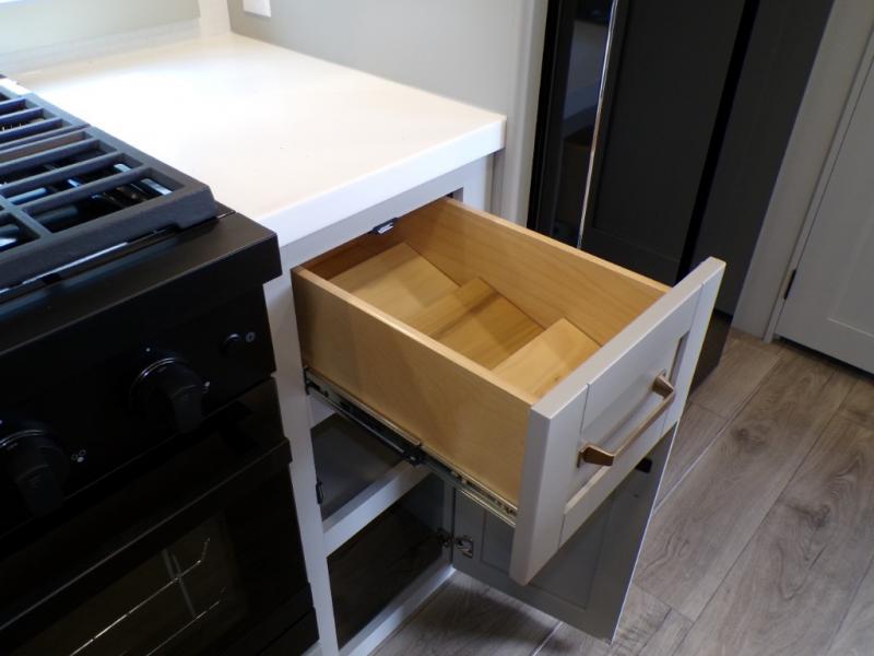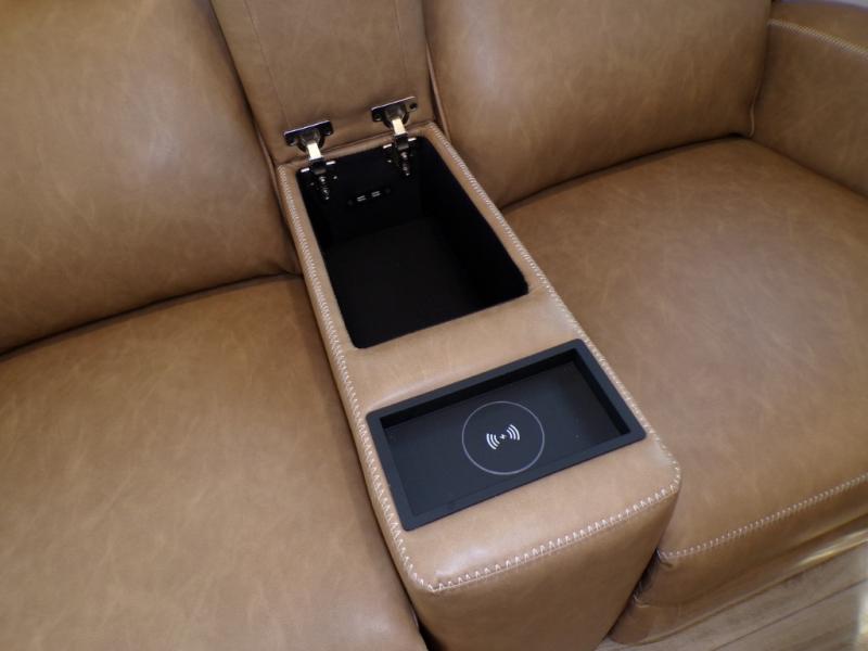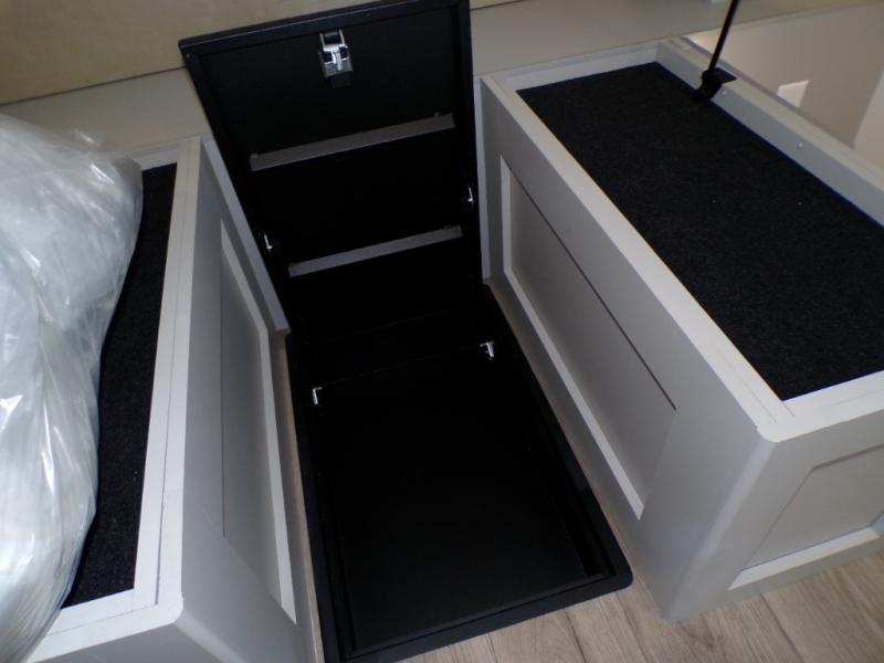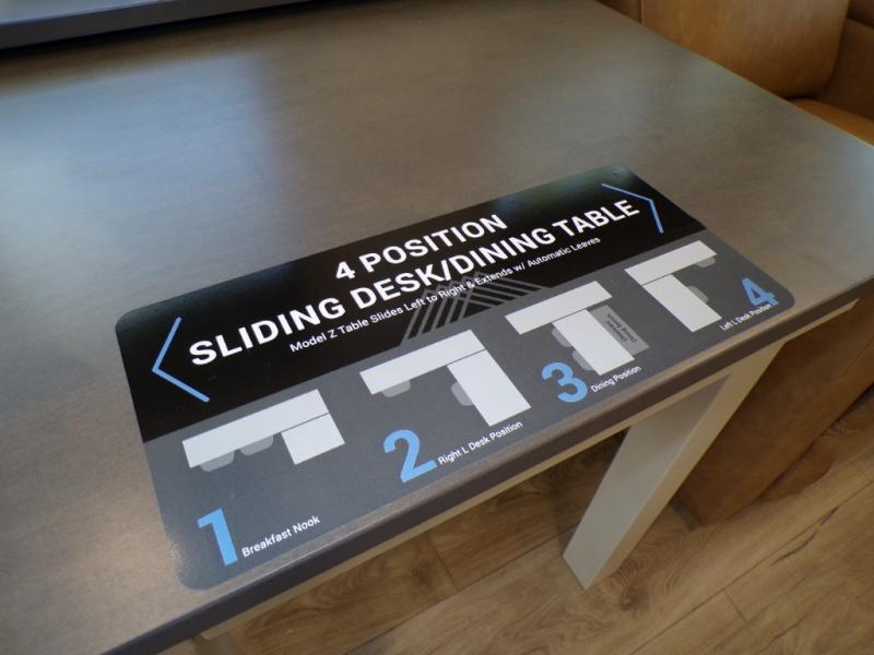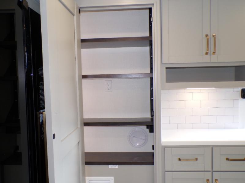 This travel trailer is spacious thanks to the dual opposing slides in the combined kitchen and living area. There is a rear 72" tri-fold sofa here, theater seating, and a sliding desk/dining table. The televator and fireplace will let you relax each evening with a movie or good book, and the full kitchen lets you make meals wherever you go. The chef of your group will also appreciate the pantry with adjustable shelving for all their ingredients, a hutch, 30" residential microwave, and even a pull-out trash bin for easy clean-up. When you're ready to call it a night, the front private bedroom will be waiting for you. This room includes a queen bed with four underbed drawers, a closet with pass-thru access to the bathroom closet, plus washer and dryer prep if you want the option to go full-time!