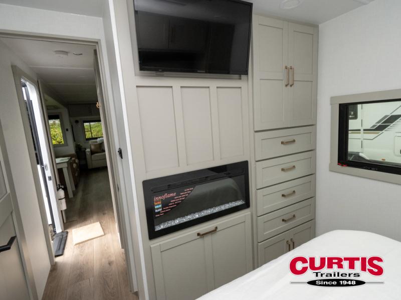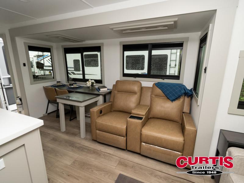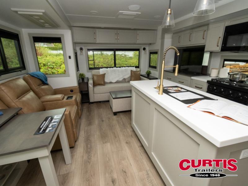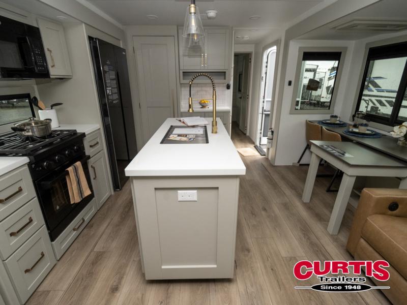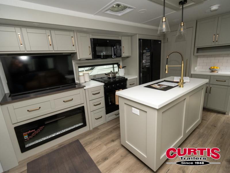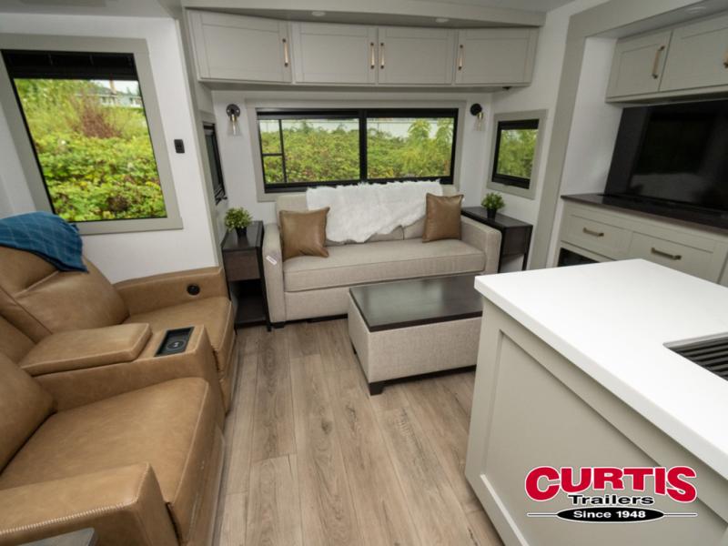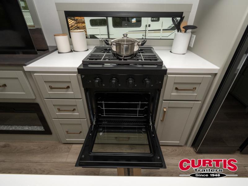 This travel trailer is spacious thanks to the dual opposing slides in the combined kitchen and living area. There is a rear 72" tri-fold sofa here, theater seating, and a sliding desk/dining table. The televator and fireplace will let you relax each evening with a movie or good book, and the full kitchen lets you make meals wherever you go. The chef of your group will also appreciate the pantry with adjustable shelving for all their ingredients, a hutch, 30" residential microwave, and even a pull-out trash bin for easy clean-up. When you're ready to call it a night, the front private bedroom will be waiting for you. This room includes a queen bed with four underbed drawers, a closet with pass-thru access to the bathroom closet, plus washer and dryer prep if you want the option to go full-time!