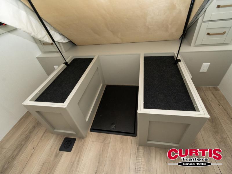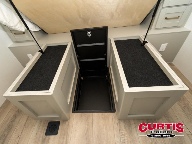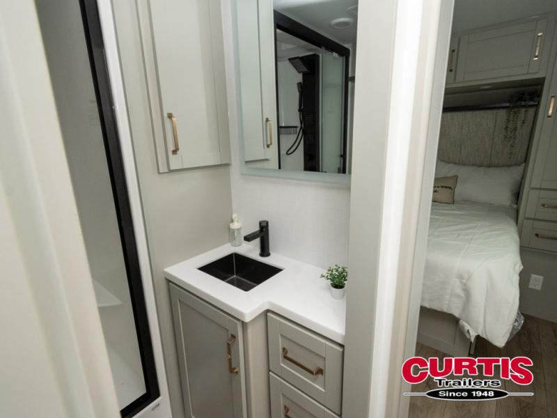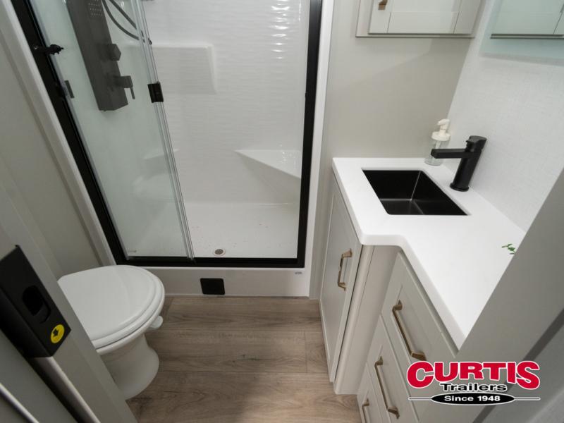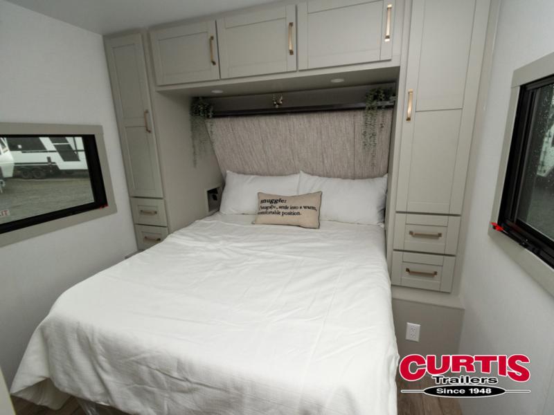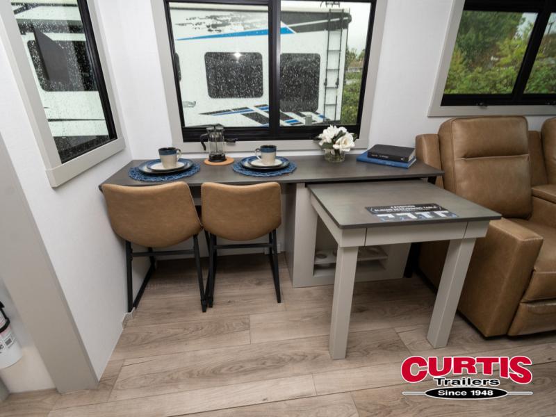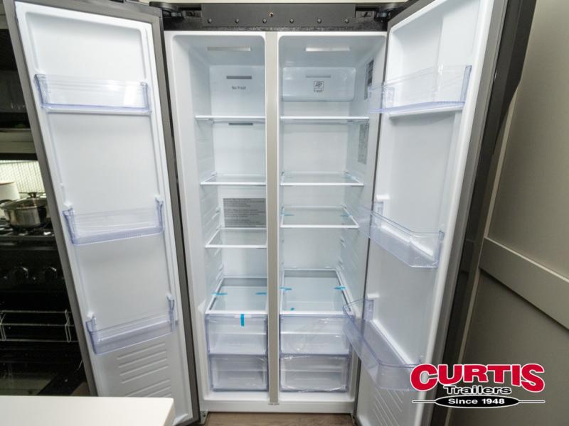 This travel trailer is spacious thanks to the dual opposing slides in the combined kitchen and living area. There is a rear 72" tri-fold sofa here, theater seating, and a sliding desk/dining table. The televator and fireplace will let you relax each evening with a movie or good book, and the full kitchen lets you make meals wherever you go. The chef of your group will also appreciate the pantry with adjustable shelving for all their ingredients, a hutch, 30" residential microwave, and even a pull-out trash bin for easy clean-up. When you're ready to call it a night, the front private bedroom will be waiting for you. This room includes a queen bed with four underbed drawers, a closet with pass-thru access to the bathroom closet, plus washer and dryer prep if you want the option to go full-time!