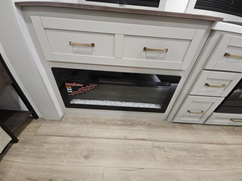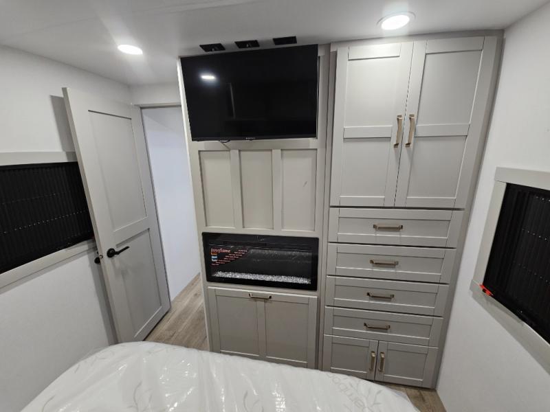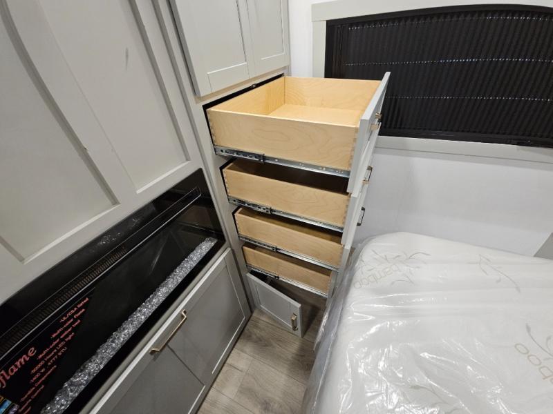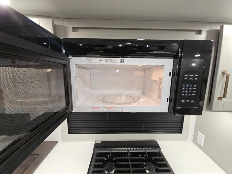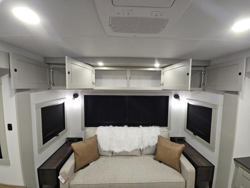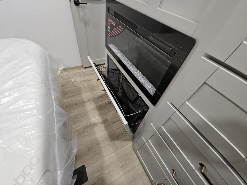 This travel trailer is spacious thanks to the dual opposing slides in the combined kitchen and living area. There is a rear 72" tri-fold sofa here, theater seating, and a sliding desk/dining table. The televator and fireplace will let you relax each evening with a movie or good book, and the full kitchen lets you make meals wherever you go. The chef of your group will also appreciate the pantry with adjustable shelving for all their ingredients, a hutch, 30" residential microwave, and even a pull-out trash bin for easy clean-up. When you're ready to call it a night, the front private bedroom will be waiting for you. This room includes a queen bed with four underbed drawers, a closet with pass-thru access to the bathroom closet, plus washer and dryer prep if you want the option to go full-time!