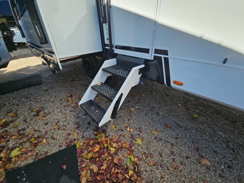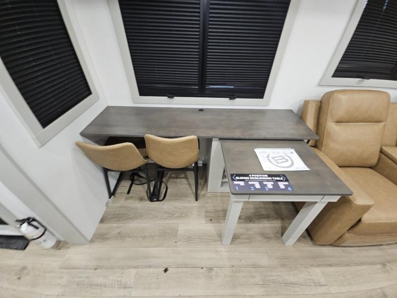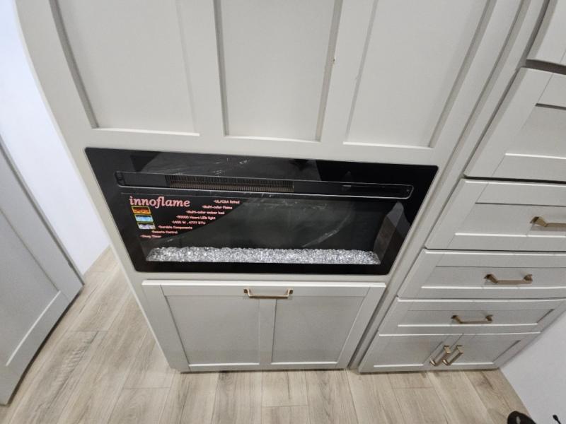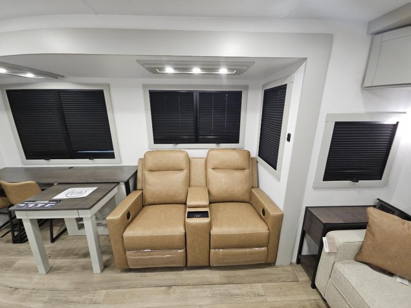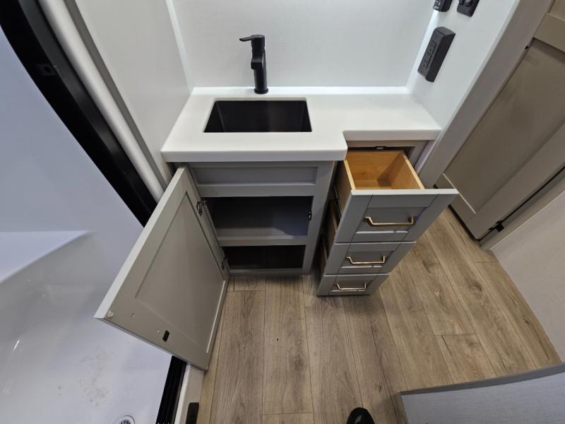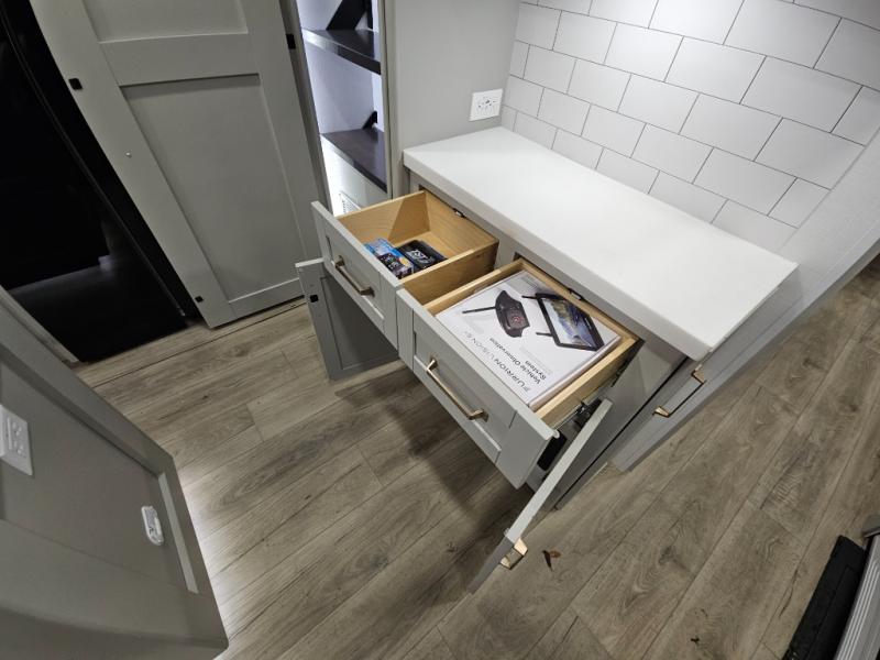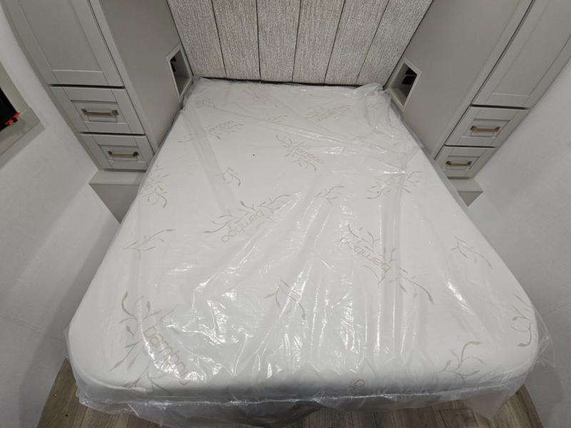 This travel trailer is spacious thanks to the dual opposing slides in the combined kitchen and living area. There is a rear 72" tri-fold sofa here, theater seating, and a sliding desk/dining table. The televator and fireplace will let you relax each evening with a movie or good book, and the full kitchen lets you make meals wherever you go. The chef of your group will also appreciate the pantry with adjustable shelving for all their ingredients, a hutch, 30" residential microwave, and even a pull-out trash bin for easy clean-up. When you're ready to call it a night, the front private bedroom will be waiting for you. This room includes a queen bed with four underbed drawers, a closet with pass-thru access to the bathroom closet, plus washer and dryer prep if you want the option to go full-time!