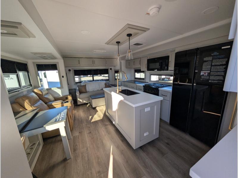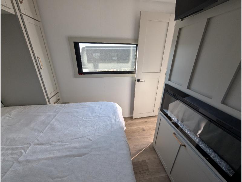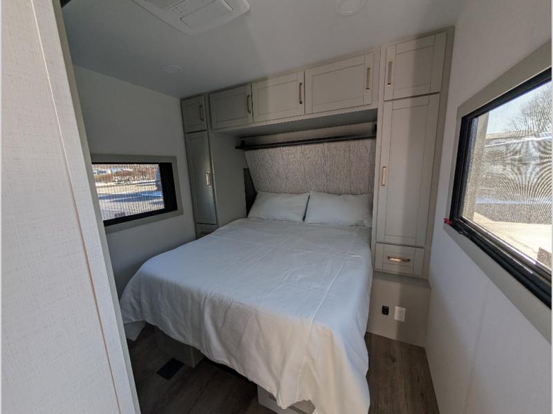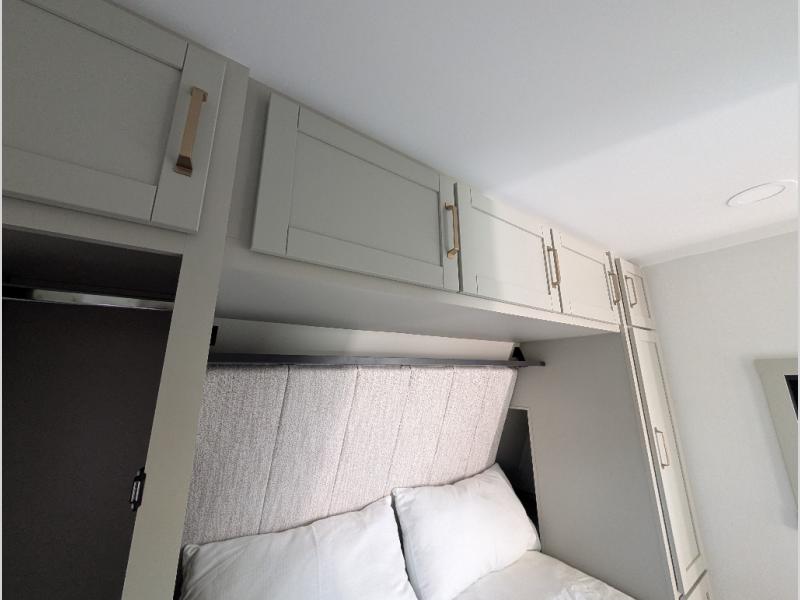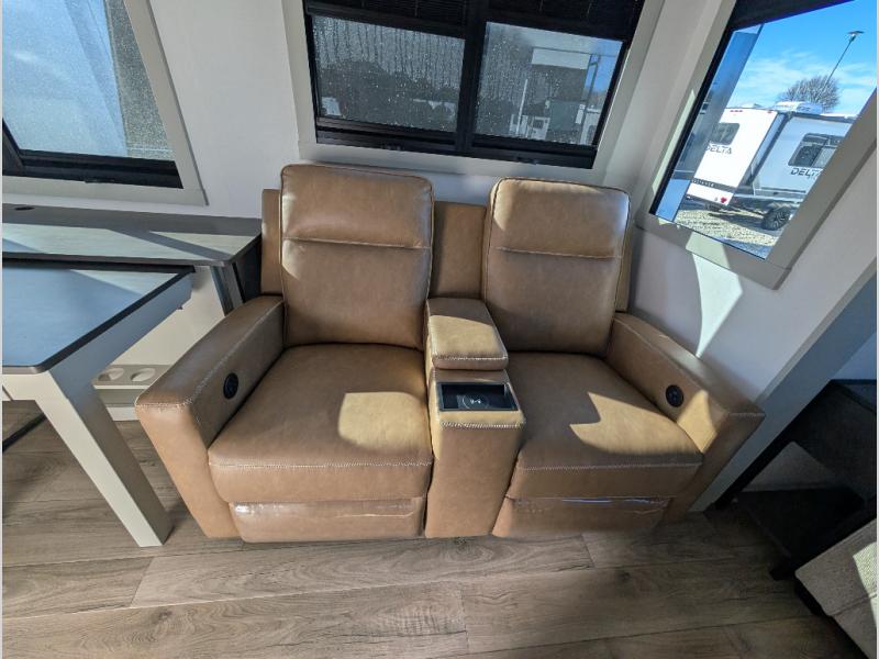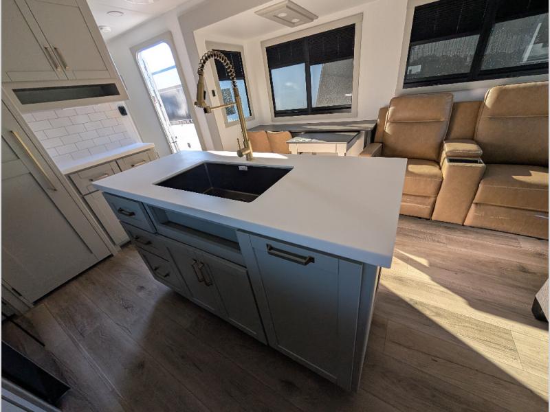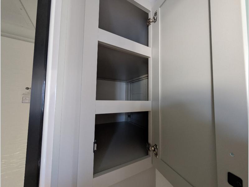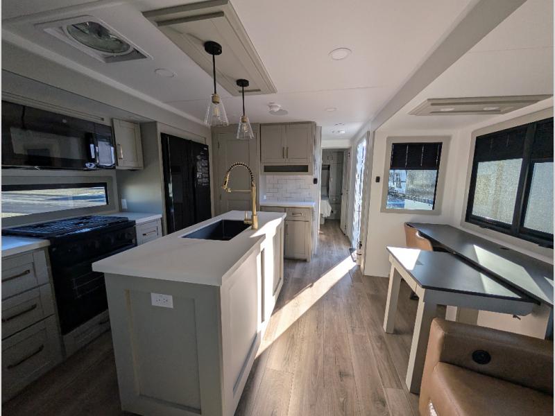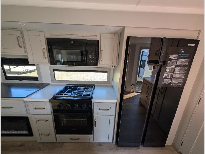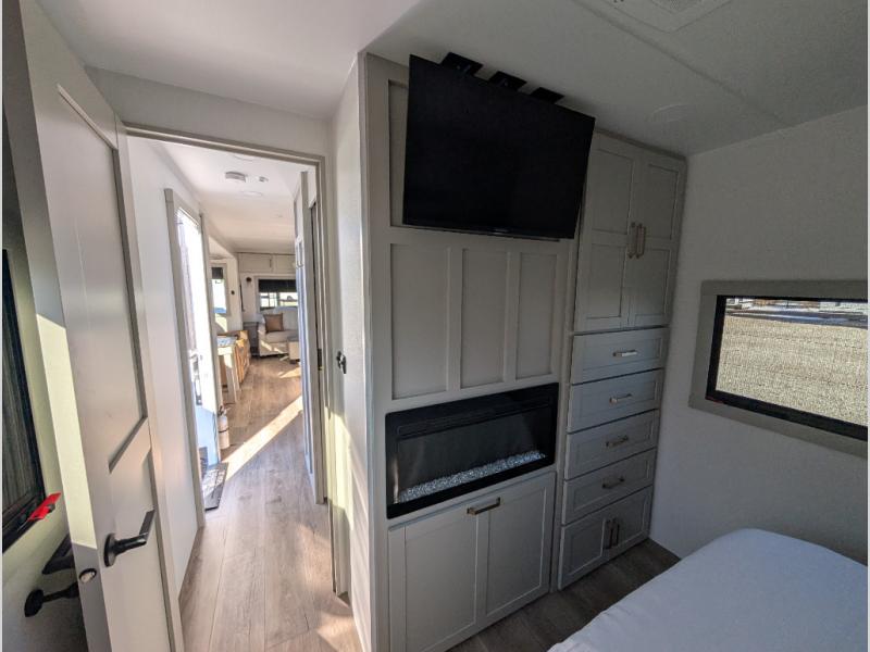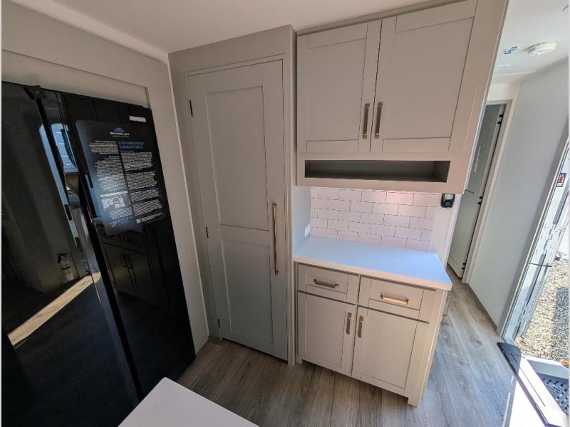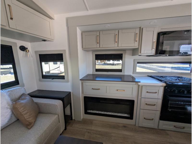 This travel trailer is spacious thanks to the dual opposing slides in the combined kitchen and living area. There is a rear 72" tri-fold sofa here, theater seating, and a sliding desk/dining table. The televator and fireplace will let you relax each evening with a movie or good book, and the full kitchen lets you make meals wherever you go. The chef of your group will also appreciate the pantry with adjustable shelving for all their ingredients, a hutch, 30" residential microwave, and even a pull-out trash bin for easy clean-up. When you're ready to call it a night, the front private bedroom will be waiting for you. This room includes a queen bed with four underbed drawers, a closet with pass-thru access to the bathroom closet, plus washer and dryer prep if you want the option to go full-time!