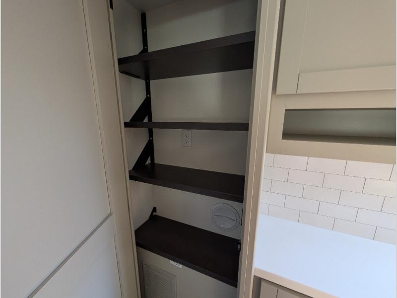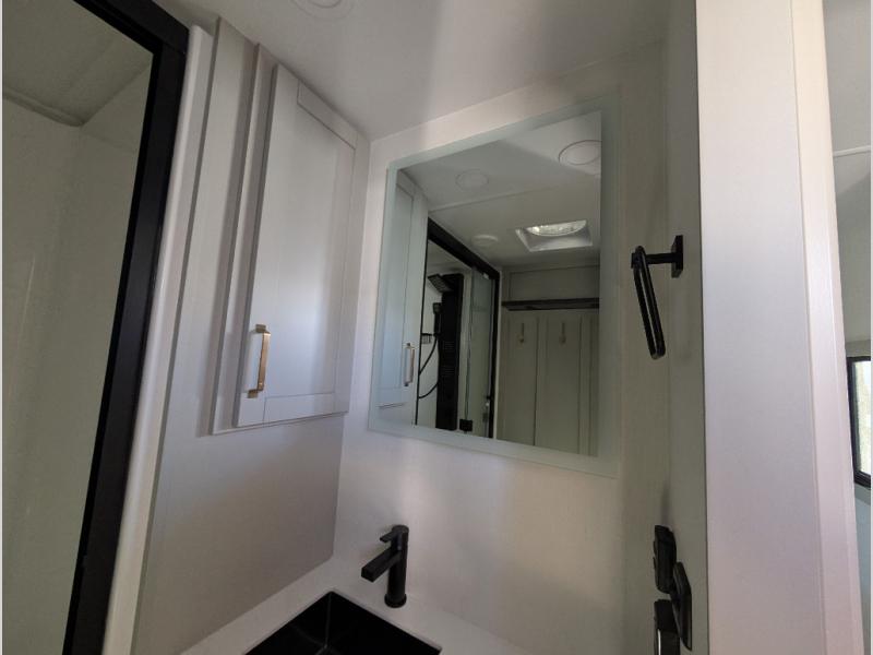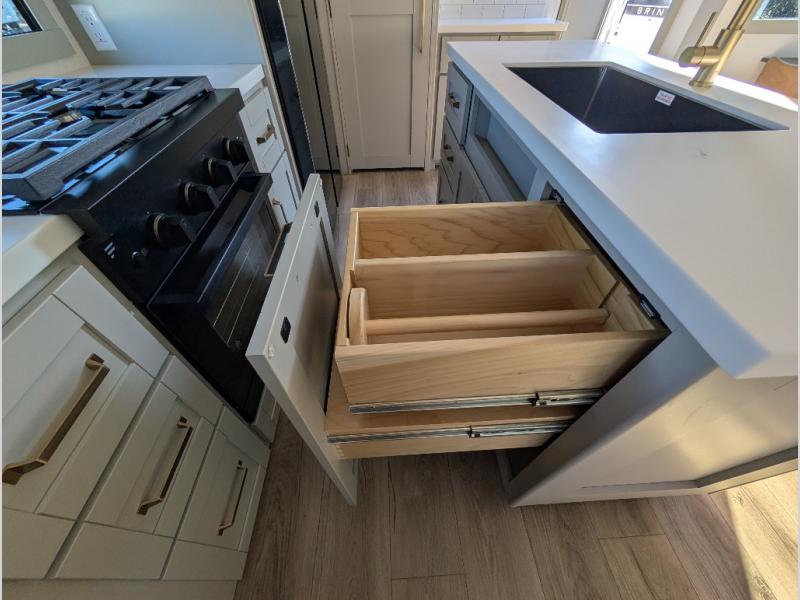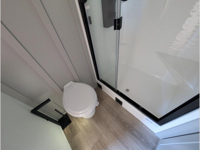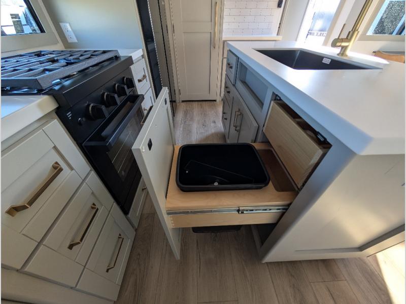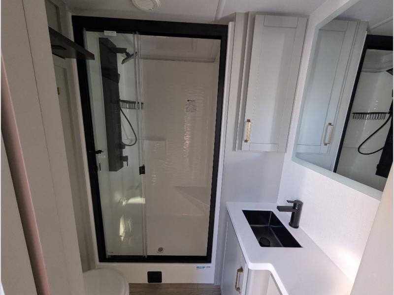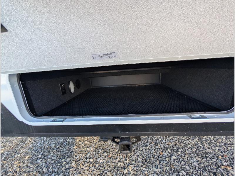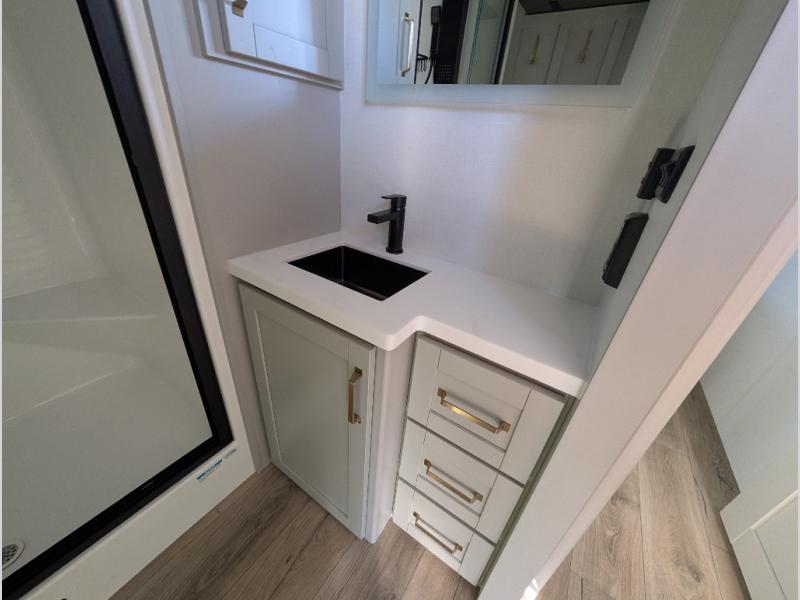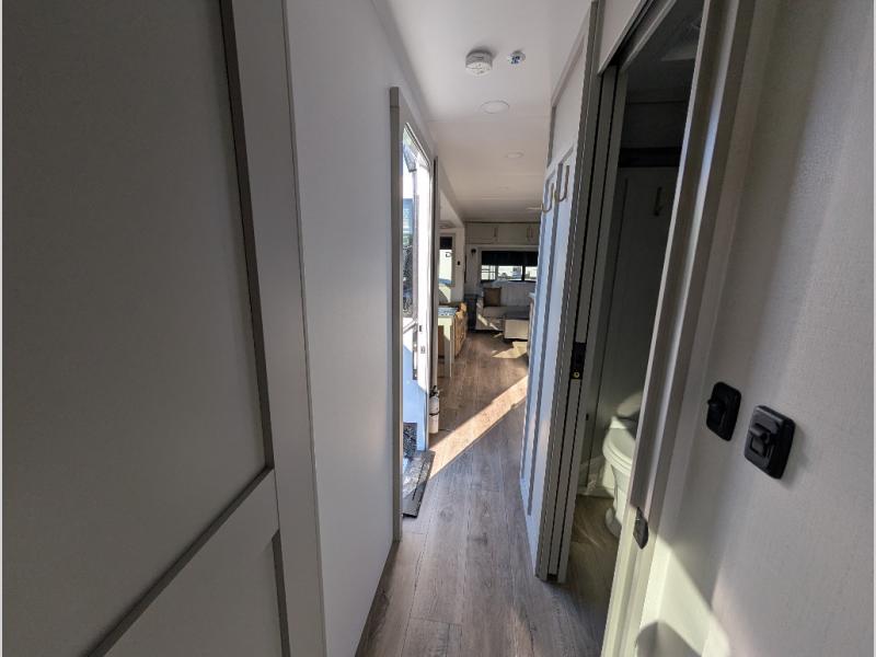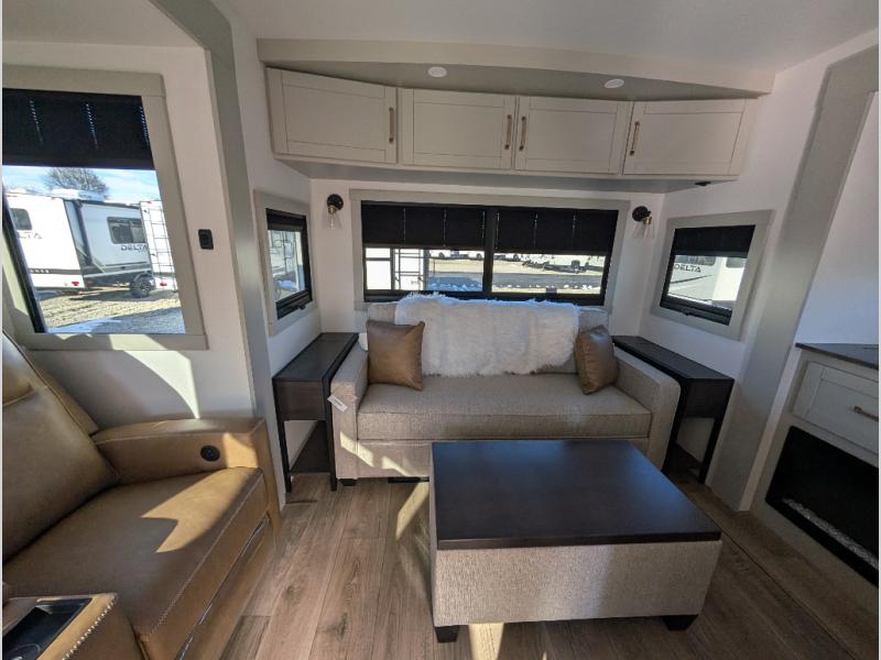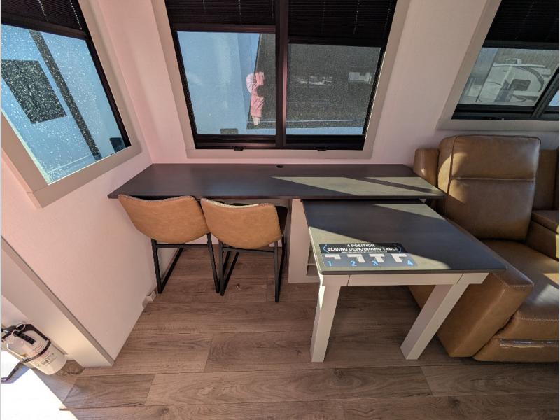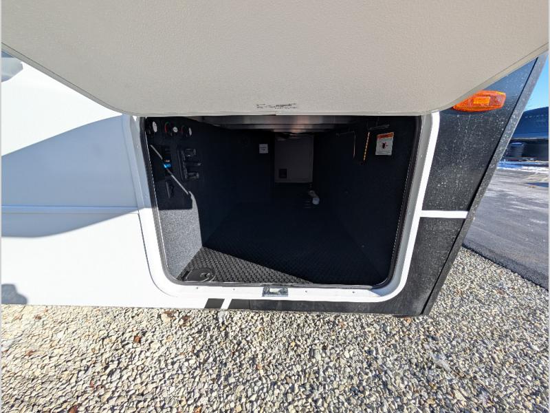 This travel trailer is spacious thanks to the dual opposing slides in the combined kitchen and living area. There is a rear 72" tri-fold sofa here, theater seating, and a sliding desk/dining table. The televator and fireplace will let you relax each evening with a movie or good book, and the full kitchen lets you make meals wherever you go. The chef of your group will also appreciate the pantry with adjustable shelving for all their ingredients, a hutch, 30" residential microwave, and even a pull-out trash bin for easy clean-up. When you're ready to call it a night, the front private bedroom will be waiting for you. This room includes a queen bed with four underbed drawers, a closet with pass-thru access to the bathroom closet, plus washer and dryer prep if you want the option to go full-time!