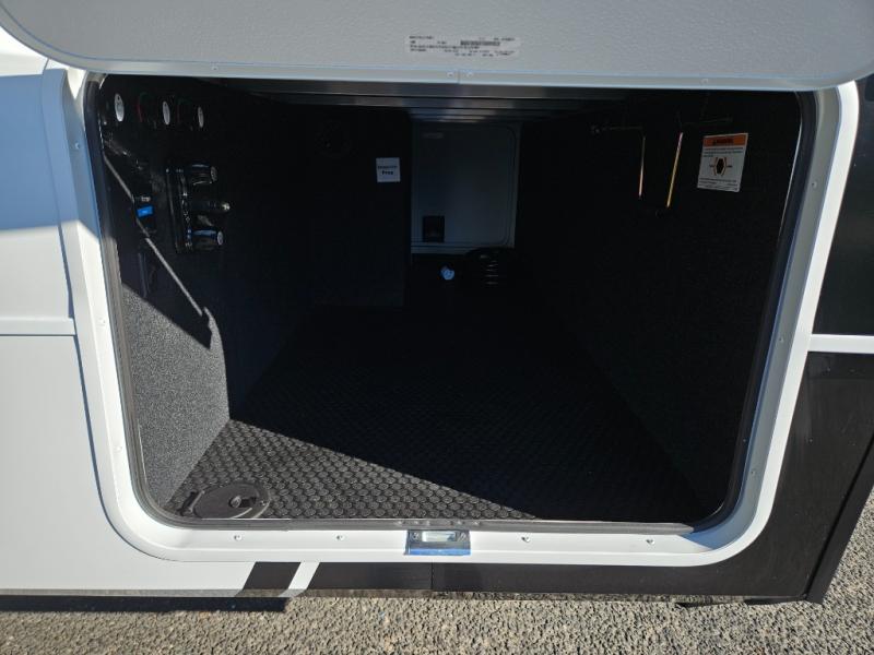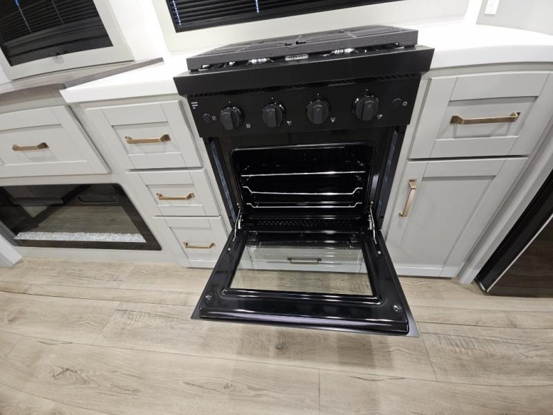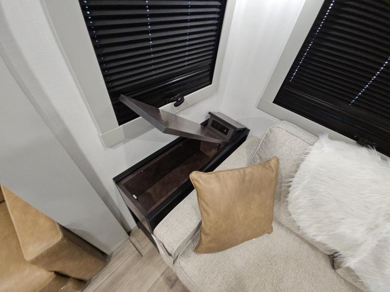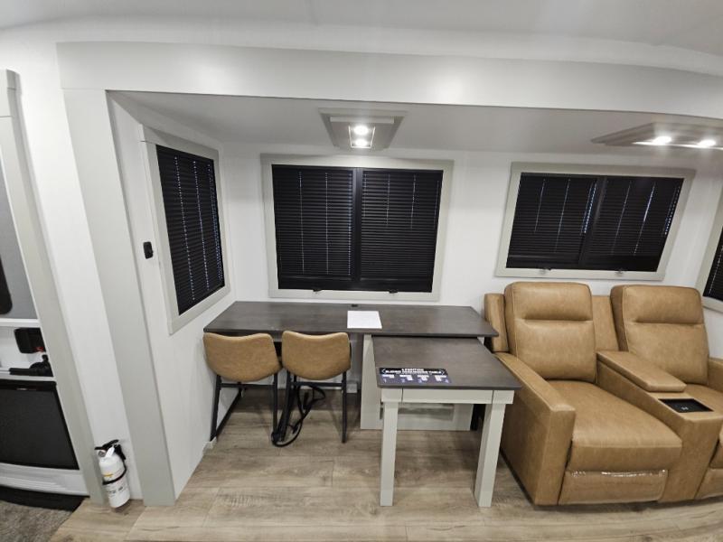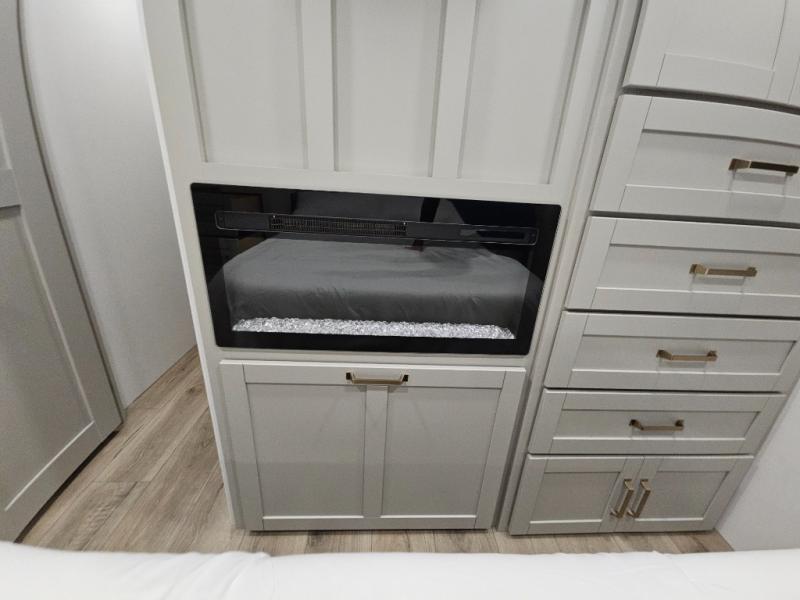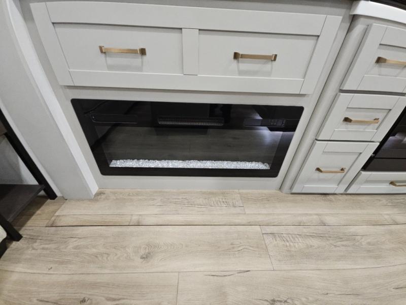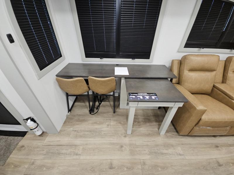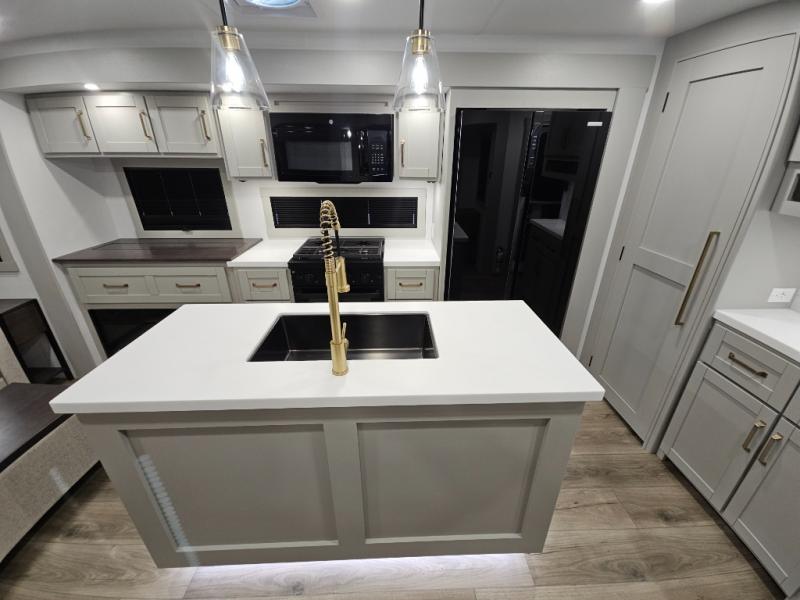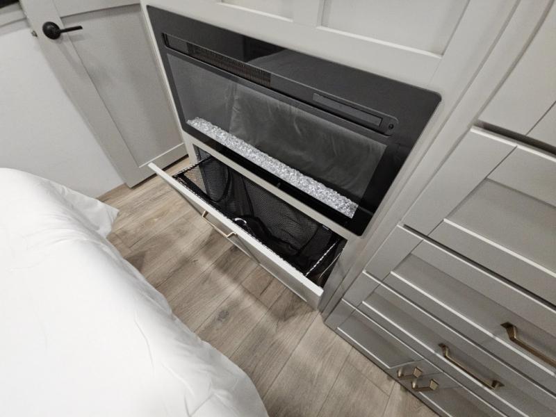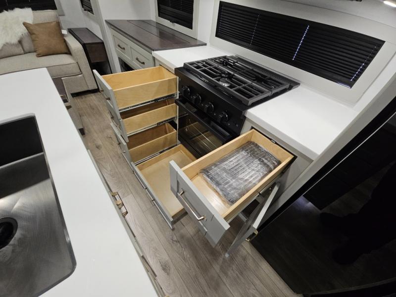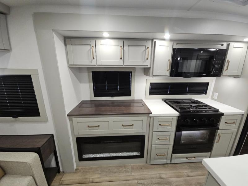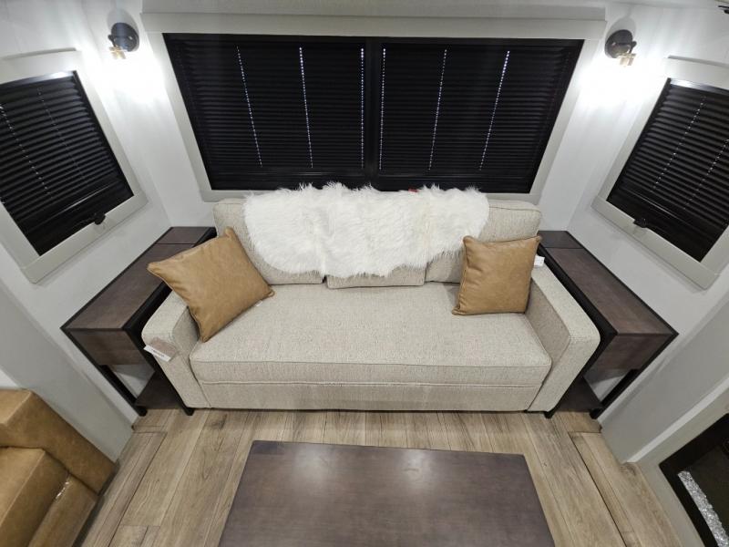 This travel trailer is spacious thanks to the dual opposing slides in the combined kitchen and living area. There is a rear 72" tri-fold sofa here, theater seating, and a sliding desk/dining table. The televator and fireplace will let you relax each evening with a movie or good book, and the full kitchen lets you make meals wherever you go. The chef of your group will also appreciate the pantry with adjustable shelving for all their ingredients, a hutch, 30" residential microwave, and even a pull-out trash bin for easy clean-up. When you're ready to call it a night, the front private bedroom will be waiting for you. This room includes a queen bed with four underbed drawers, a closet with pass-thru access to the bathroom closet, plus washer and dryer prep if you want the option to go full-time!