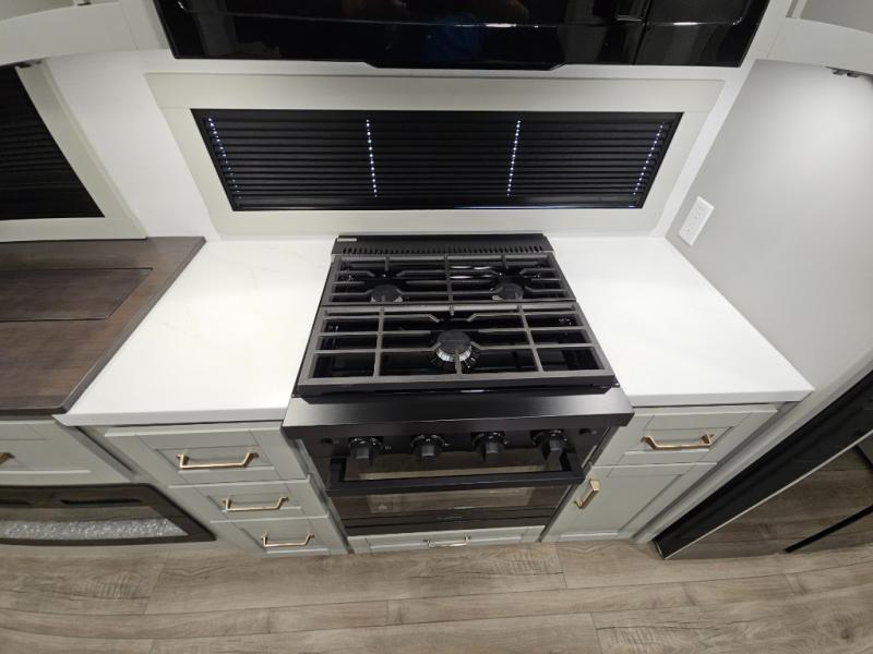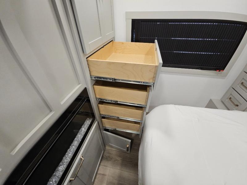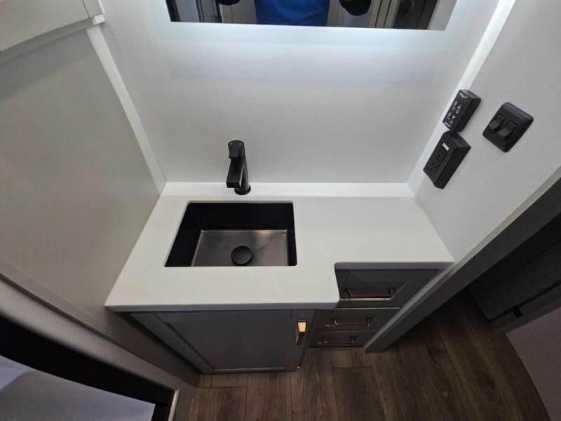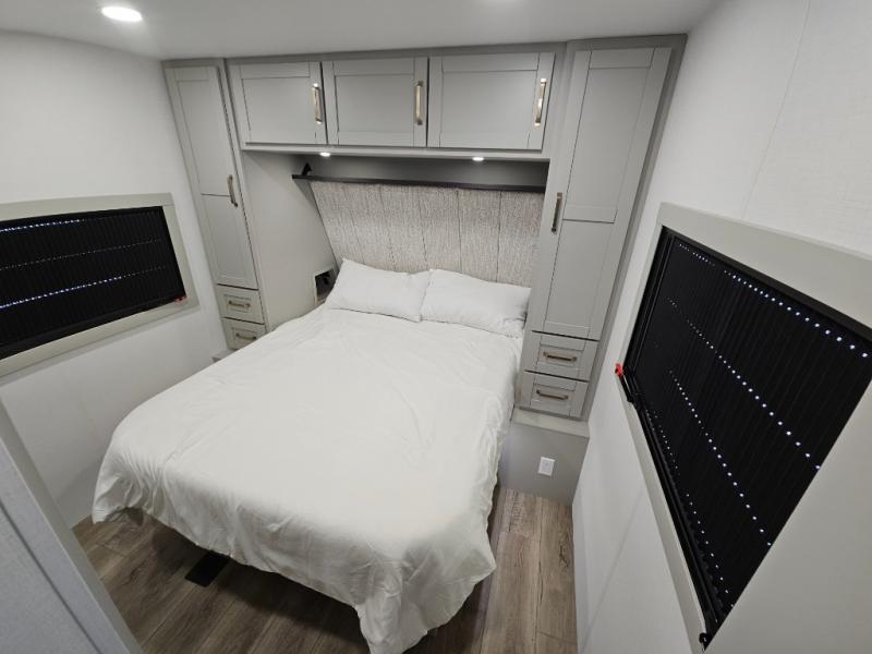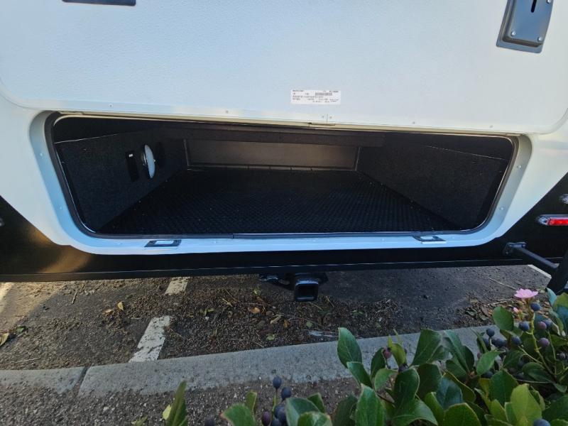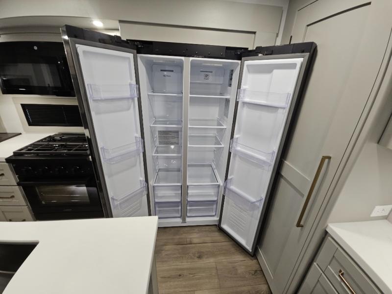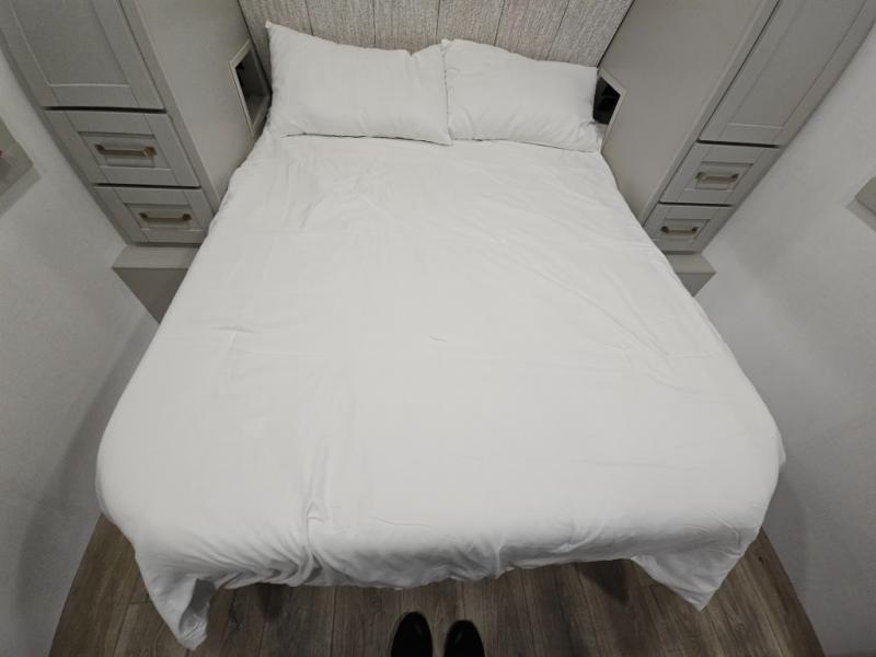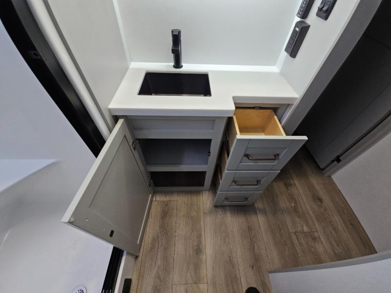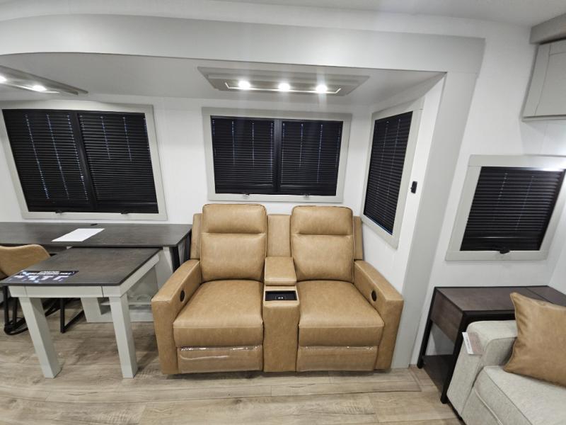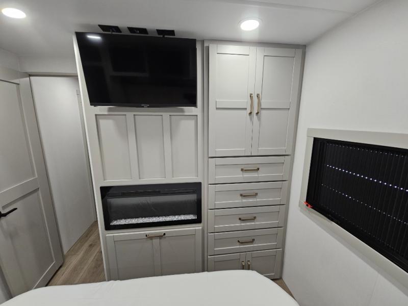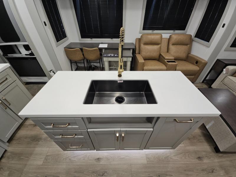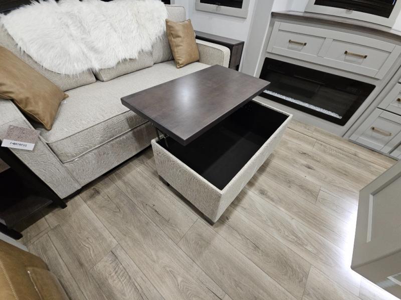 This travel trailer is spacious thanks to the dual opposing slides in the combined kitchen and living area. There is a rear 72" tri-fold sofa here, theater seating, and a sliding desk/dining table. The televator and fireplace will let you relax each evening with a movie or good book, and the full kitchen lets you make meals wherever you go. The chef of your group will also appreciate the pantry with adjustable shelving for all their ingredients, a hutch, 30" residential microwave, and even a pull-out trash bin for easy clean-up. When you're ready to call it a night, the front private bedroom will be waiting for you. This room includes a queen bed with four underbed drawers, a closet with pass-thru access to the bathroom closet, plus washer and dryer prep if you want the option to go full-time!
