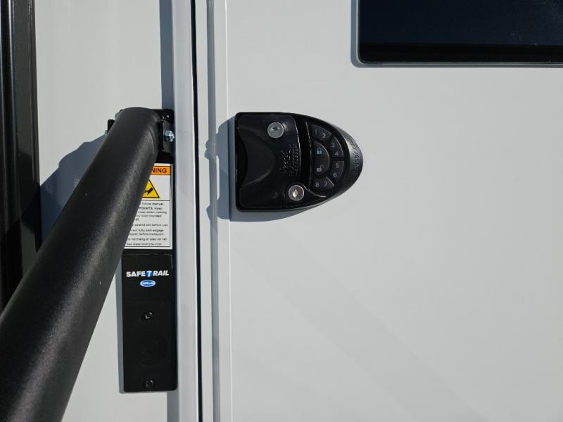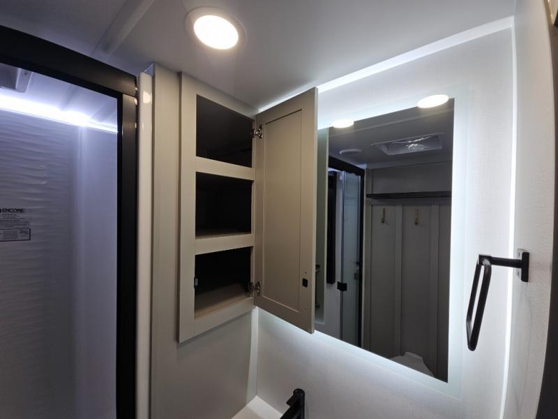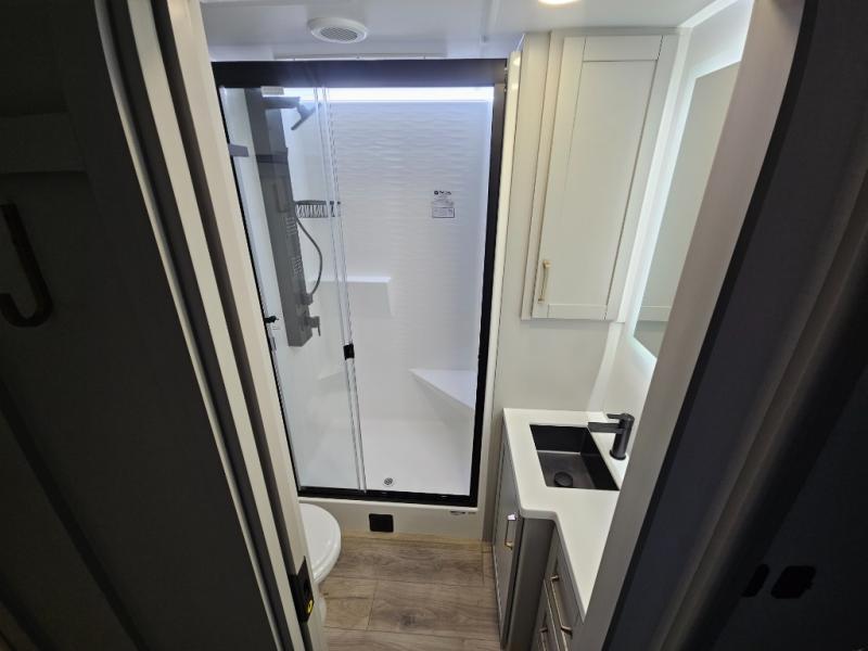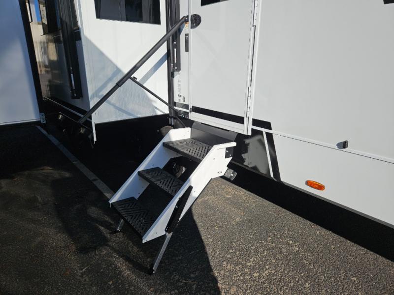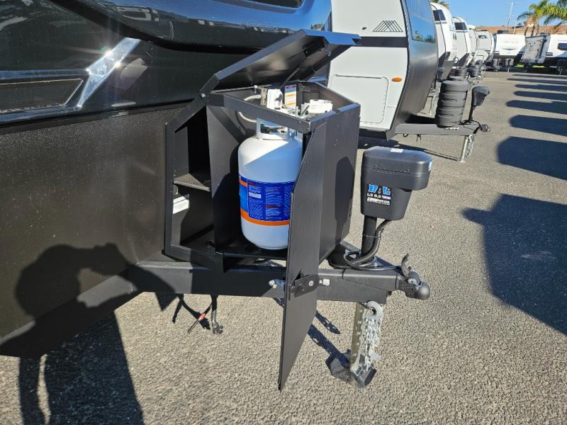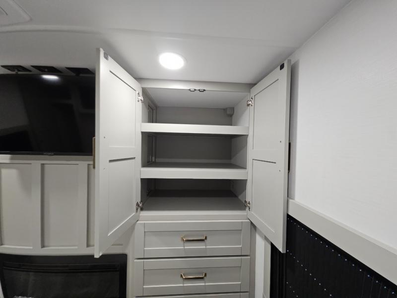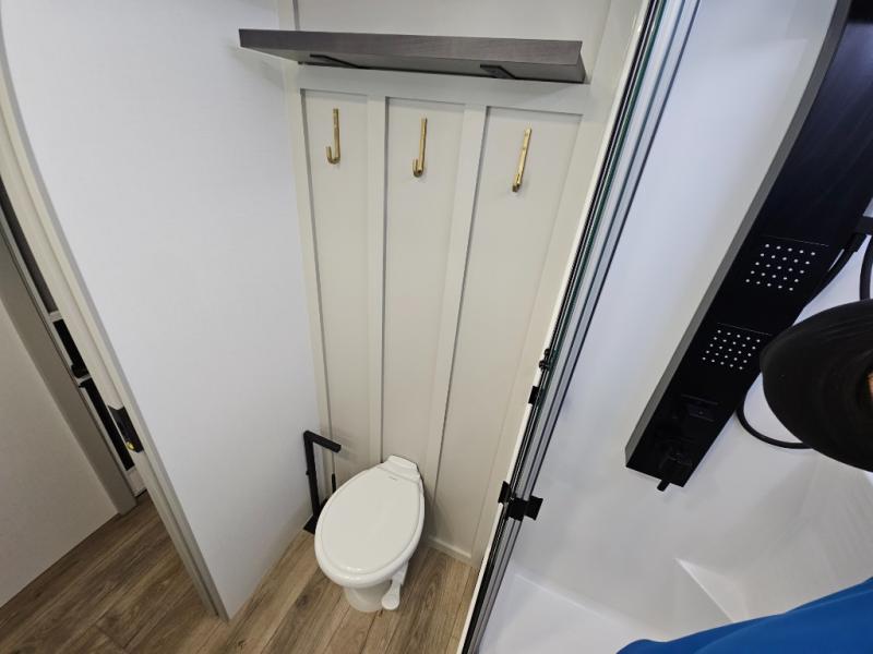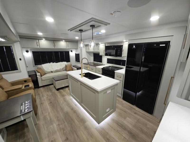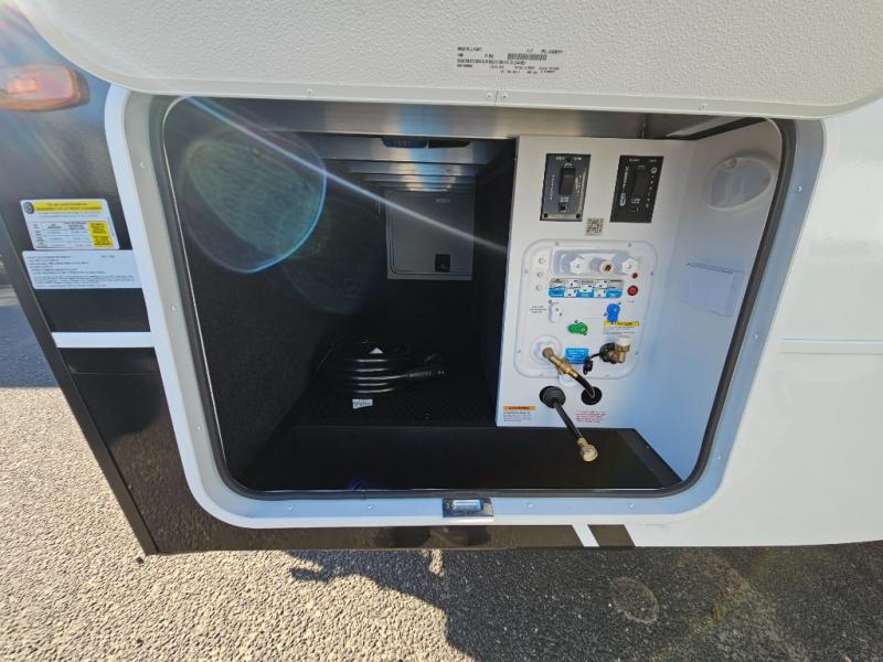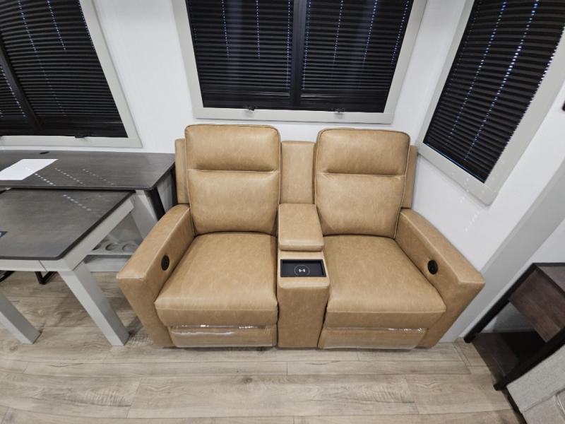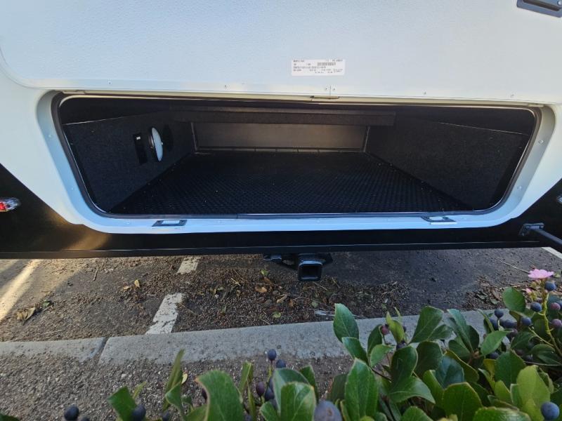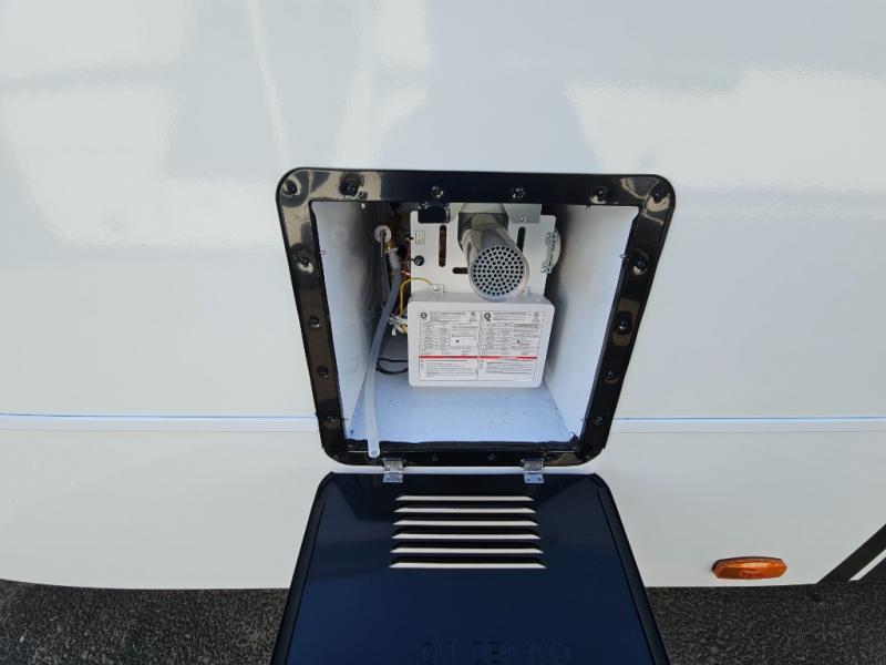 This travel trailer is spacious thanks to the dual opposing slides in the combined kitchen and living area. There is a rear 72" tri-fold sofa here, theater seating, and a sliding desk/dining table. The televator and fireplace will let you relax each evening with a movie or good book, and the full kitchen lets you make meals wherever you go. The chef of your group will also appreciate the pantry with adjustable shelving for all their ingredients, a hutch, 30" residential microwave, and even a pull-out trash bin for easy clean-up. When you're ready to call it a night, the front private bedroom will be waiting for you. This room includes a queen bed with four underbed drawers, a closet with pass-thru access to the bathroom closet, plus washer and dryer prep if you want the option to go full-time!