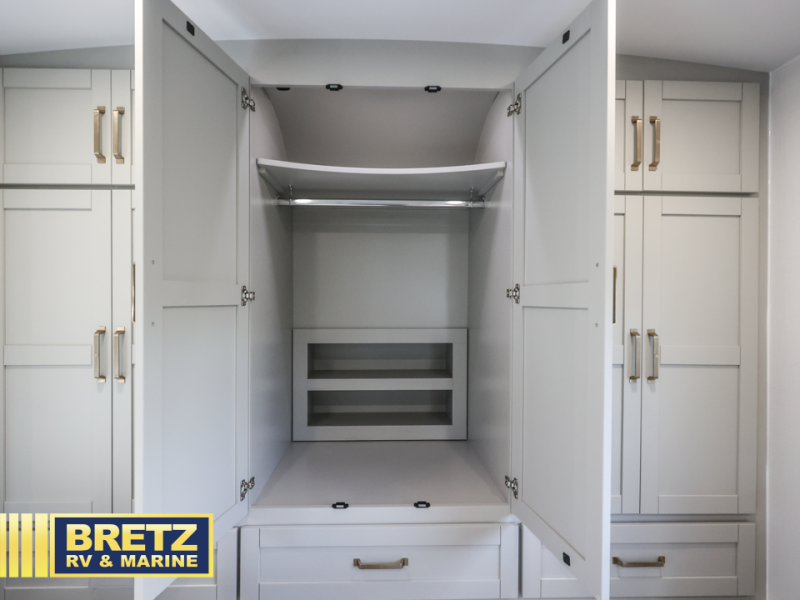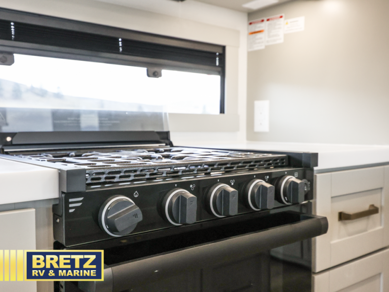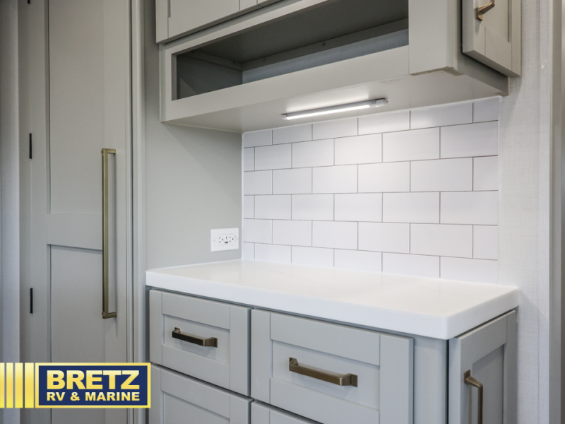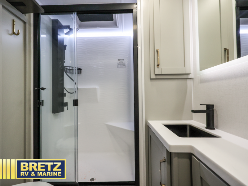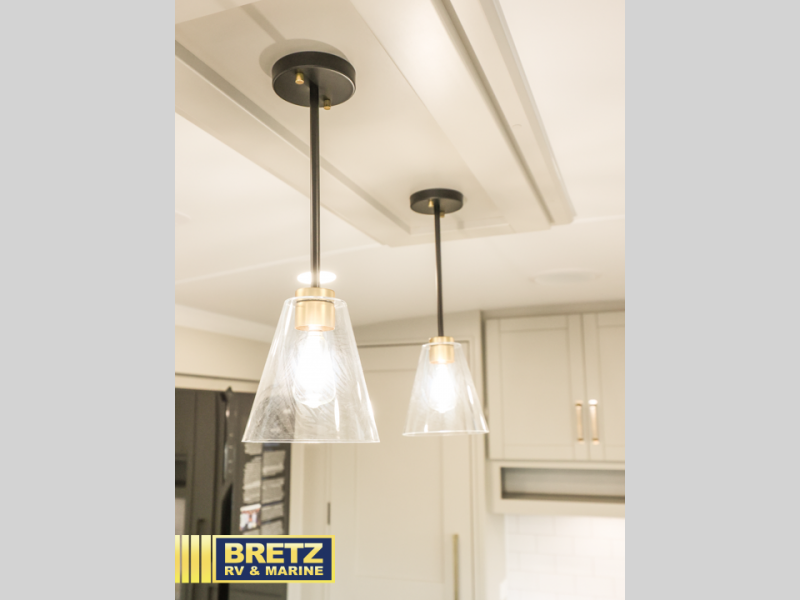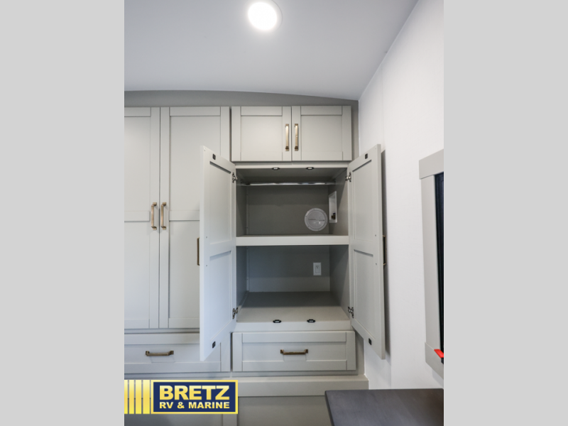 You will love all the space and features in this travel trailer! A luxurious rear living room offers plenty of room to spread out, with a 72" tri-fold sofa plus theater seats, all arranged with a perfect view of the 50" TV over the fireplace. A central kitchen area includes an island with hidden pet bowls. Find even more storage with the hutch plus pantry with adjustable shelves. The front bedroom comes with a queen bed, but if you'd like you can upgrade to a king for even more room. No matter which you choose, you will enjoy watching the 32" bedroom TV. The full-width wardrobe has room for all of your clothes and also includes prep for an optional washer and dryer. And the full bath includes a 30" x 42" one-piece fiberglass shower. Outside you'll enjoy two awnings, pass-through storage, and LED chassis lighting.
