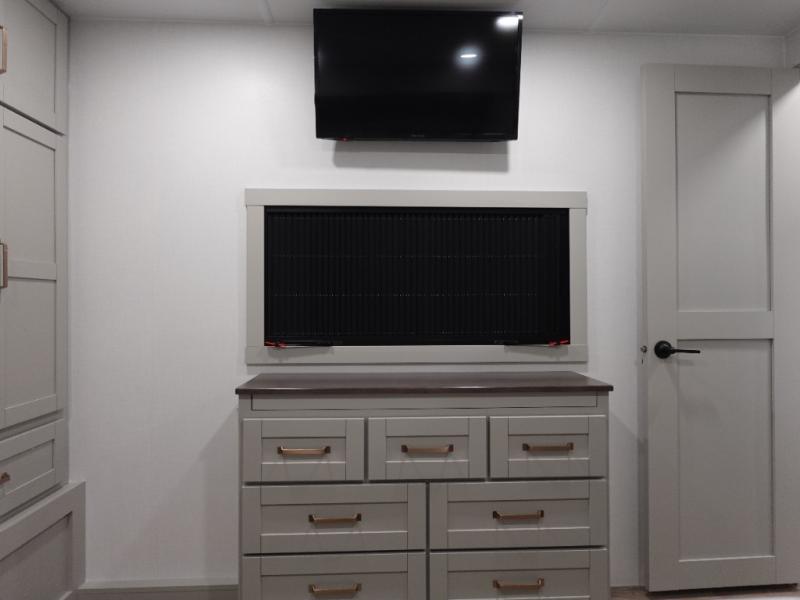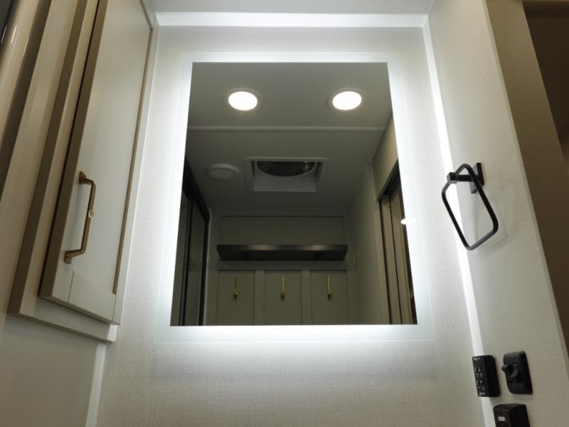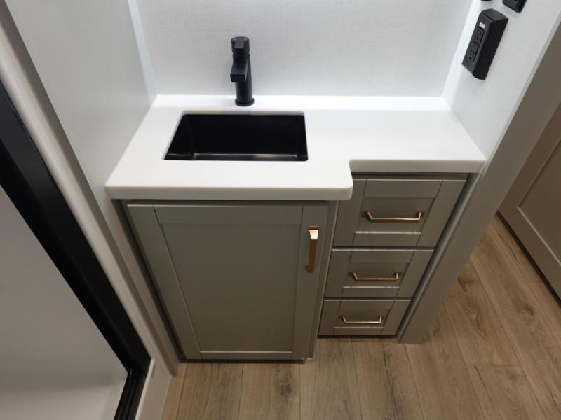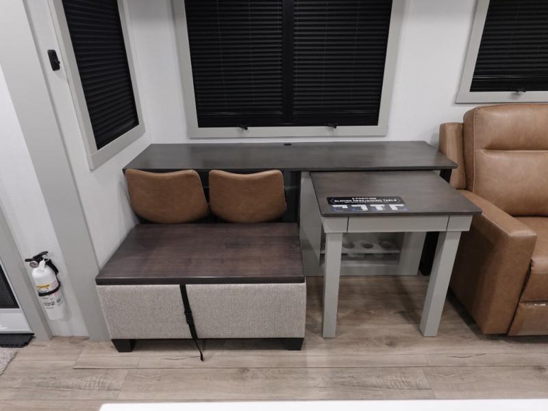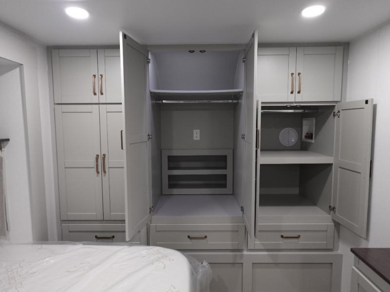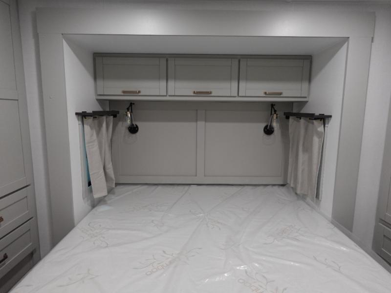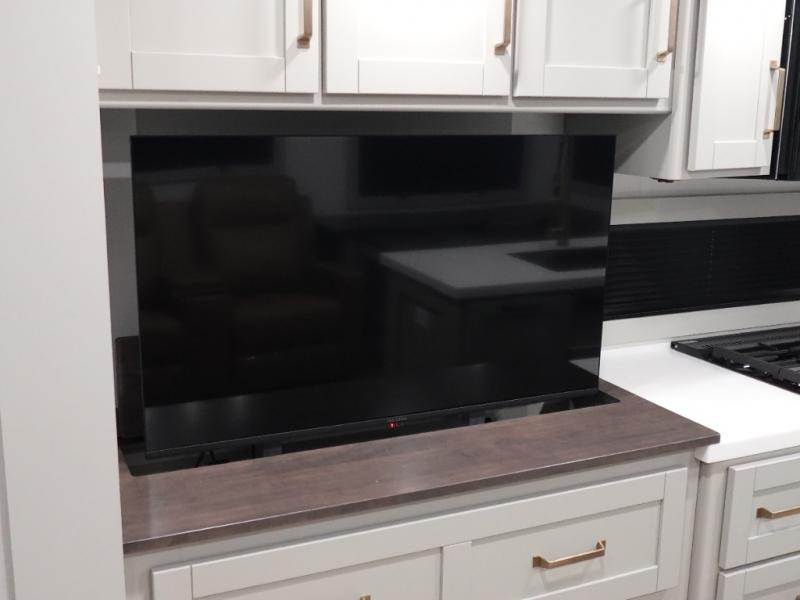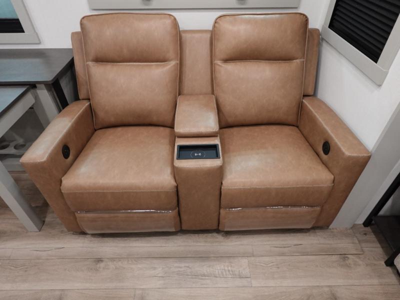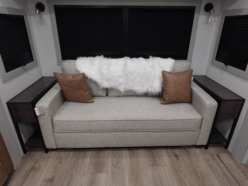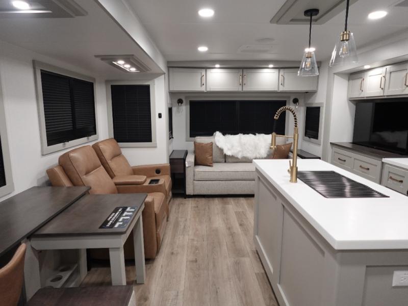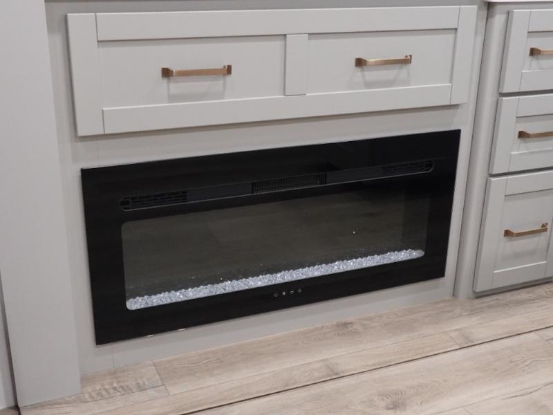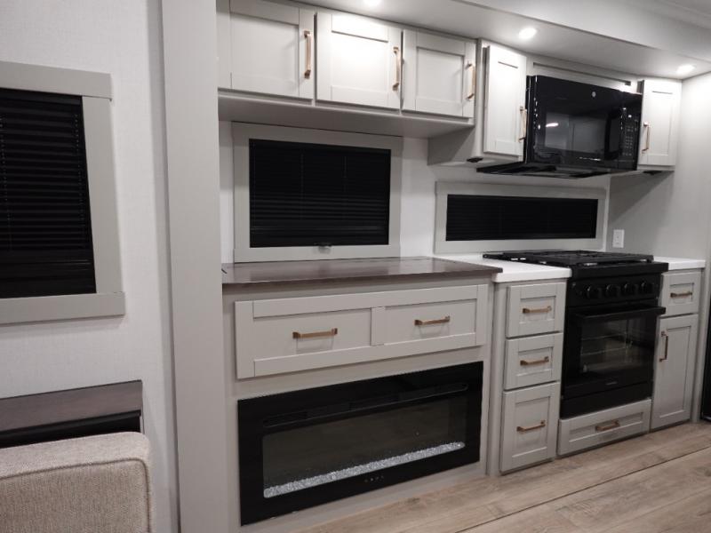You will love all the space and features in this travel trailer! A luxurious rear living room offers plenty of room to spread out, with a 72" tri-fold sofa plus theater seats, all arranged with a perfect view of the 50" TV over the fireplace. A central kitchen area includes an island with hidden pet bowls. Find even more storage with the hutch plus pantry with adjustable shelves. No matter which you choose, you will enjoy watching the 32" bedroom TV. The full-width wardrobe has room for all of your clothes. And the full bath includes a 30" x 42" one-piece fiberglass shower. Outside you'll enjoy two awnings, pass-through storage, and LED chassis lighting.