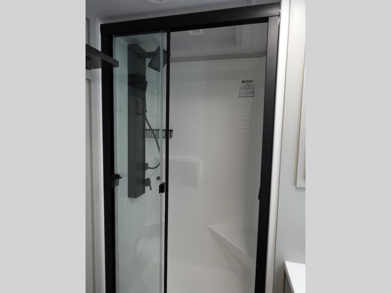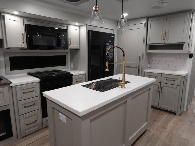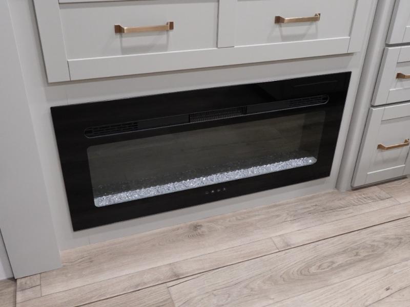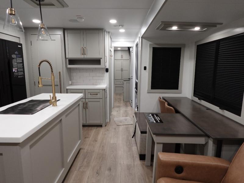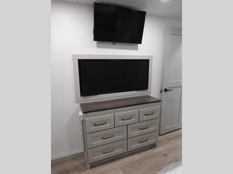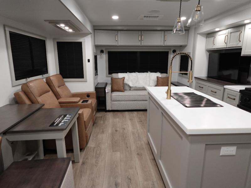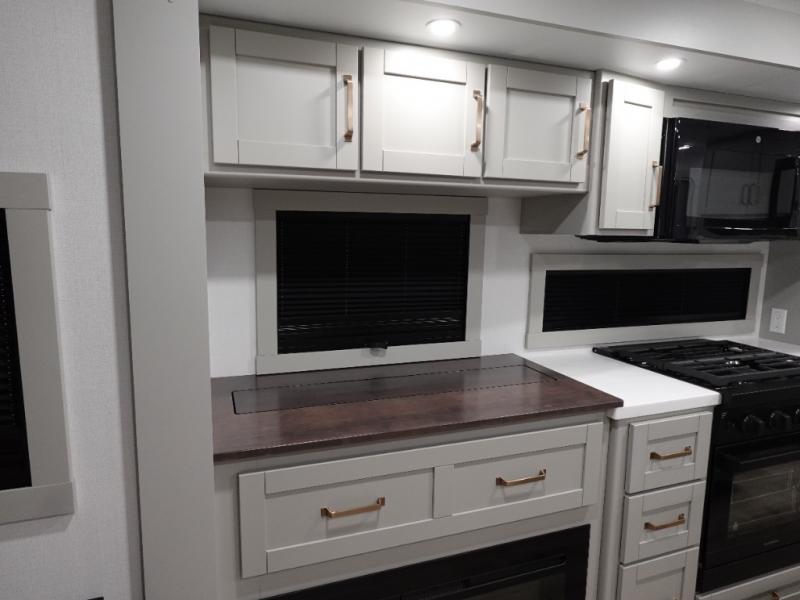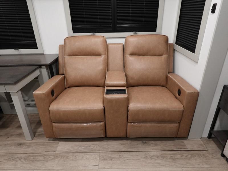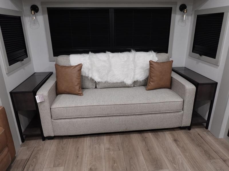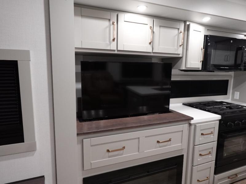You will love all the space and features in this travel trailer! A luxurious rear living room offers plenty of room to spread out, with a 72" tri-fold sofa plus theater seats, all arranged with a perfect view of the 50" TV over the fireplace. A central kitchen area includes an island with hidden pet bowls. Find even more storage with the hutch plus pantry with adjustable shelves. The front bedroom comes with a queen bed, but if you'd like you can upgrade to a king for even more room. No matter which you choose, you will enjoy watching the 32" bedroom TV. The full-width wardrobe has room for all of your clothes and also includes prep for a washer and dryer. And the full bath includes a 30" x 42" one-piece fiberglass shower. Outside you'll enjoy two awnings, pass-through storage, and LED chassis lighting.