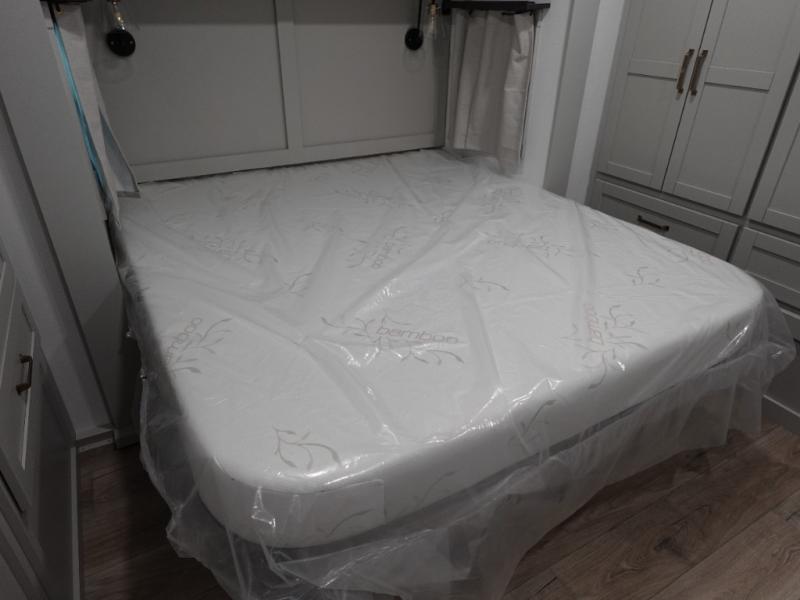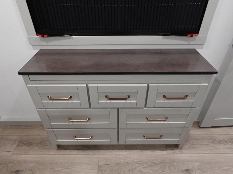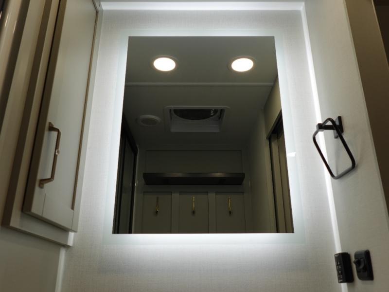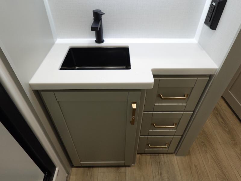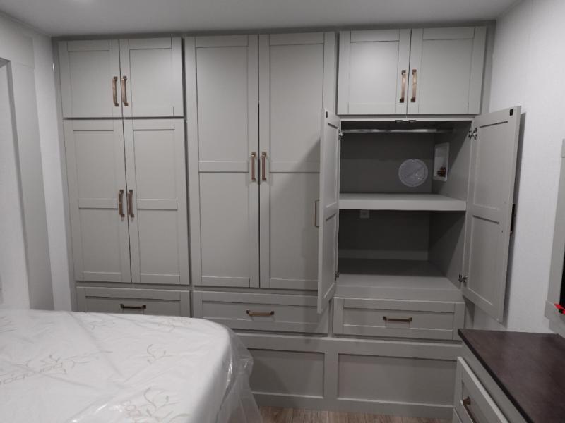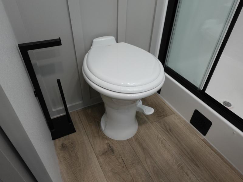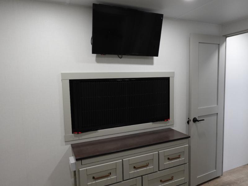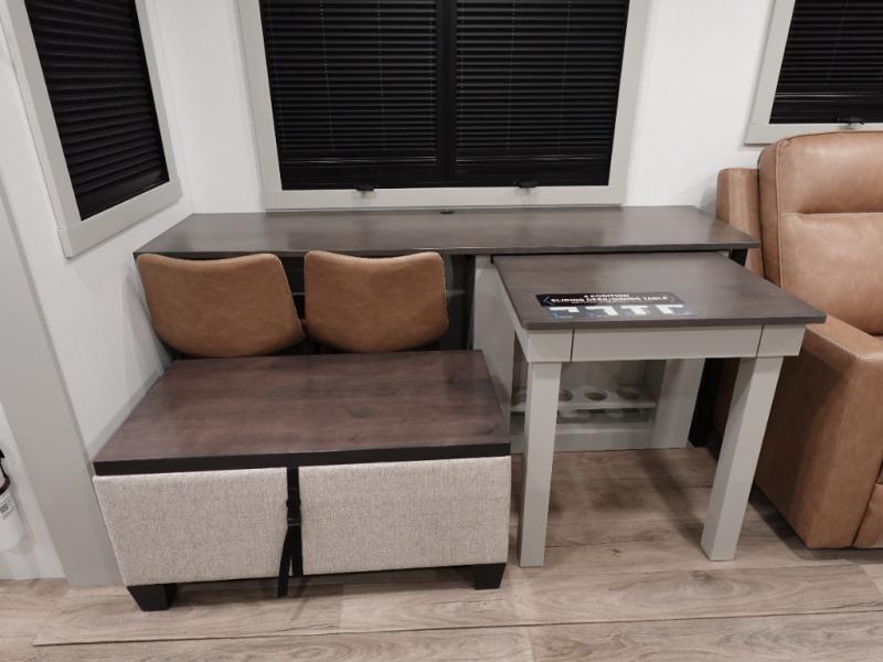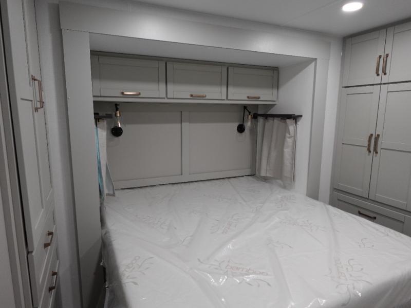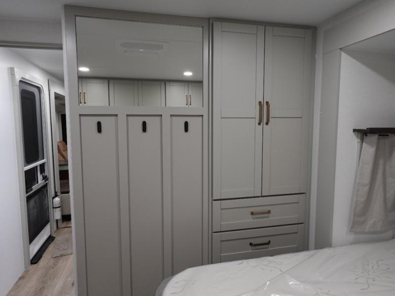 You will love all the space and features in this travel trailer! A luxurious rear living room offers plenty of room to spread out, with a 72" tri-fold sofa plus theater seats, all arranged with a perfect view of the 50" TV over the fireplace. A central kitchen area includes an island with hidden pet bowls. Find even more storage with the hutch plus pantry with adjustable shelves. The front bedroom comes with a queen bed, but if you'd like you can upgrade to a king for even more room. No matter which you choose, you will enjoy watching the 32" bedroom TV. The full-width wardrobe has room for all of your clothes and also includes prep for a washer and dryer. And the full bath includes a 30" x 42" one-piece fiberglass shower. Outside you'll enjoy two awnings, pass-through storage, and LED chassis lighting.