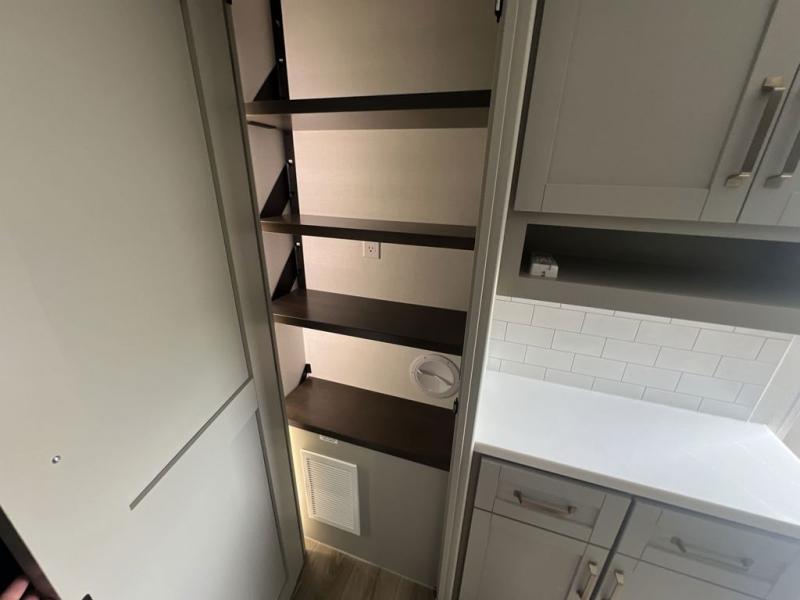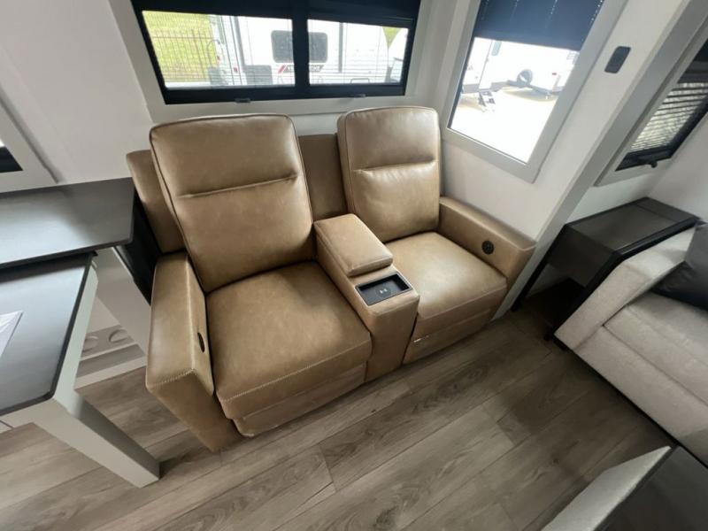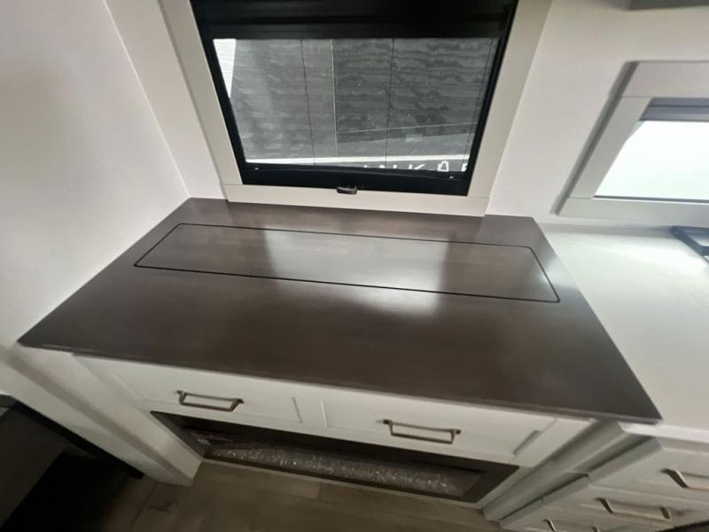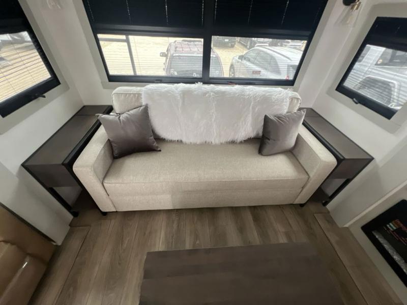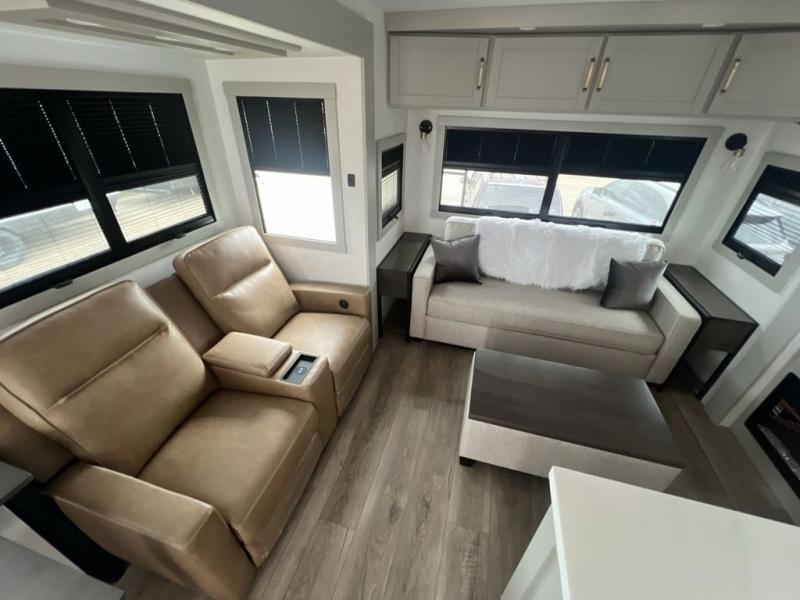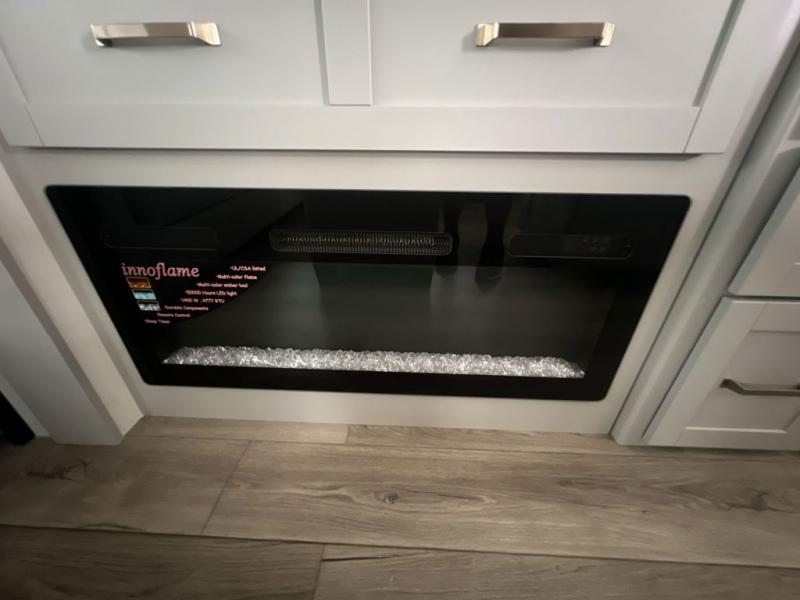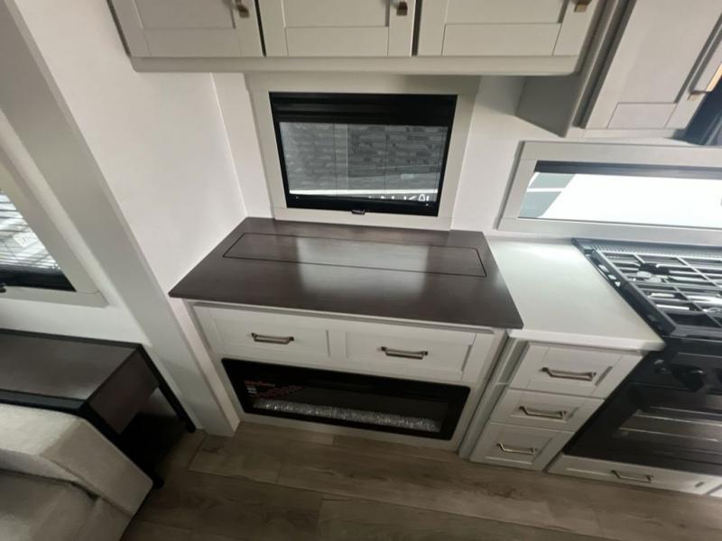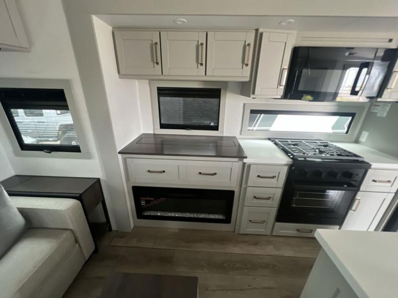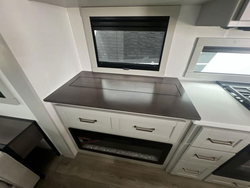 You will love all the space and features in this travel trailer! A luxurious rear living room offers plenty of room to spread out, with a 72" tri-fold sofa plus theater seats, all arranged with a perfect view of the 50" TV over the fireplace. A central kitchen area includes an island with hidden pet bowls. Find even more storage with the hutch plus pantry with adjustable shelves. The front bedroom comes with a queen bed, but if you'd like you can upgrade to a king for even more room. No matter which you choose, you will enjoy watching the 32" bedroom TV. The full-width wardrobe has room for all of your clothes and also includes prep for an optional washer and dryer. And the full bath includes a 30" x 42" one-piece fiberglass shower. Outside you'll enjoy two awnings, pass-through storage, and LED chassis lighting.