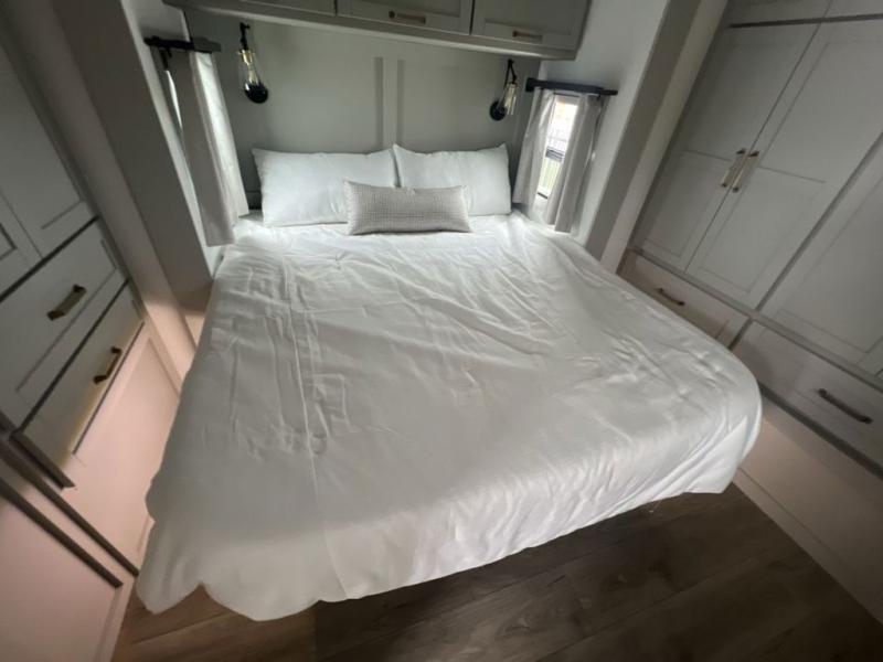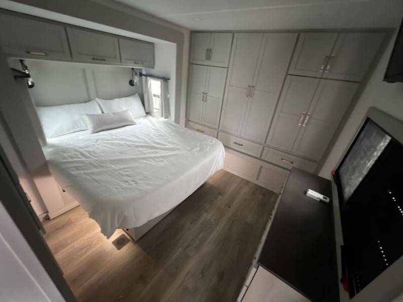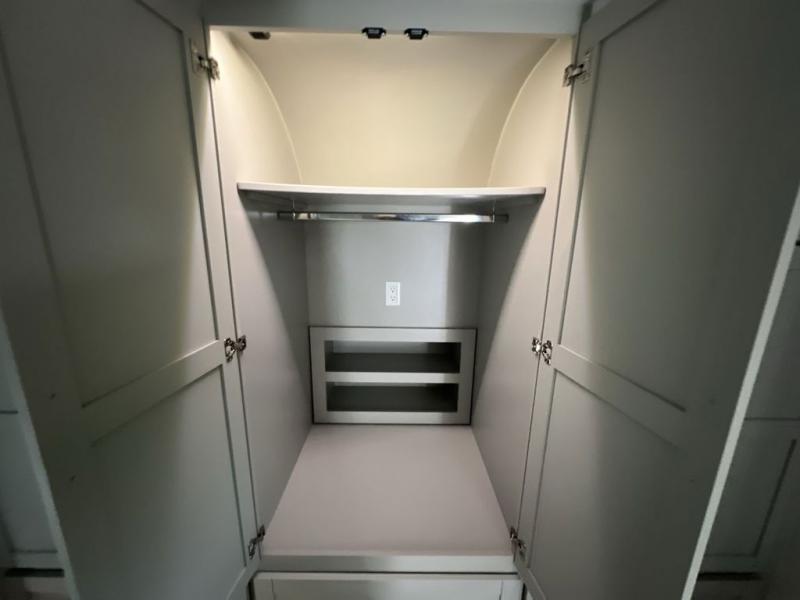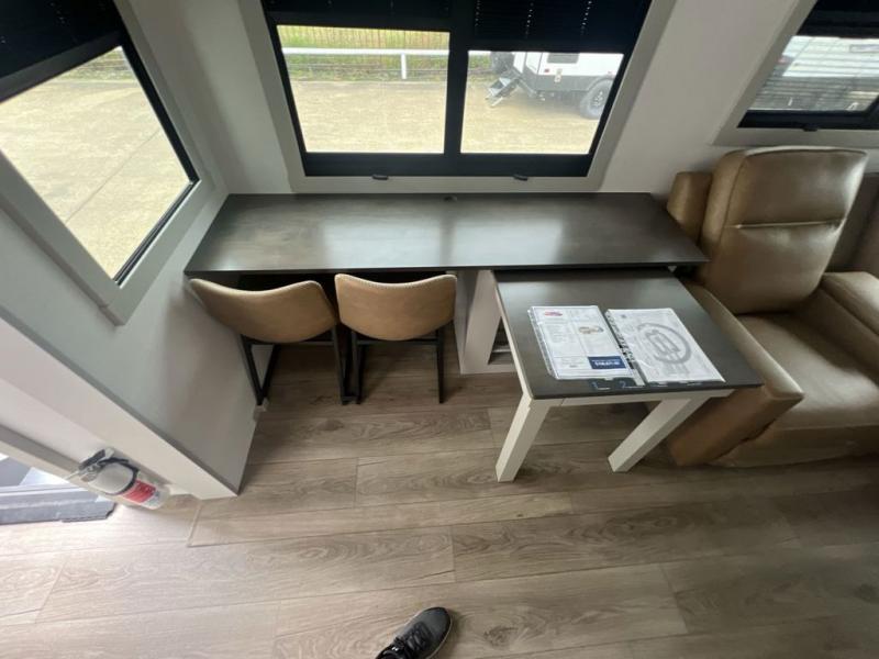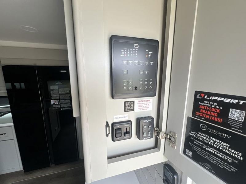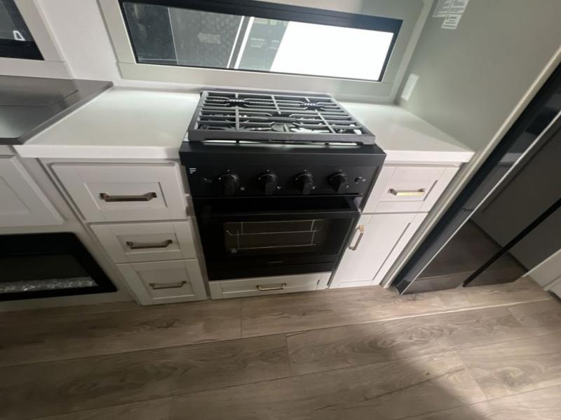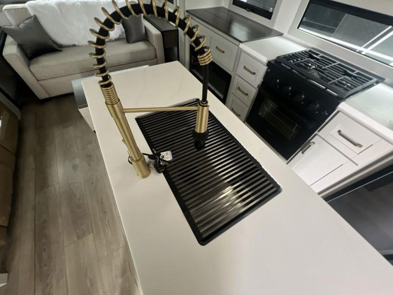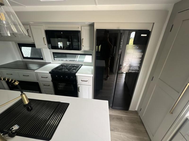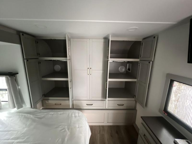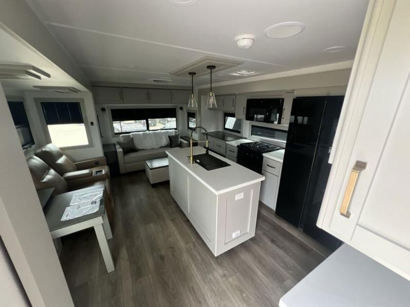 You will love all the space and features in this travel trailer! A luxurious rear living room offers plenty of room to spread out, with a 72" tri-fold sofa plus theater seats, all arranged with a perfect view of the 50" TV over the fireplace. A central kitchen area includes an island with hidden pet bowls. Find even more storage with the hutch plus pantry with adjustable shelves. The front bedroom comes with a queen bed, but if you'd like you can upgrade to a king for even more room. No matter which you choose, you will enjoy watching the 32" bedroom TV. The full-width wardrobe has room for all of your clothes and also includes prep for an optional washer and dryer. And the full bath includes a 30" x 42" one-piece fiberglass shower. Outside you'll enjoy two awnings, pass-through storage, and LED chassis lighting.
