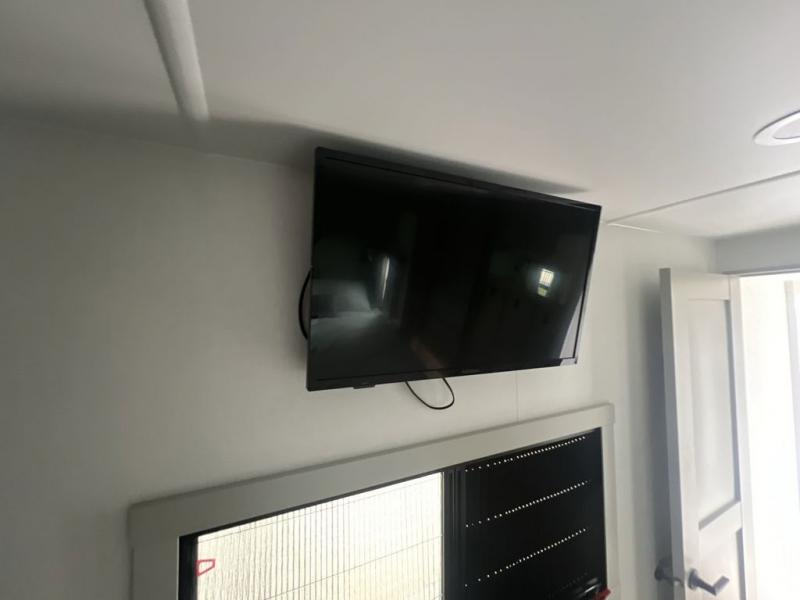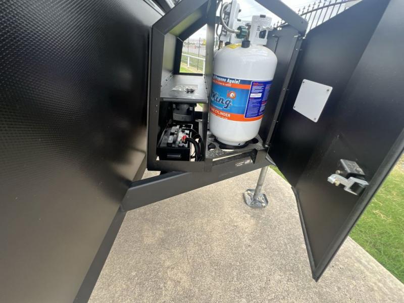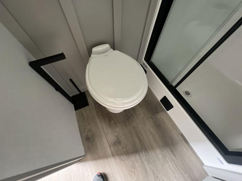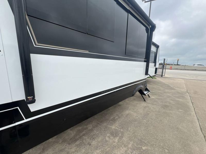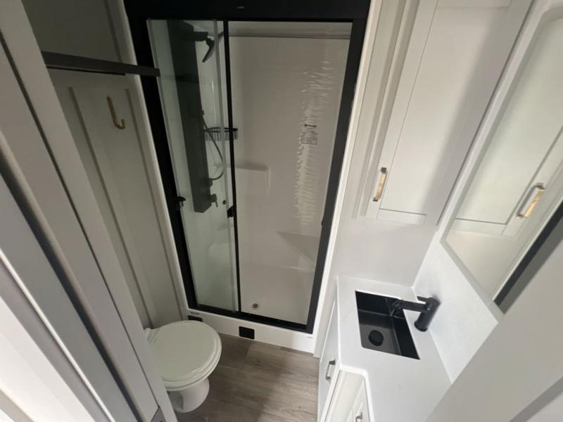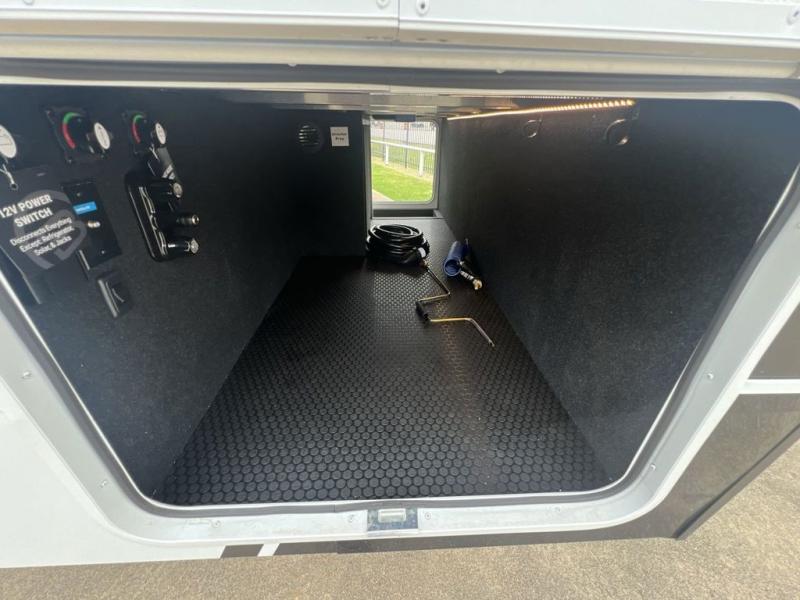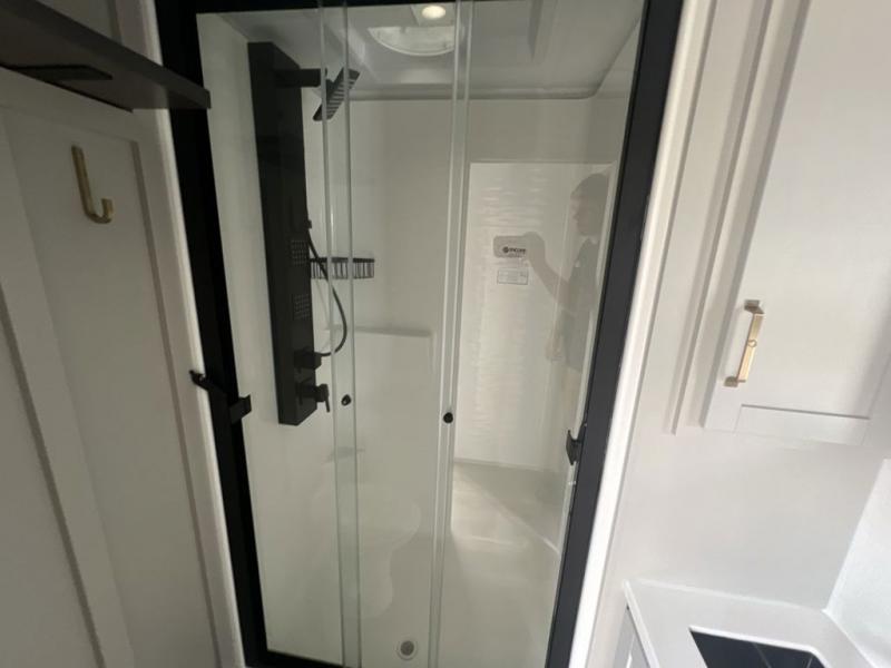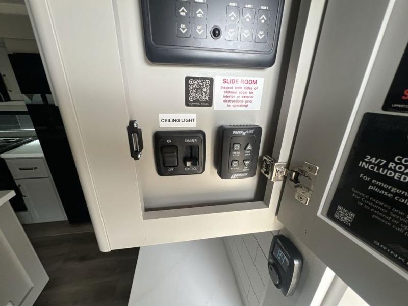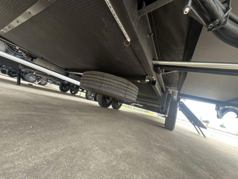 You will love all the space and features in this travel trailer! A luxurious rear living room offers plenty of room to spread out, with a 72" tri-fold sofa plus theater seats, all arranged with a perfect view of the 50" TV over the fireplace. A central kitchen area includes an island with hidden pet bowls. Find even more storage with the hutch plus pantry with adjustable shelves. The front bedroom comes with a queen bed, but if you'd like you can upgrade to a king for even more room. No matter which you choose, you will enjoy watching the 32" bedroom TV. The full-width wardrobe has room for all of your clothes and also includes prep for an optional washer and dryer. And the full bath includes a 30" x 42" one-piece fiberglass shower. Outside you'll enjoy two awnings, pass-through storage, and LED chassis lighting.