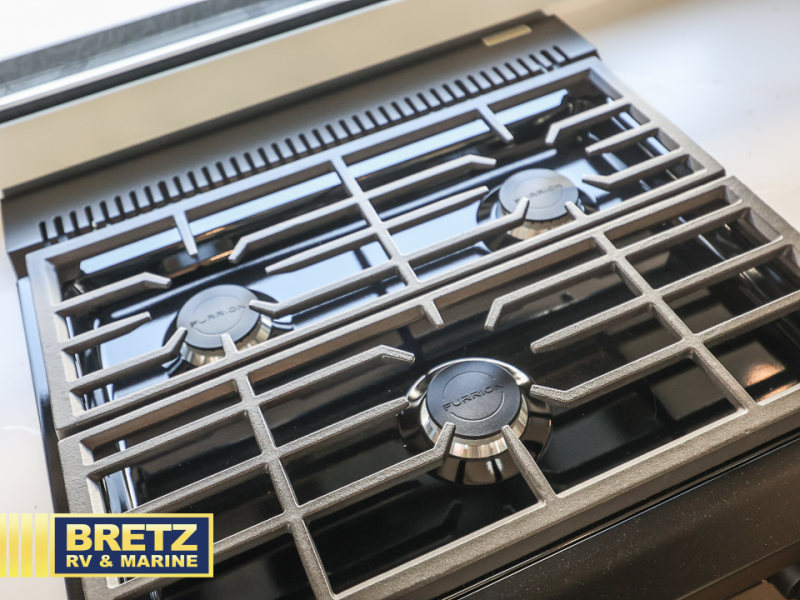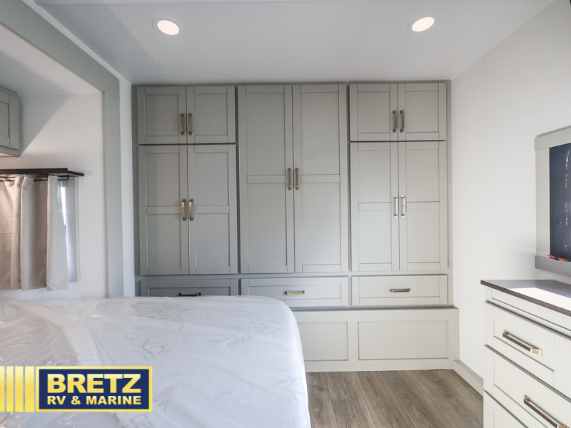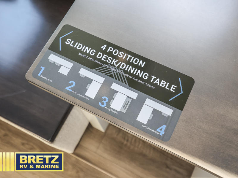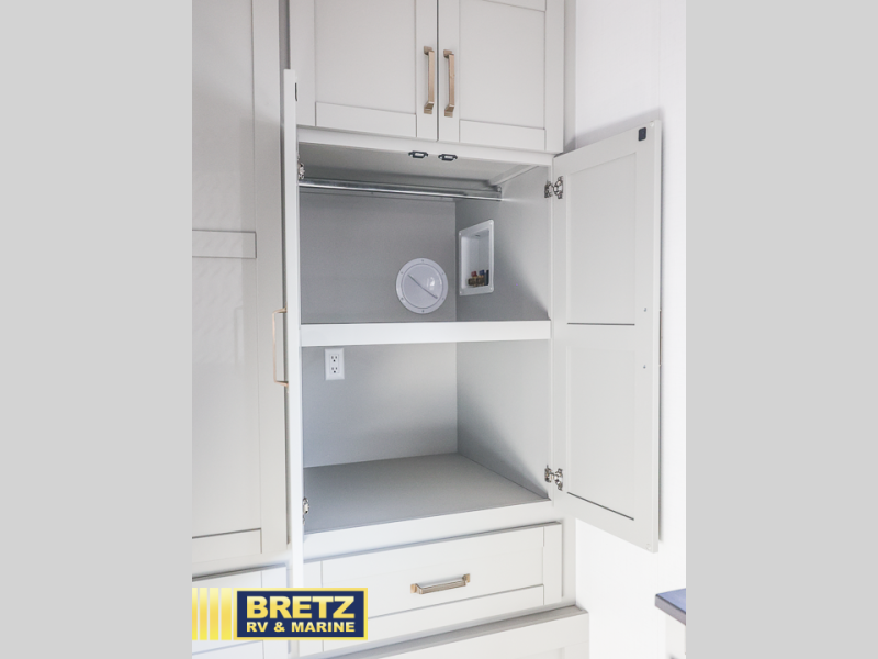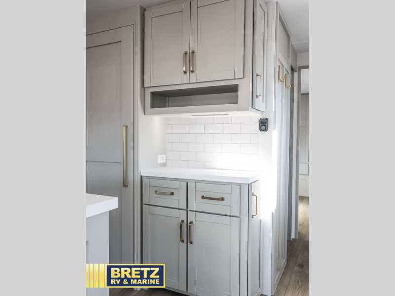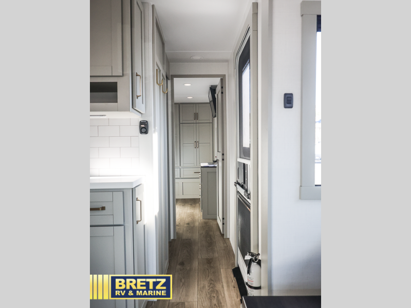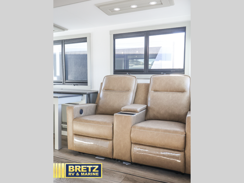 You will love all the space and features in this travel trailer! A luxurious rear living room offers plenty of room to spread out, with a 72" tri-fold sofa plus theater seats, all arranged with a perfect view of the 50" TV over the fireplace. A central kitchen area includes an island with hidden pet bowls. Find even more storage with the hutch plus pantry with adjustable shelves. The front bedroom comes with a queen bed, but if you'd like you can upgrade to a king for even more room. No matter which you choose, you will enjoy watching the 32" bedroom TV. The full-width wardrobe has room for all of your clothes and also includes prep for an optional washer and dryer. And the full bath includes a 30" x 42" one-piece fiberglass shower. Outside you'll enjoy two awnings, pass-through storage, and LED chassis lighting.