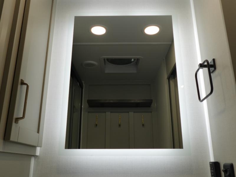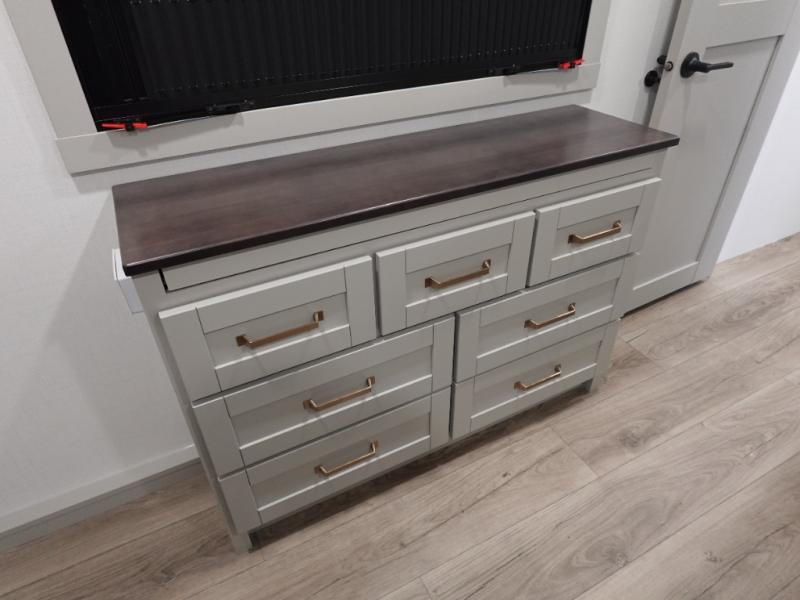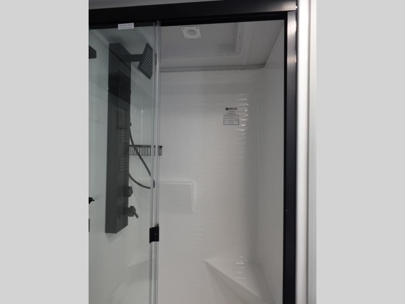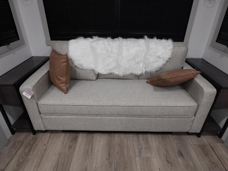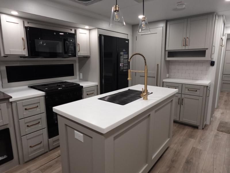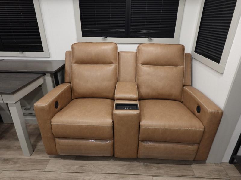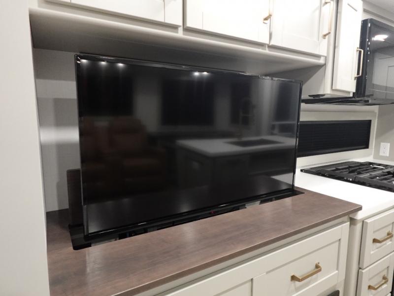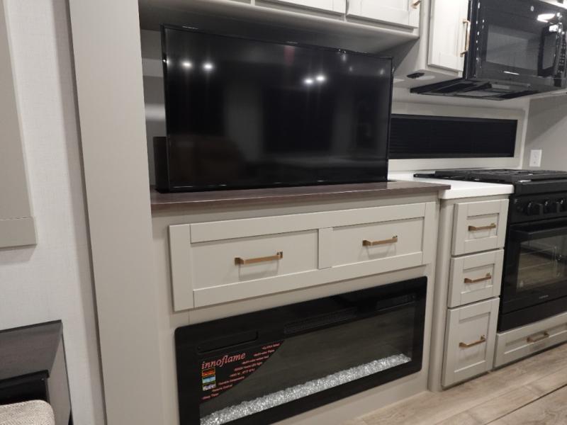 You will love all the space and features in this travel trailer! A luxurious rear living room offers plenty of room to spread out, with a 72" tri-fold sofa plus theater seats, all arranged with a perfect view of the 50" TV over the fireplace. A central kitchen area includes an island with hidden pet bowls. Find even more storage with the hutch plus pantry with adjustable shelves. The front bedroom comes with a king bed. No matter which you choose, you will enjoy watching the 32" bedroom TV. The full-width wardrobe has room for all of your clothes and also includes prep for a washer and dryer. And the full bath includes a 30" x 42" one-piece fiberglass shower. Outside you'll enjoy two awnings, pass-through storage, and LED chassis lighting.