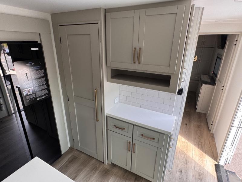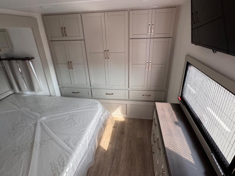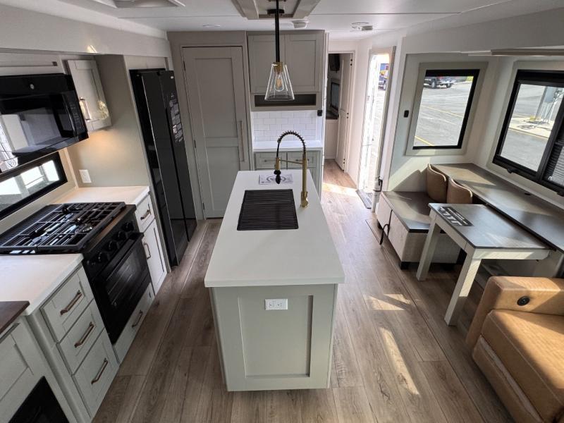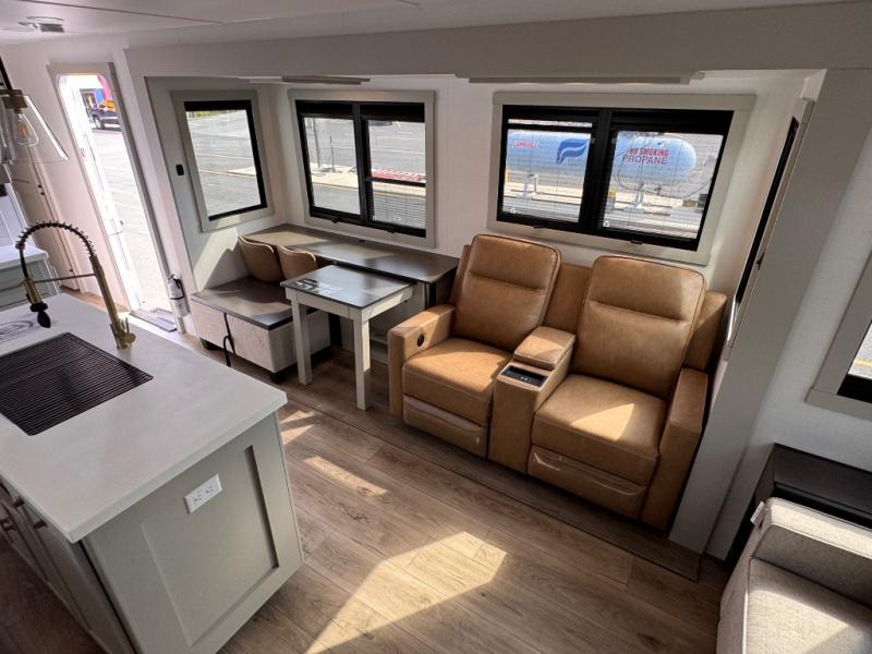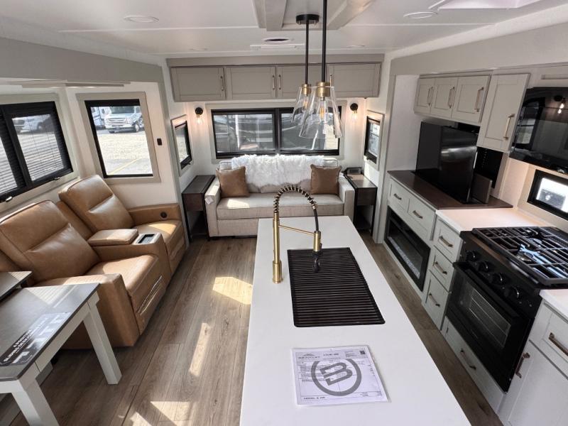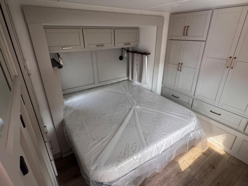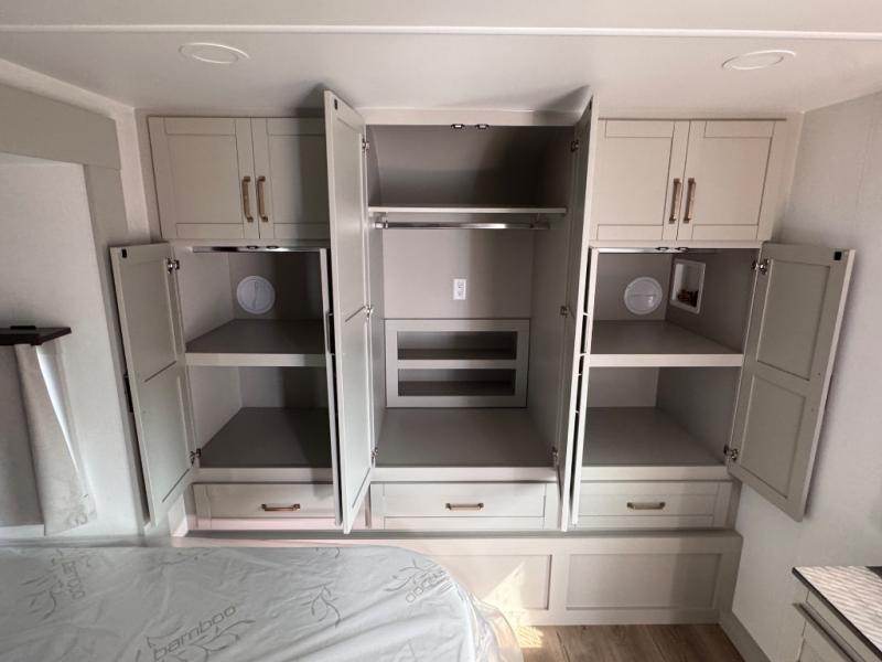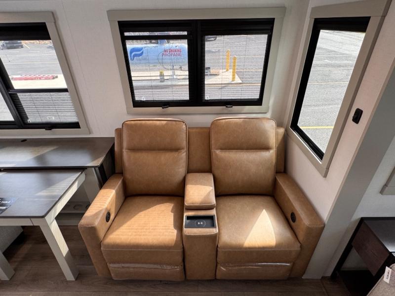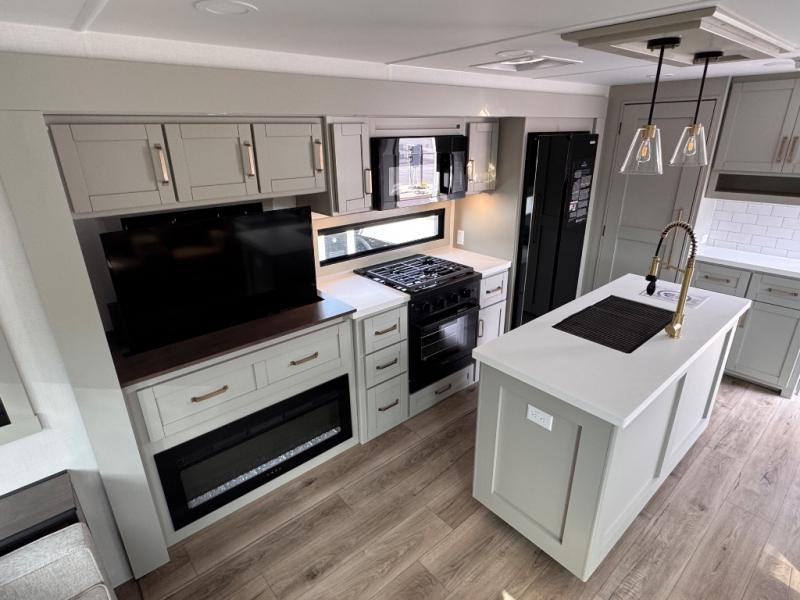 You will love all the space and features in this travel trailer! A luxurious rear living room offers plenty of room to spread out, with a 72" tri-fold sofa plus theater seats, all arranged with a perfect view of the 50" TV over the fireplace. A central kitchen area includes an island with hidden pet bowls. Find even more storage with the hutch plus pantry with adjustable shelves. The front bedroom comes with a queen bed, but if you'd like you can upgrade to a king for even more room. No matter which you choose, you will enjoy watching the 32" bedroom TV. The full-width wardrobe has room for all of your clothes and also includes prep for an optional washer and dryer. And the full bath includes a 30" x 42" one-piece fiberglass shower. Outside you'll enjoy two awnings, pass-through storage, and LED chassis lighting.