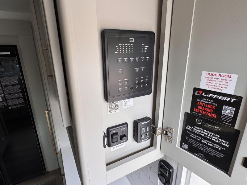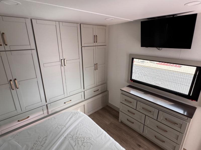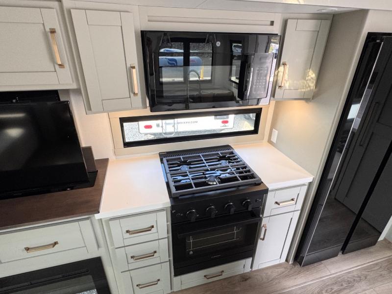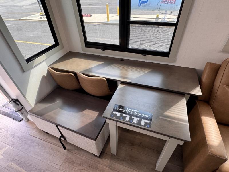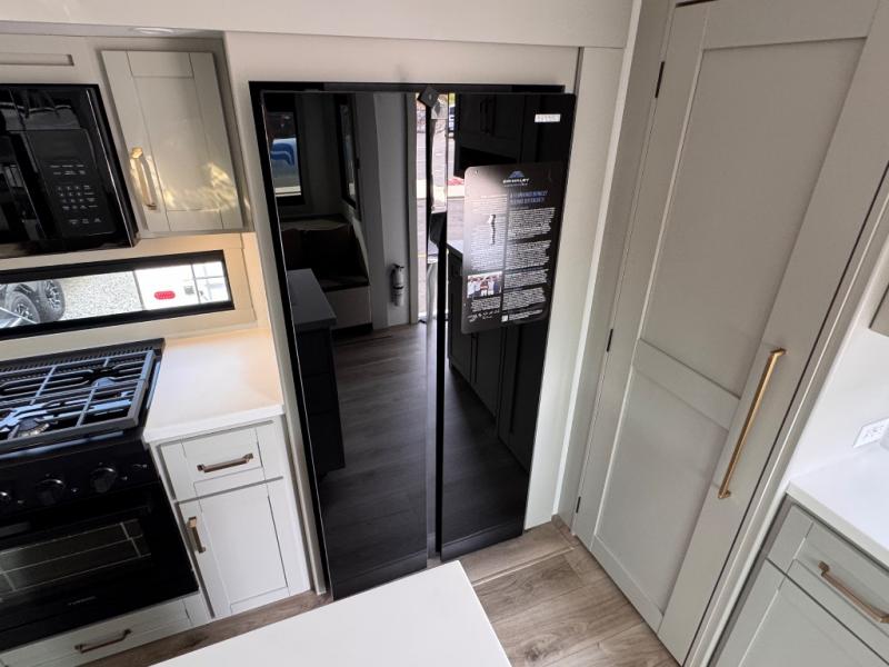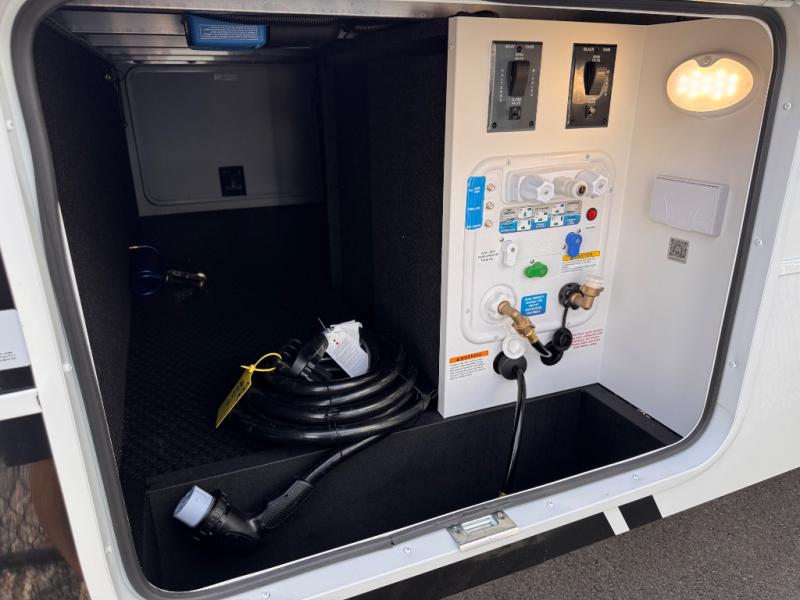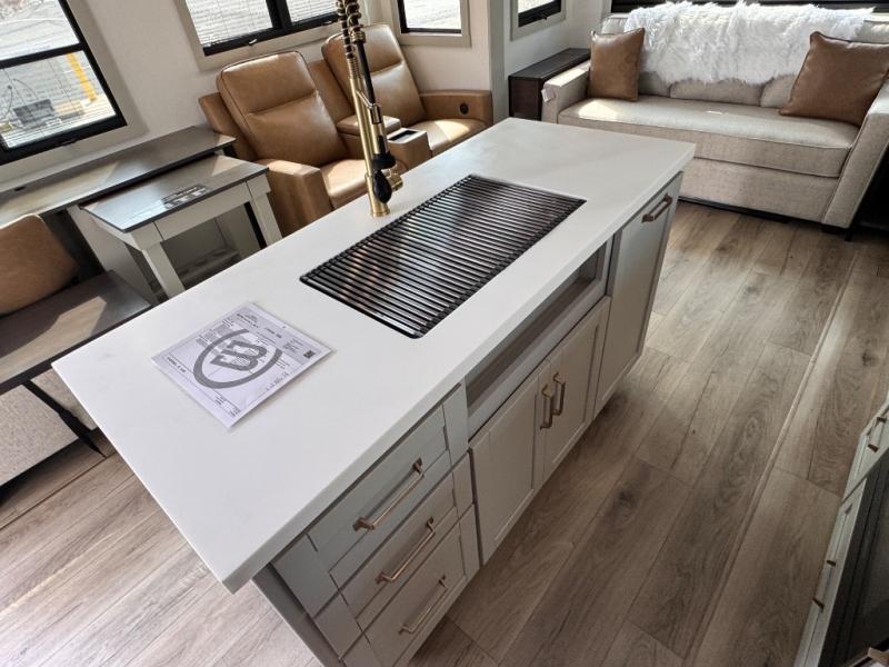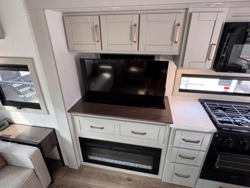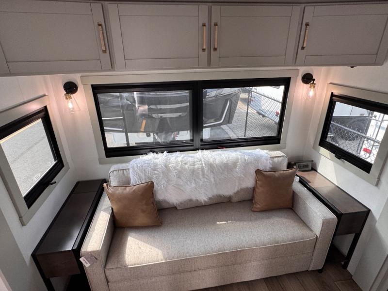 You will love all the space and features in this travel trailer! A luxurious rear living room offers plenty of room to spread out, with a 72" tri-fold sofa plus theater seats, all arranged with a perfect view of the 50" TV over the fireplace. A central kitchen area includes an island with hidden pet bowls. Find even more storage with the hutch plus pantry with adjustable shelves. The front bedroom comes with a queen bed, but if you'd like you can upgrade to a king for even more room. No matter which you choose, you will enjoy watching the 32" bedroom TV. The full-width wardrobe has room for all of your clothes and also includes prep for an optional washer and dryer. And the full bath includes a 30" x 42" one-piece fiberglass shower. Outside you'll enjoy two awnings, pass-through storage, and LED chassis lighting.