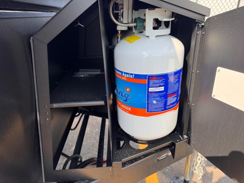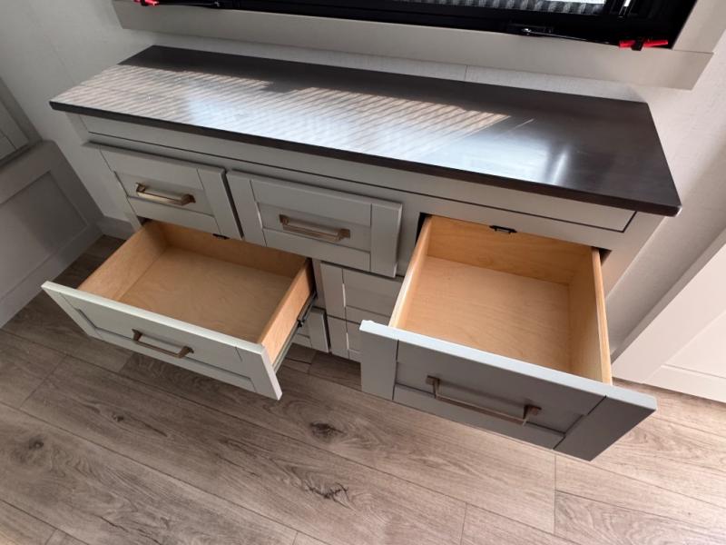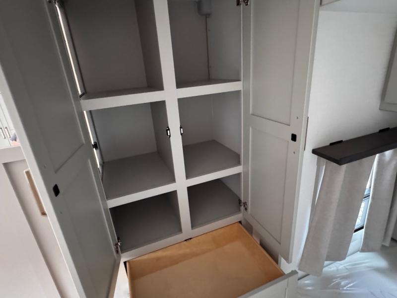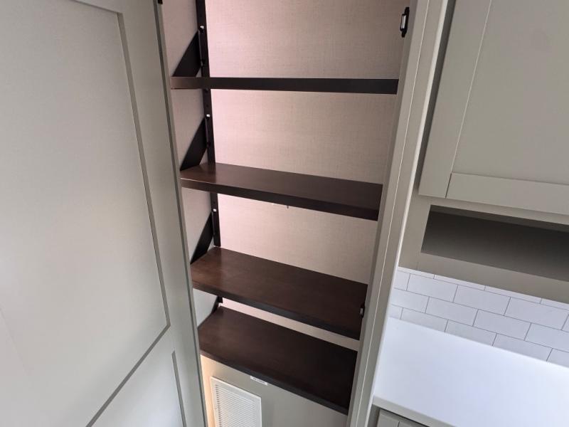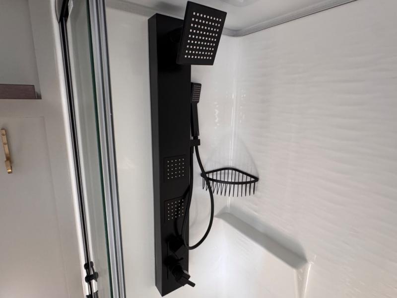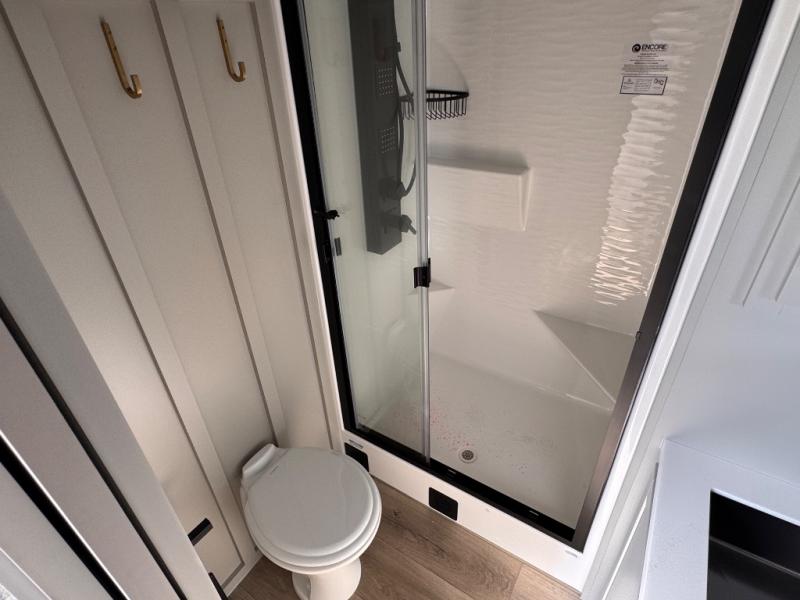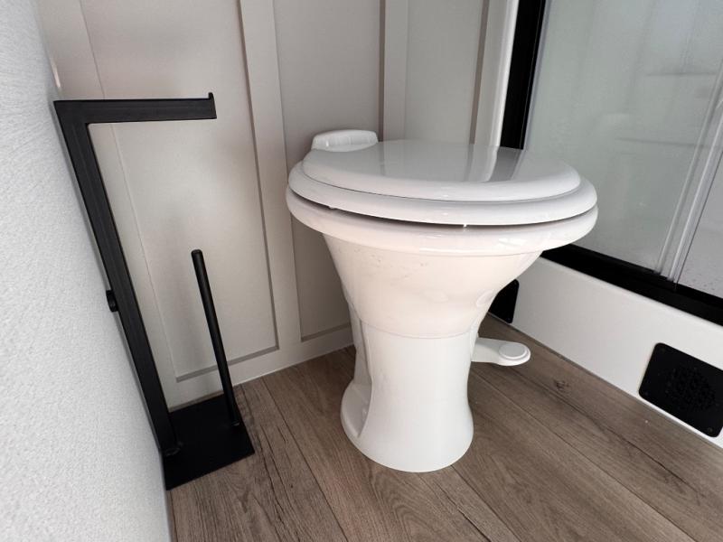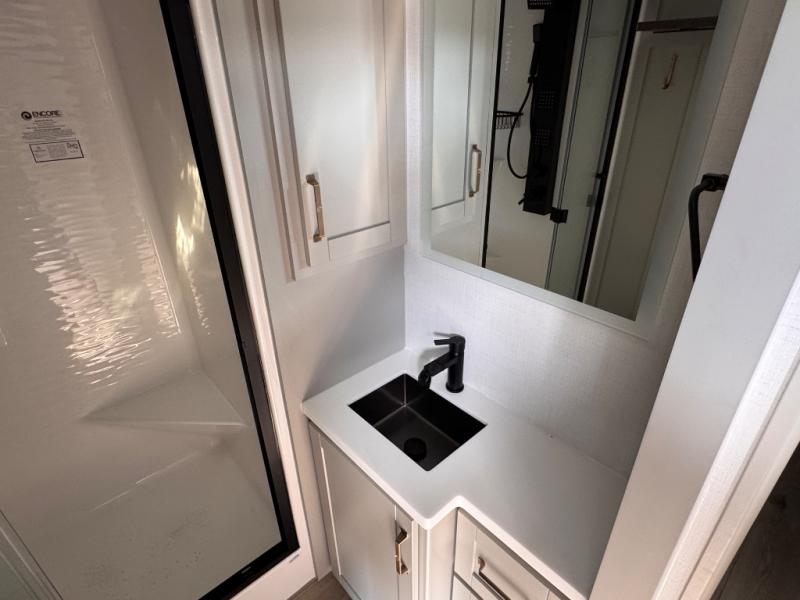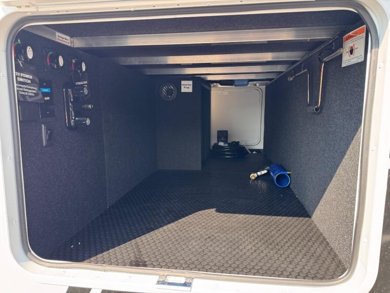 You will love all the space and features in this travel trailer! A luxurious rear living room offers plenty of room to spread out, with a 72" tri-fold sofa plus theater seats, all arranged with a perfect view of the 50" TV over the fireplace. A central kitchen area includes an island with hidden pet bowls. Find even more storage with the hutch plus pantry with adjustable shelves. The front bedroom comes with a queen bed, but if you'd like you can upgrade to a king for even more room. No matter which you choose, you will enjoy watching the 32" bedroom TV. The full-width wardrobe has room for all of your clothes and also includes prep for an optional washer and dryer. And the full bath includes a 30" x 42" one-piece fiberglass shower. Outside you'll enjoy two awnings, pass-through storage, and LED chassis lighting.