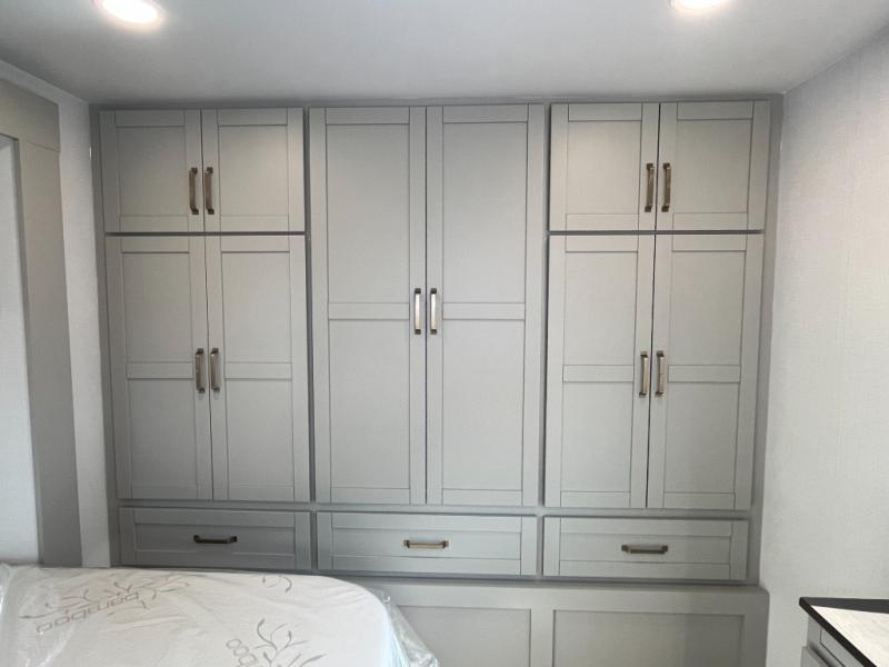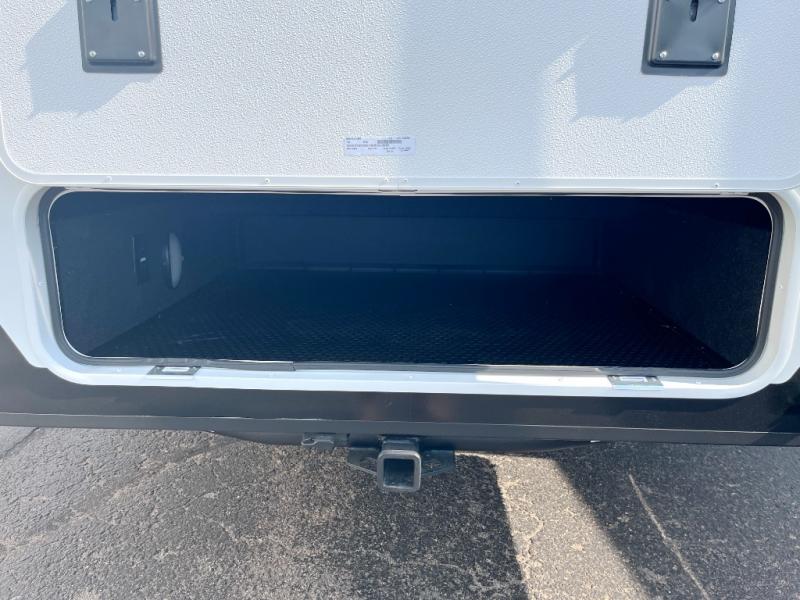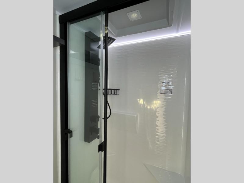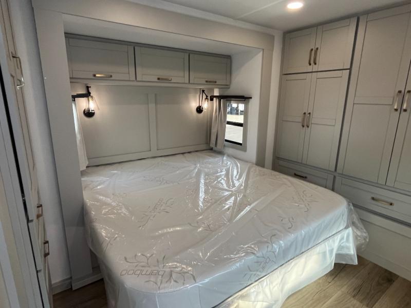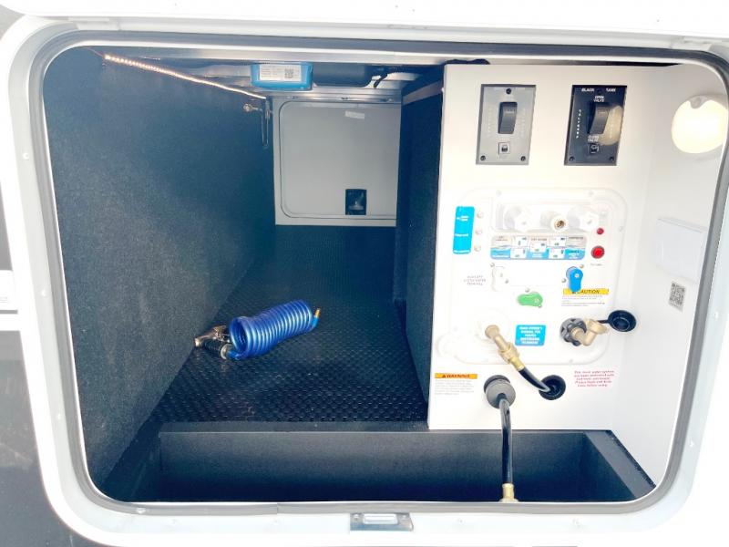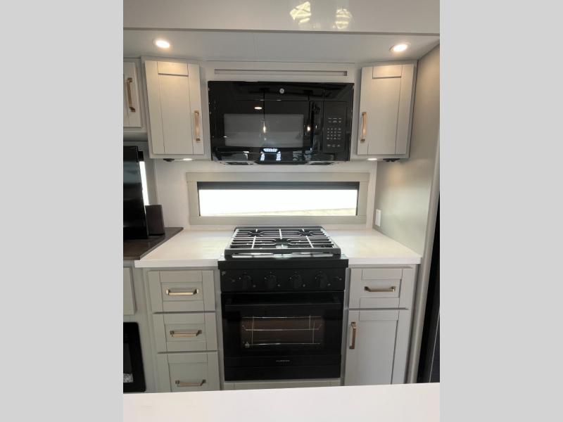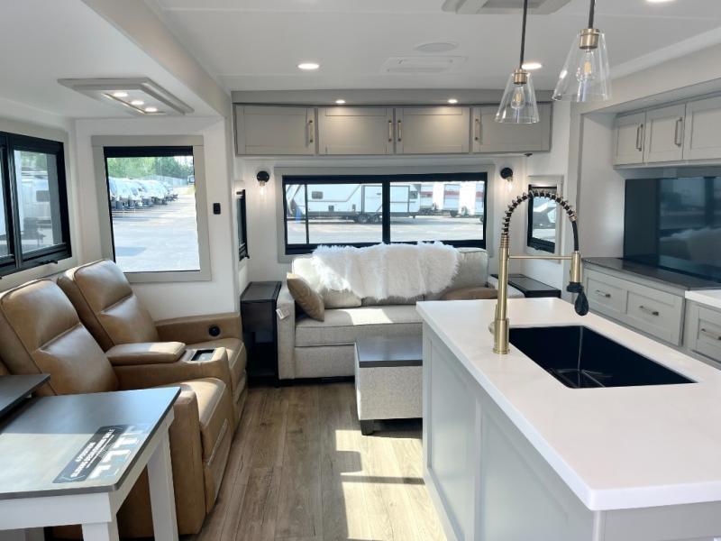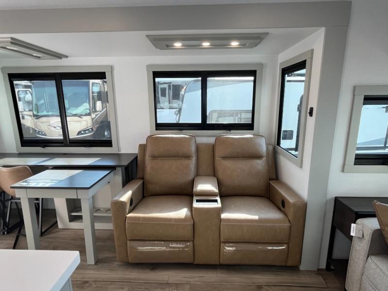 You will love all the space and features in this travel trailer! A luxurious rear living room offers plenty of room to spread out, with a 72" tri-fold sofa plus theater seats, all arranged with a perfect view of the 50" TV over the fireplace. A central kitchen area includes an island with hidden pet bowls. Find even more storage with the hutch plus pantry with adjustable shelves. The front bedroom comes with a queen bed, but if you'd like you can upgrade to a king for even more room. No matter which you choose, you will enjoy watching the 32" bedroom TV. The full-width wardrobe has room for all of your clothes and also includes prep for an optional washer and dryer. And the full bath includes a 30" x 42" one-piece fiberglass shower. Outside you'll enjoy two awnings, pass-through storage, and LED chassis lighting.