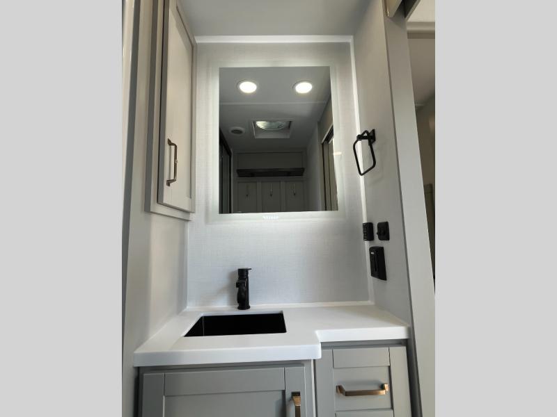With any Model Z Air travel trailer by Brinkley, you will enjoy premium features at every turn. The industry-first low maintenance roof is sure to be appreciated, plus there are industry-first brass plumbing connections for excellent resistance to corrosion. The drop-frame chassis with over 100 cu. ft. of exterior storage will allow you to bring along camp gear galore, plus there are motion lighting and power outlets for added convenience! You'll also find two hot/cold showers outdoors, along with a 370-watt solar panel, a custom LP box with locked battery storage, and a premium utility center with a retractable 65' water hose to wash off mud from the lake. The interior is just as accommodating with its solid surface countertops, Brinkley CraftSense wood trim construction, integrated window screens and insulated blackout blinds, and the list of luxury features goes on!