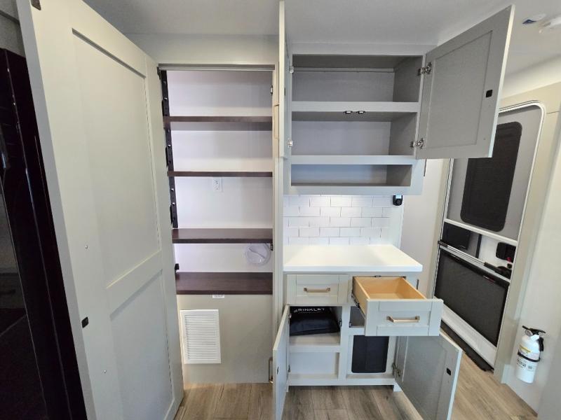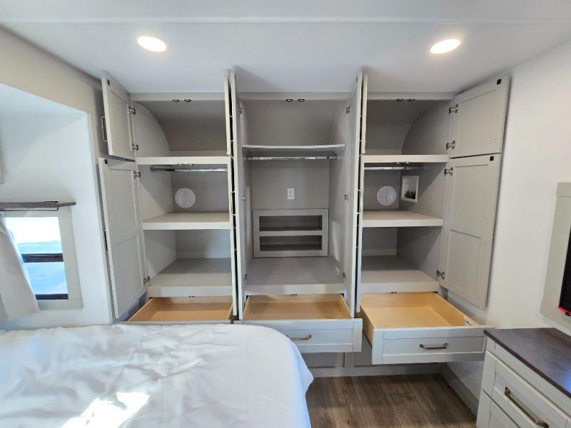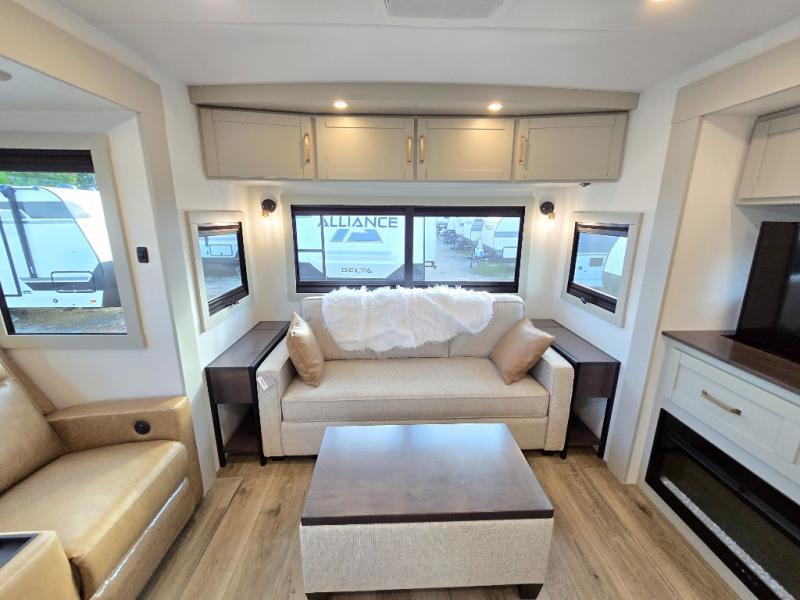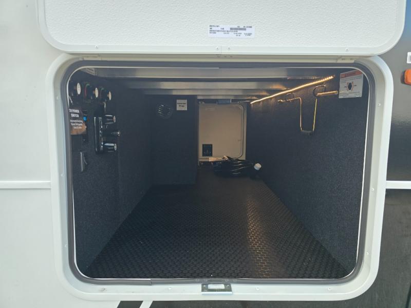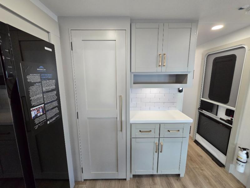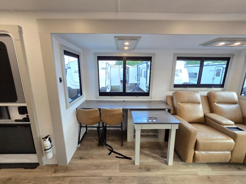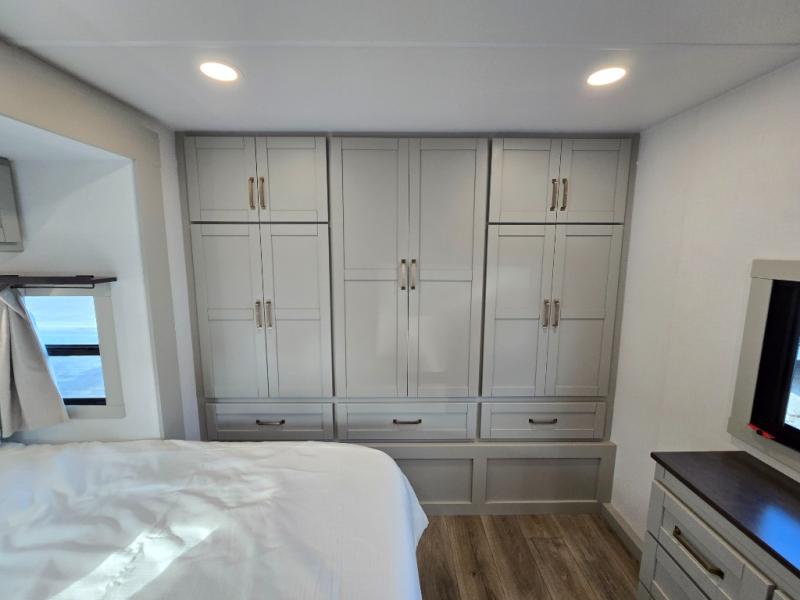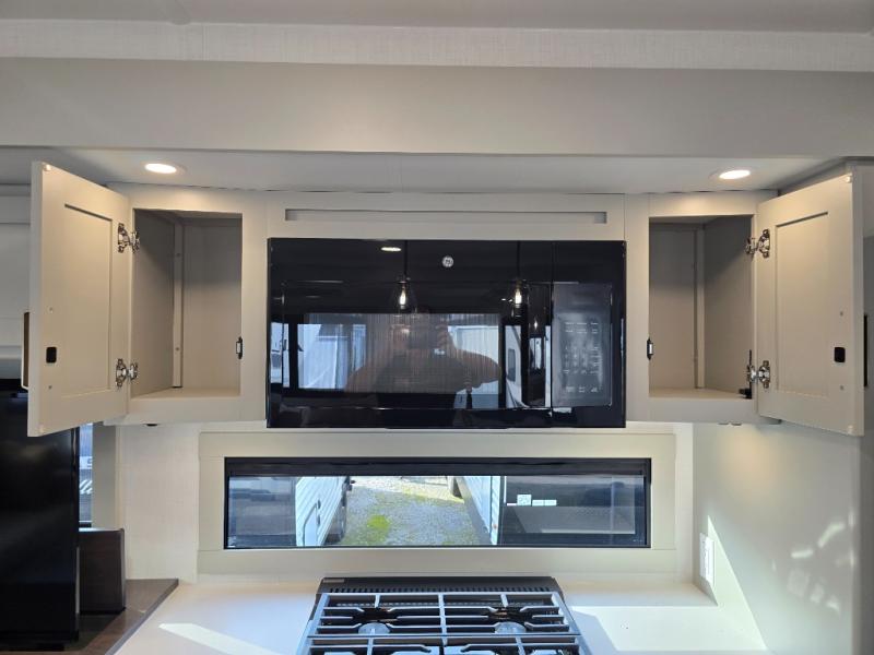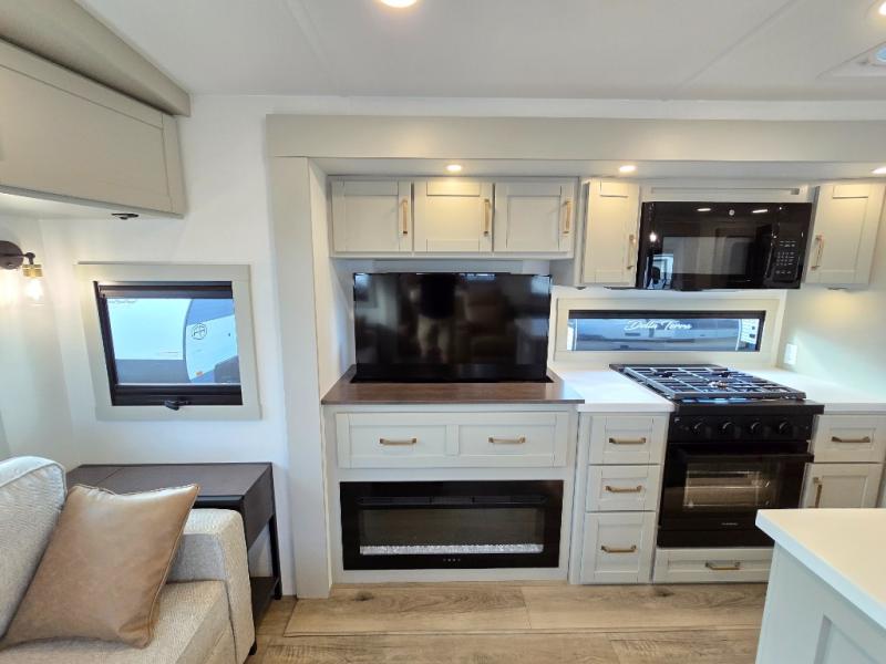 You will love all the space and features in this travel trailer! A luxurious rear living room offers plenty of room to spread out, with a 72" tri-fold sofa plus theater seats, all arranged with a perfect view of the 50" TV over the fireplace. A central kitchen area includes an island with hidden pet bowls. Find even more storage with the hutch plus pantry with adjustable shelves. The front bedroom comes with a queen bed, but if you'd like you can upgrade to a king for even more room. No matter which you choose, you will enjoy watching the 32" bedroom TV. The full-width wardrobe has room for all of your clothes and also includes prep for an optional washer and dryer. And the full bath includes a 30" x 42" one-piece fiberglass shower. Outside you'll enjoy two awnings, pass-through storage, and LED chassis lighting.