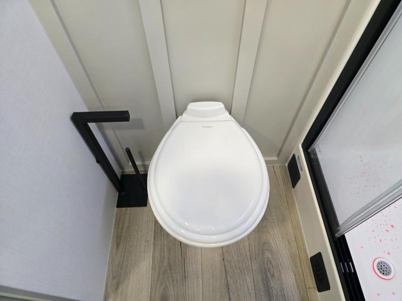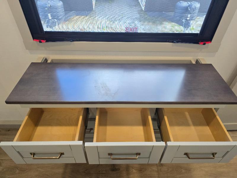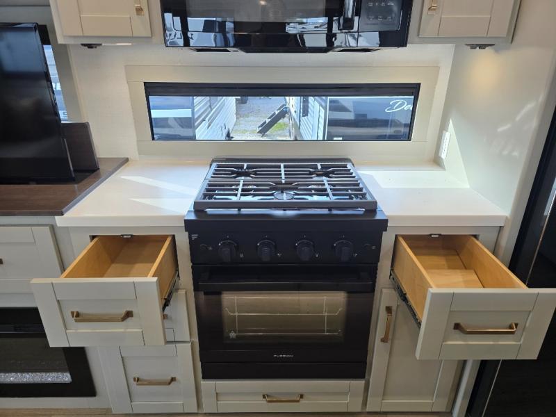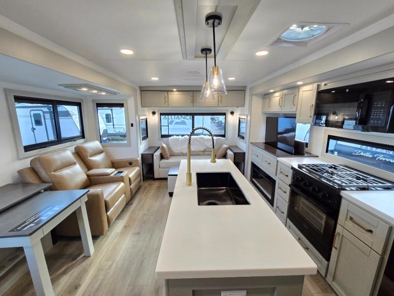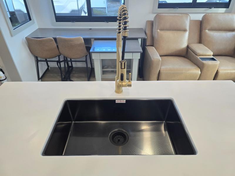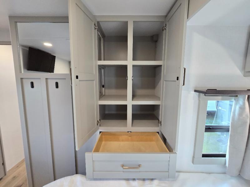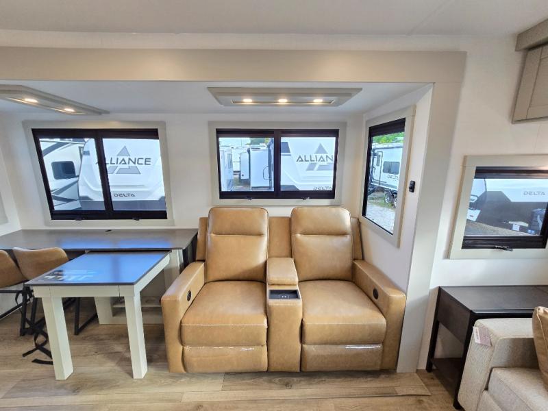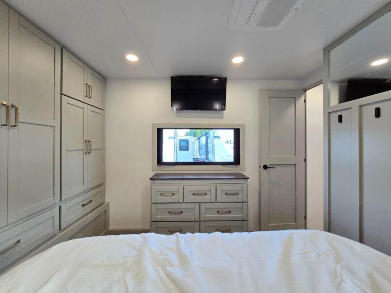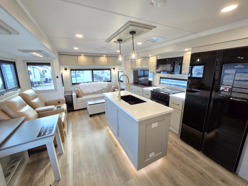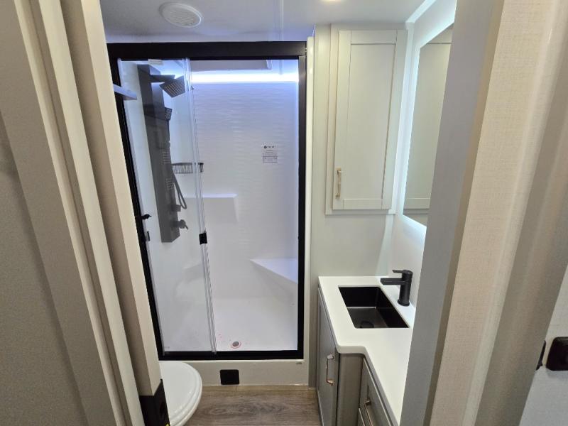You will love all the space and features in this travel trailer! A luxurious rear living room offers plenty of room to spread out, with a 72" tri-fold sofa plus theater seats, all arranged with a perfect view of the 50" TV over the fireplace. A central kitchen area includes an island with hidden pet bowls. Find even more storage with the hutch plus pantry with adjustable shelves. The front bedroom comes with a queen bed, but if you'd like you can upgrade to a king for even more room. No matter which you choose, you will enjoy watching the 32" bedroom TV. The full-width wardrobe has room for all of your clothes and also includes prep for an optional washer and dryer. And the full bath includes a 30" x 42" one-piece fiberglass shower. Outside you'll enjoy two awnings, pass-through storage, and LED chassis lighting.