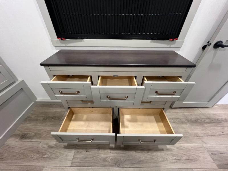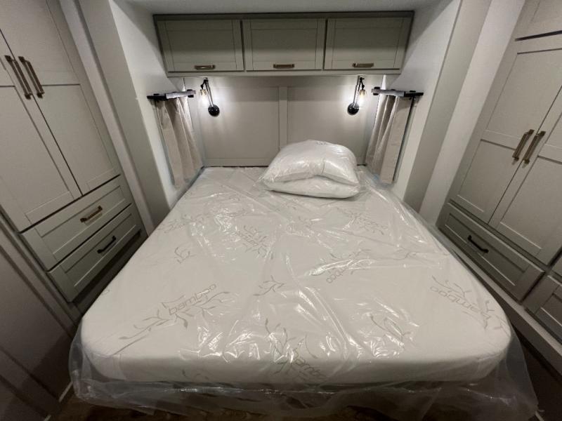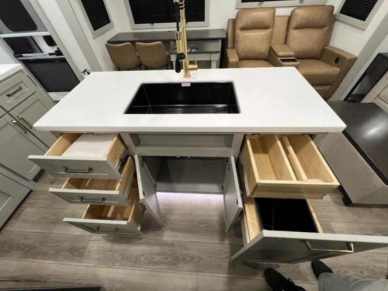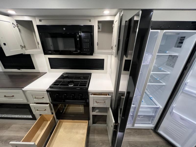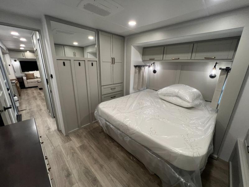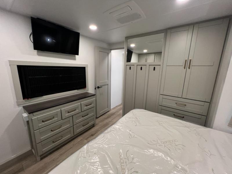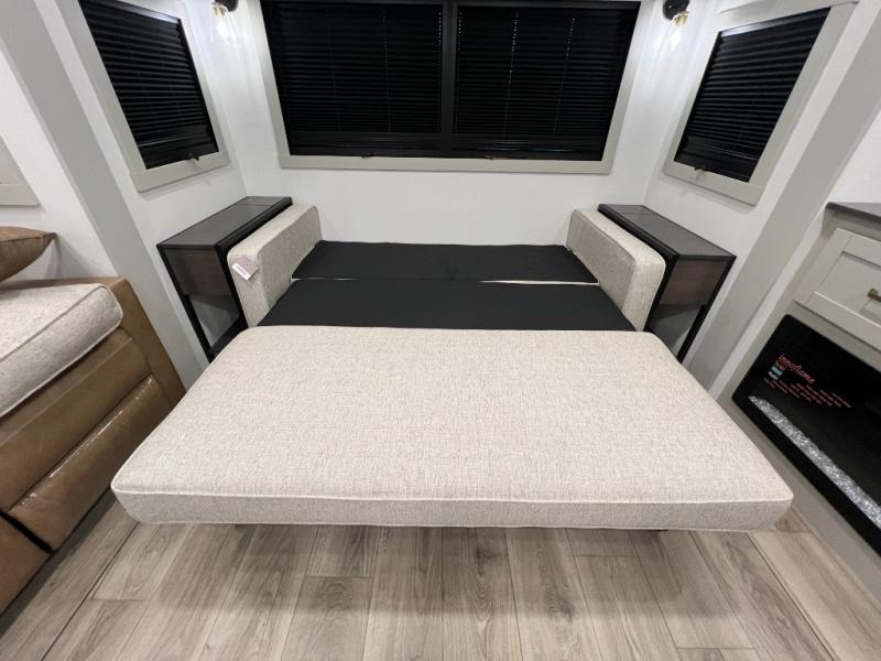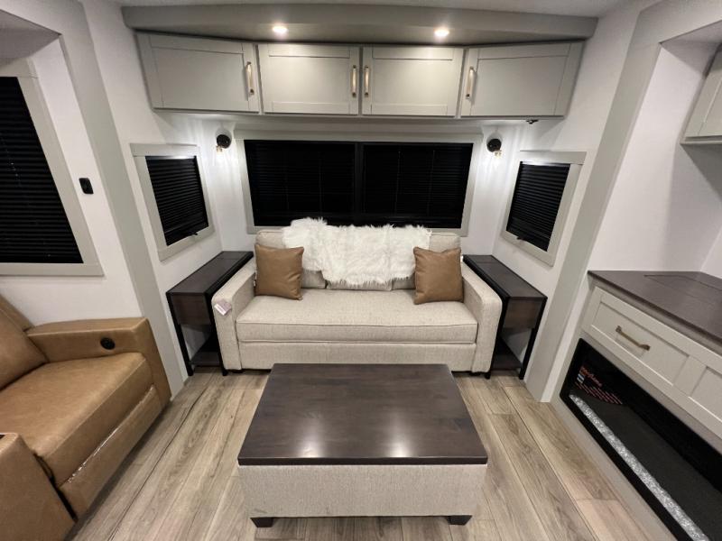 You will love all the space and features in this travel trailer! A luxurious rear living room offers plenty of room to spread out, with a 72" tri-fold sofa plus theater seats, all arranged with a perfect view of the 50" TV over the fireplace. A central kitchen area includes an island with hidden pet bowls. Find even more storage with the hutch plus pantry with adjustable shelves. The front bedroom comes with a queen bed, but if you'd like you can upgrade to a king for even more room. No matter which you choose, you will enjoy watching the 32" bedroom TV. The full-width wardrobe has room for all of your clothes and also includes prep for an optional washer and dryer. And the full bath includes a 30" x 42" one-piece fiberglass shower. Outside you'll enjoy two awnings, pass-through storage, and LED chassis lighting.