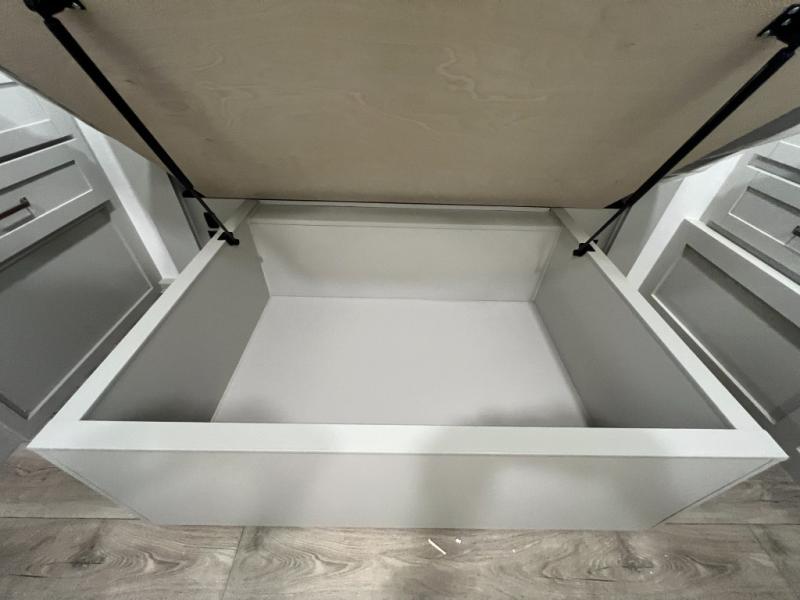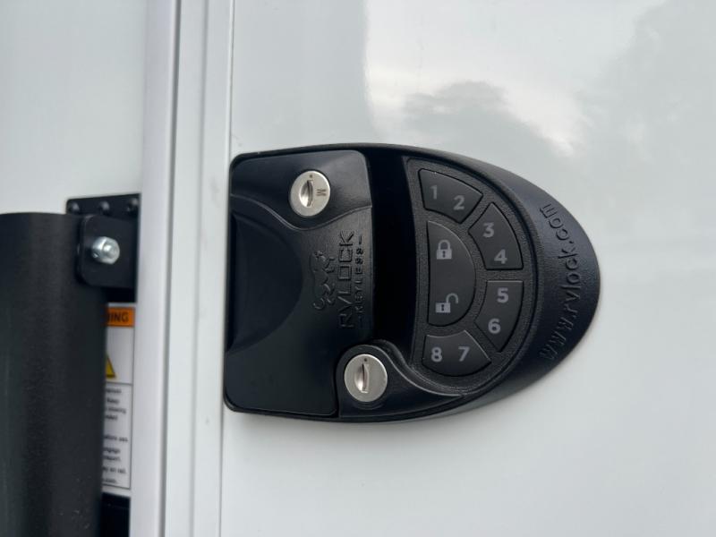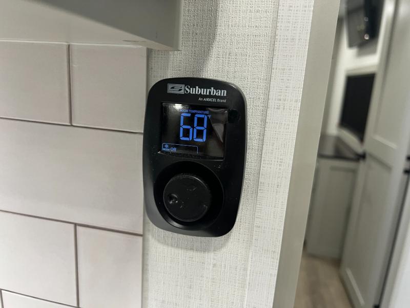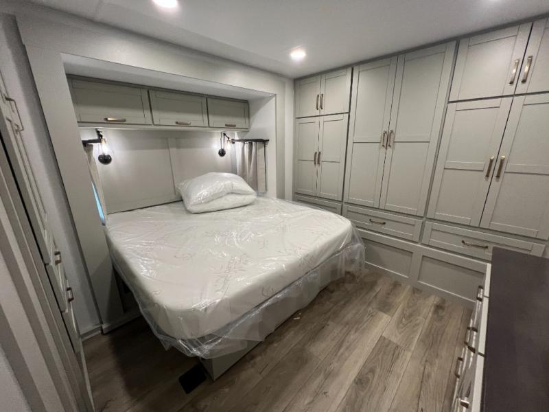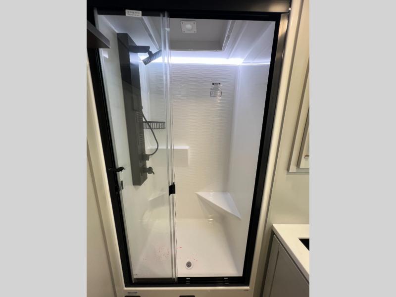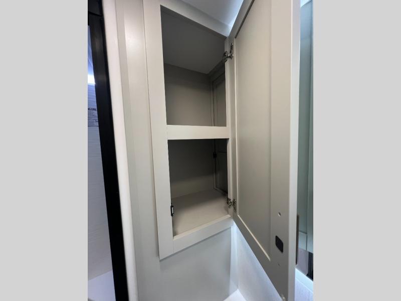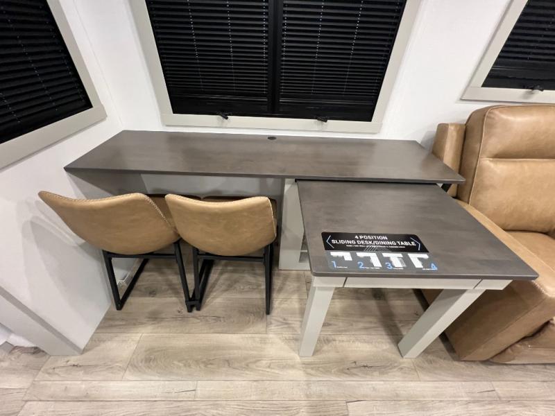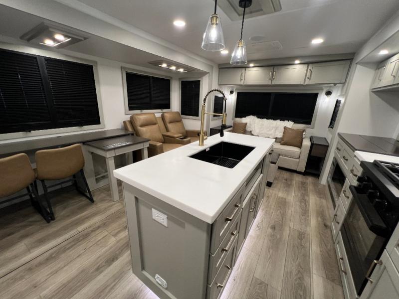 You will love all the space and features in this travel trailer! A luxurious rear living room offers plenty of room to spread out, with a 72" tri-fold sofa plus theater seats, all arranged with a perfect view of the 50" TV over the fireplace. A central kitchen area includes an island with hidden pet bowls. Find even more storage with the hutch plus pantry with adjustable shelves. The front bedroom comes with a queen bed, but if you'd like you can upgrade to a king for even more room. No matter which you choose, you will enjoy watching the 32" bedroom TV. The full-width wardrobe has room for all of your clothes and also includes prep for an optional washer and dryer. And the full bath includes a 30" x 42" one-piece fiberglass shower. Outside you'll enjoy two awnings, pass-through storage, and LED chassis lighting.