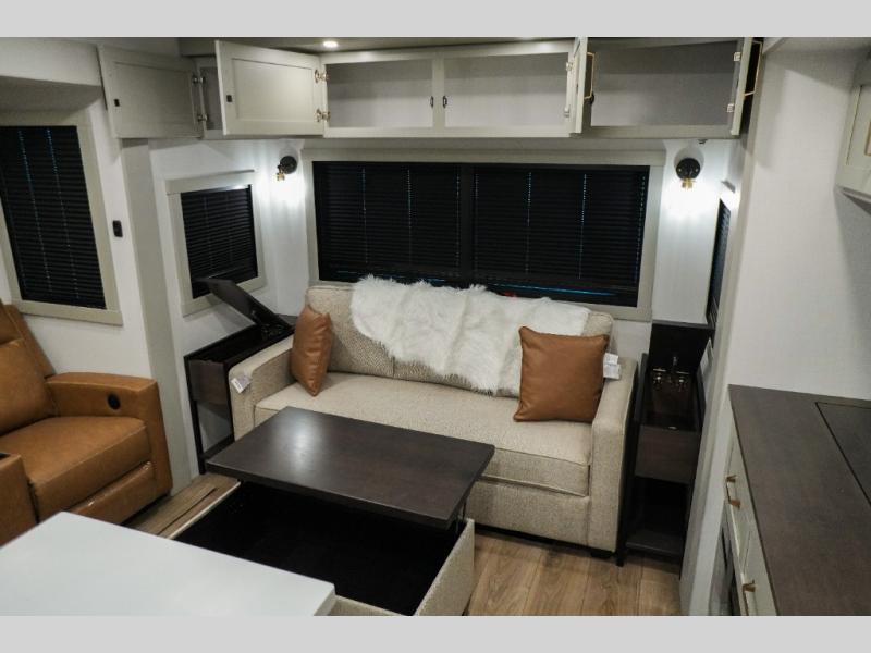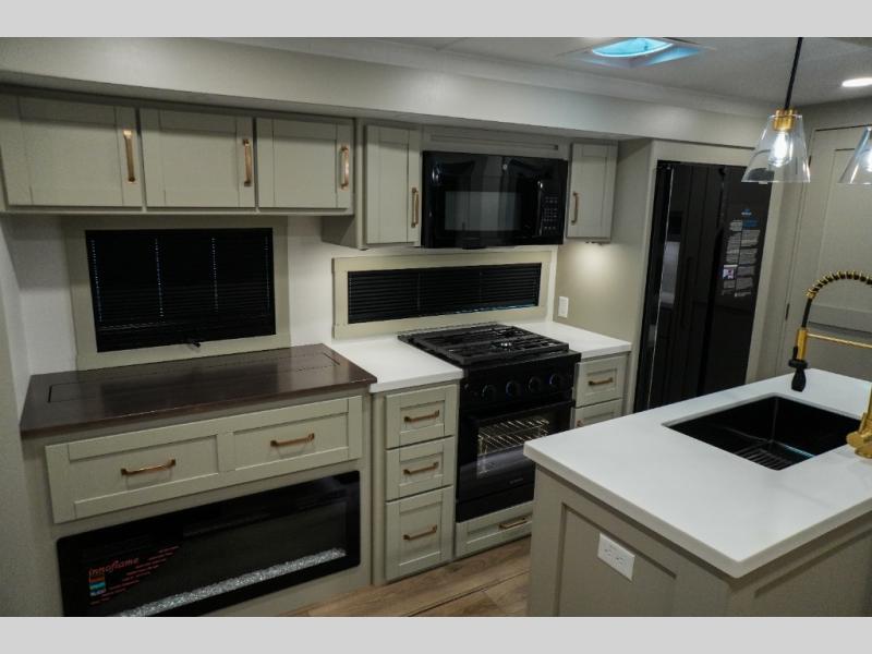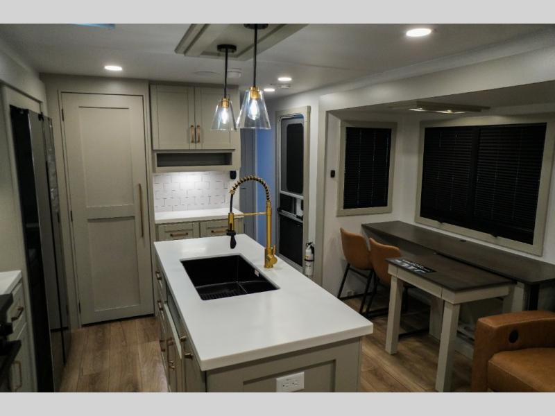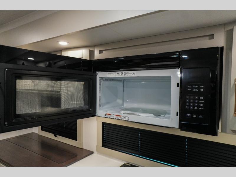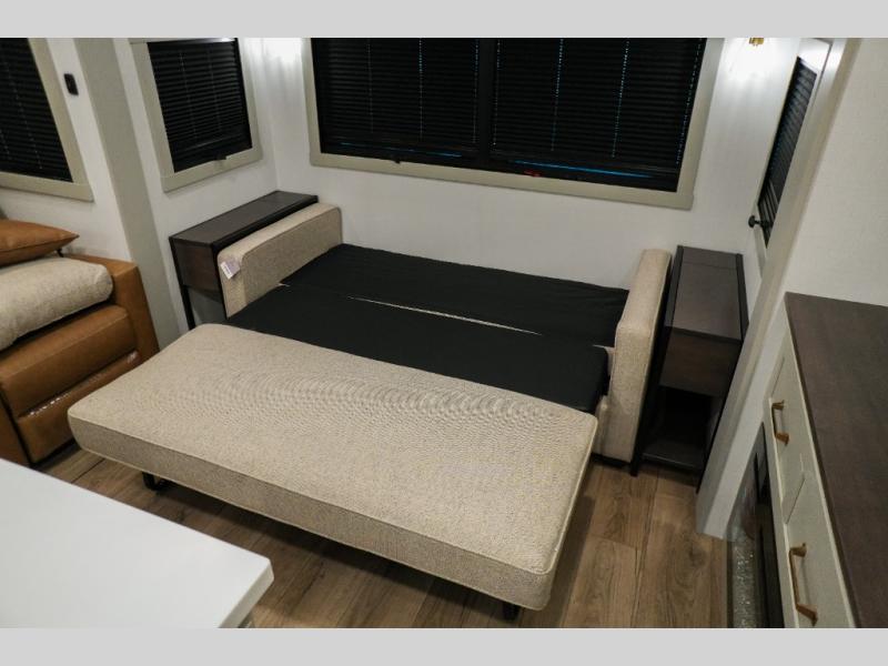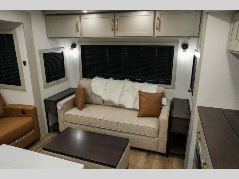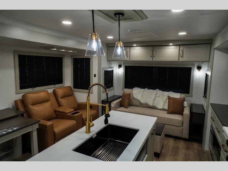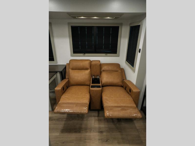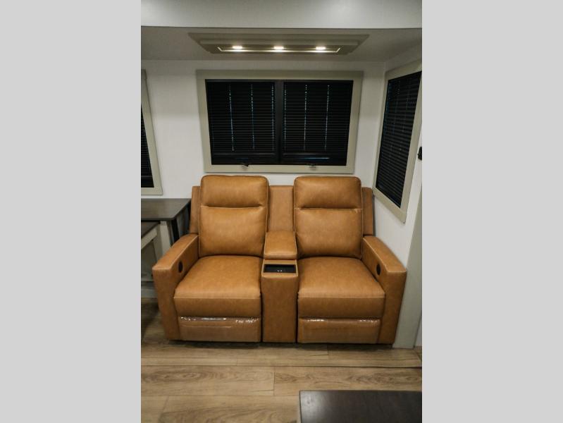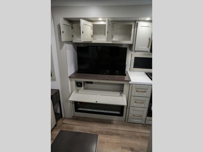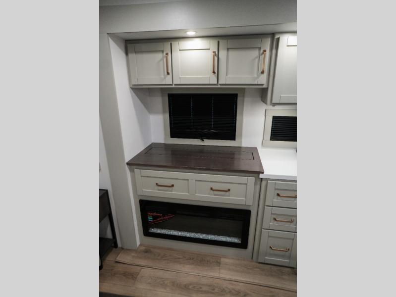 You will love all the space and features in this travel trailer! A luxurious rear living room offers plenty of room to spread out, with a 72" tri-fold sofa plus theater seats, all arranged with a perfect view of the 50" TV over the fireplace. A central kitchen area includes an island with hidden pet bowls. Find even more storage with the hutch plus pantry with adjustable shelves. The front bedroom comes with a queen bed, but if you'd like you can upgrade to a king for even more room. No matter which you choose, you will enjoy watching the 32" bedroom TV. The full-width wardrobe has room for all of your clothes and also includes prep for an optional washer and dryer. And the full bath includes a 30" x 42" one-piece fiberglass shower. Outside you'll enjoy two awnings, pass-through storage, and LED chassis lighting.