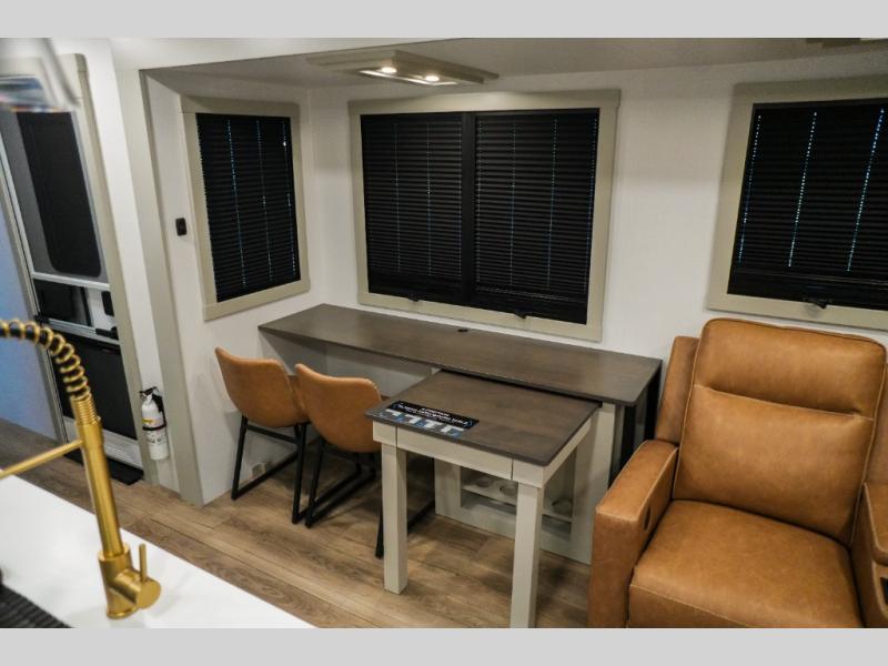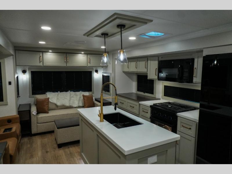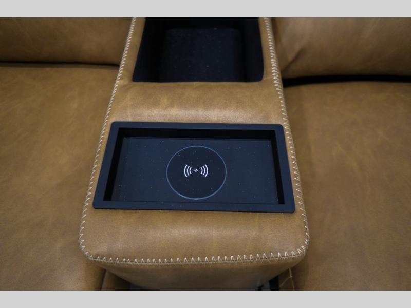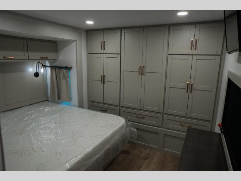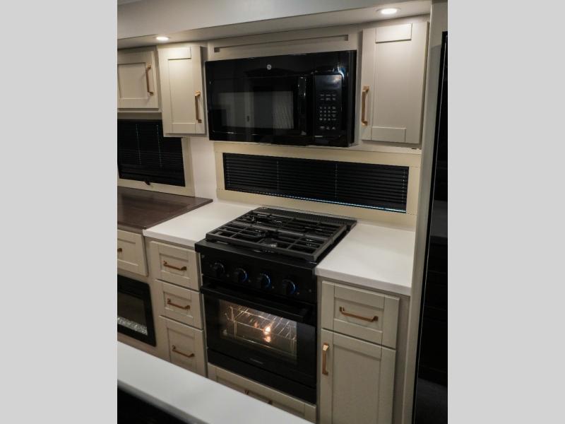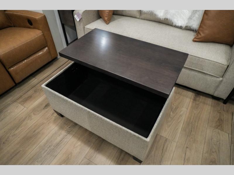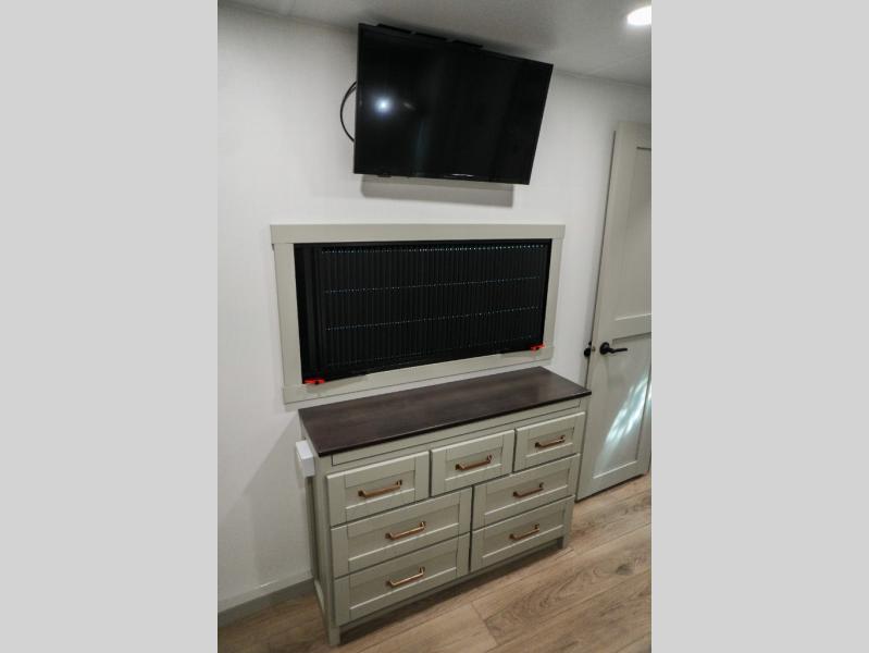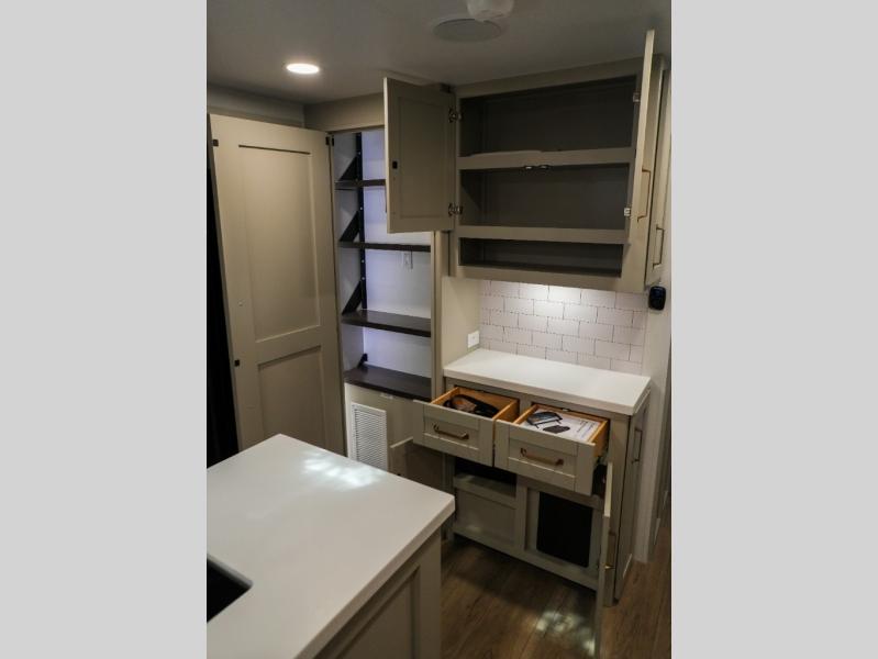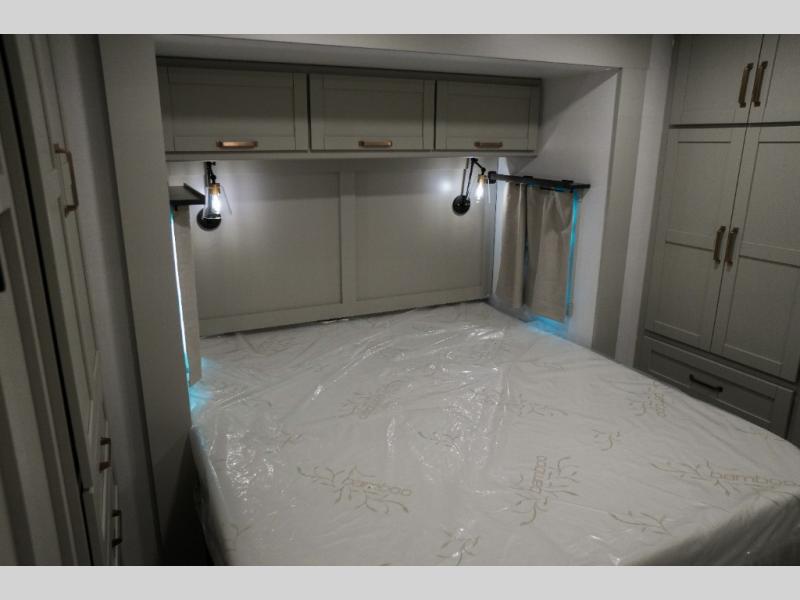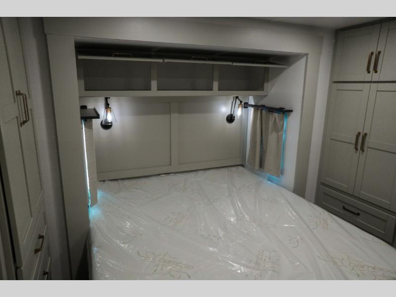 You will love all the space and features in this travel trailer! A luxurious rear living room offers plenty of room to spread out, with a 72" tri-fold sofa plus theater seats, all arranged with a perfect view of the 50" TV over the fireplace. A central kitchen area includes an island with hidden pet bowls. Find even more storage with the hutch plus pantry with adjustable shelves. The front bedroom comes with a queen bed, but if you'd like you can upgrade to a king for even more room. No matter which you choose, you will enjoy watching the 32" bedroom TV. The full-width wardrobe has room for all of your clothes and also includes prep for an optional washer and dryer. And the full bath includes a 30" x 42" one-piece fiberglass shower. Outside you'll enjoy two awnings, pass-through storage, and LED chassis lighting.