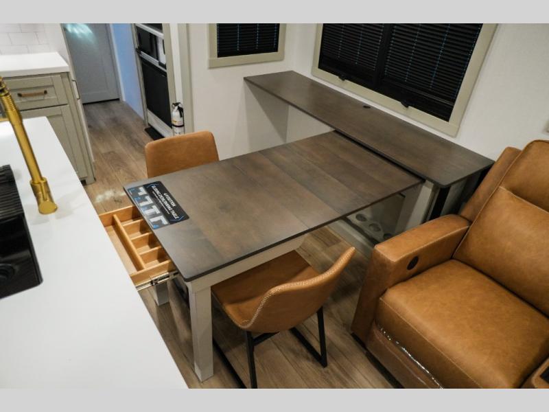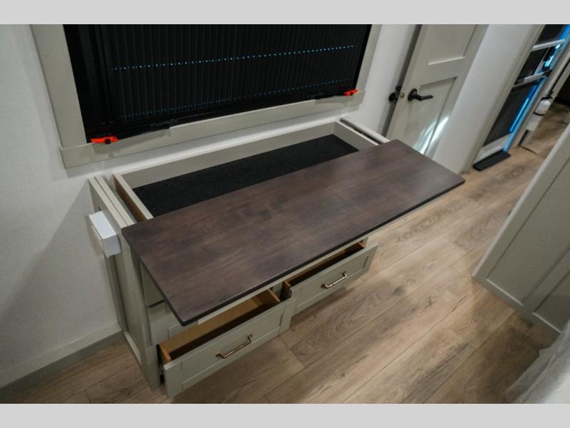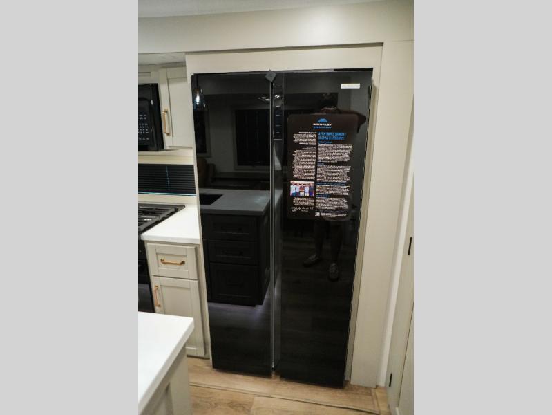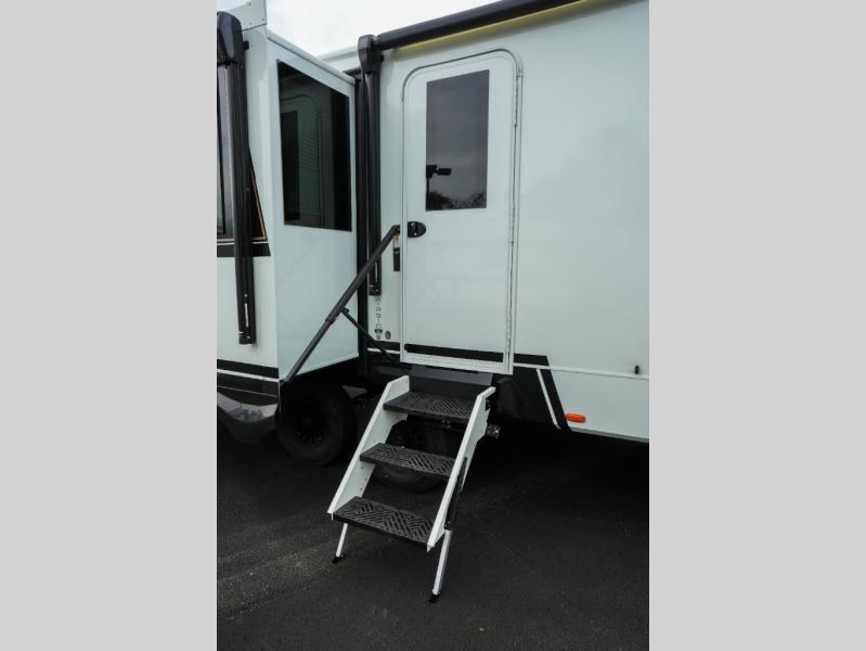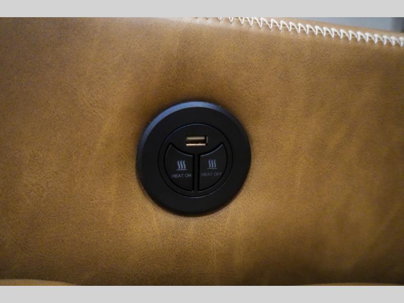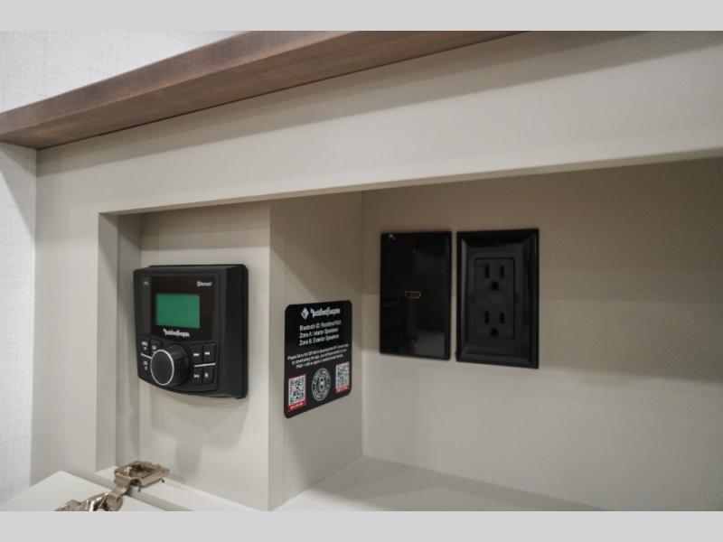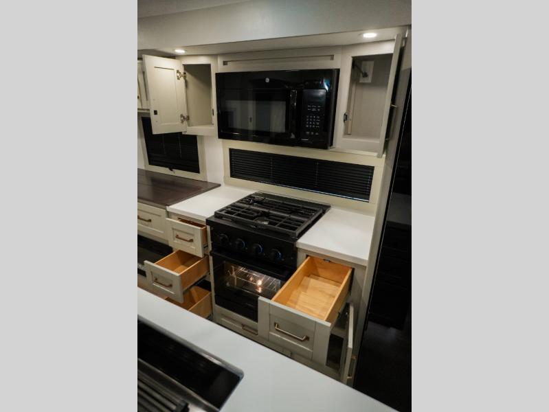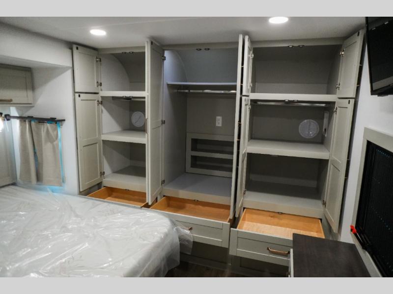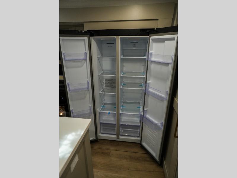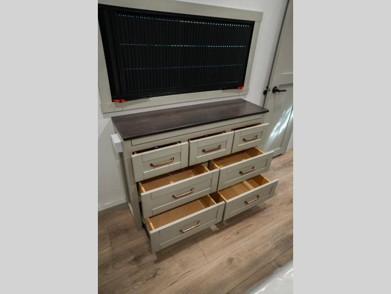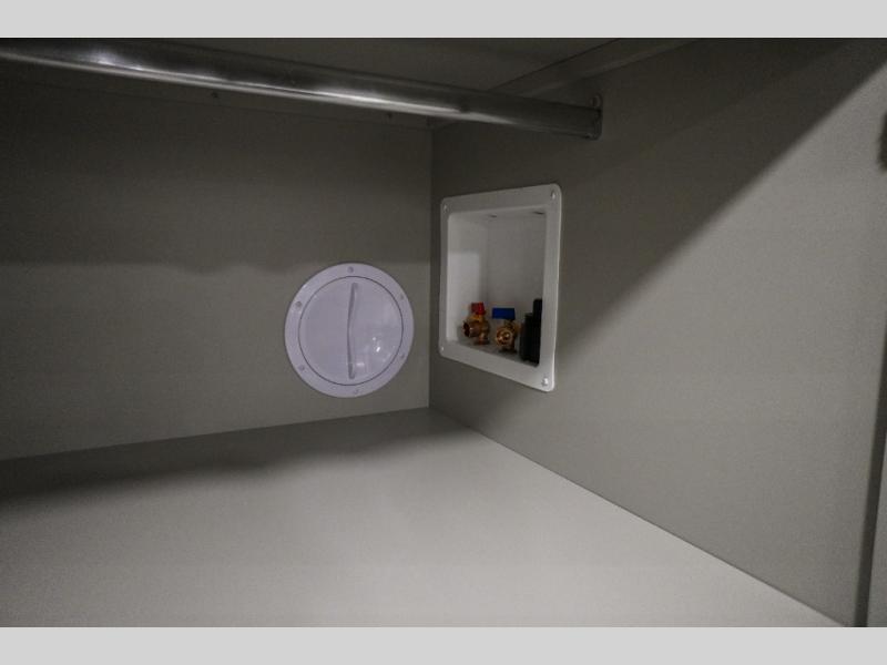 You will love all the space and features in this travel trailer! A luxurious rear living room offers plenty of room to spread out, with a 72" tri-fold sofa plus theater seats, all arranged with a perfect view of the 50" TV over the fireplace. A central kitchen area includes an island with hidden pet bowls. Find even more storage with the hutch plus pantry with adjustable shelves. The front bedroom comes with a queen bed, but if you'd like you can upgrade to a king for even more room. No matter which you choose, you will enjoy watching the 32" bedroom TV. The full-width wardrobe has room for all of your clothes and also includes prep for an optional washer and dryer. And the full bath includes a 30" x 42" one-piece fiberglass shower. Outside you'll enjoy two awnings, pass-through storage, and LED chassis lighting.