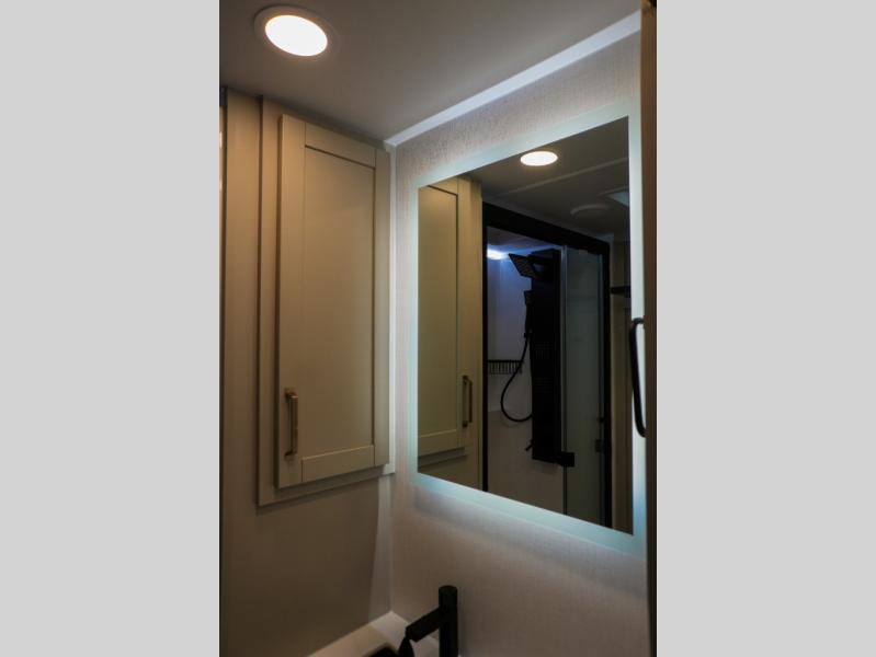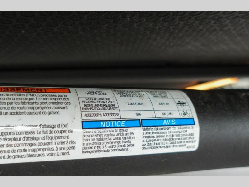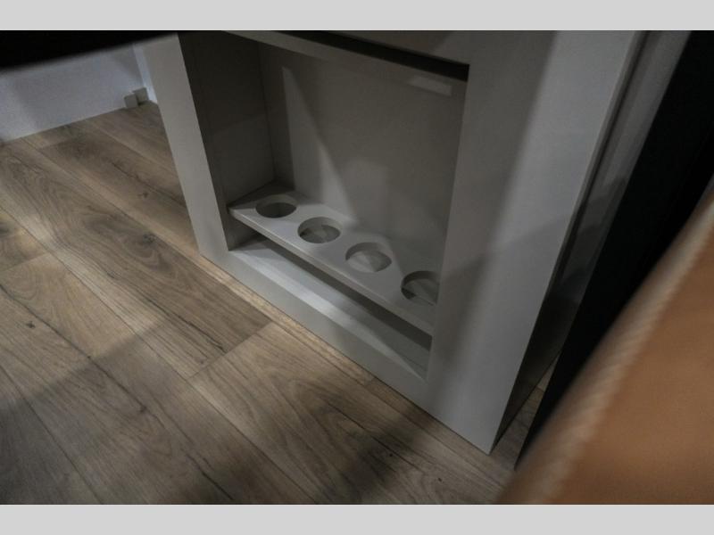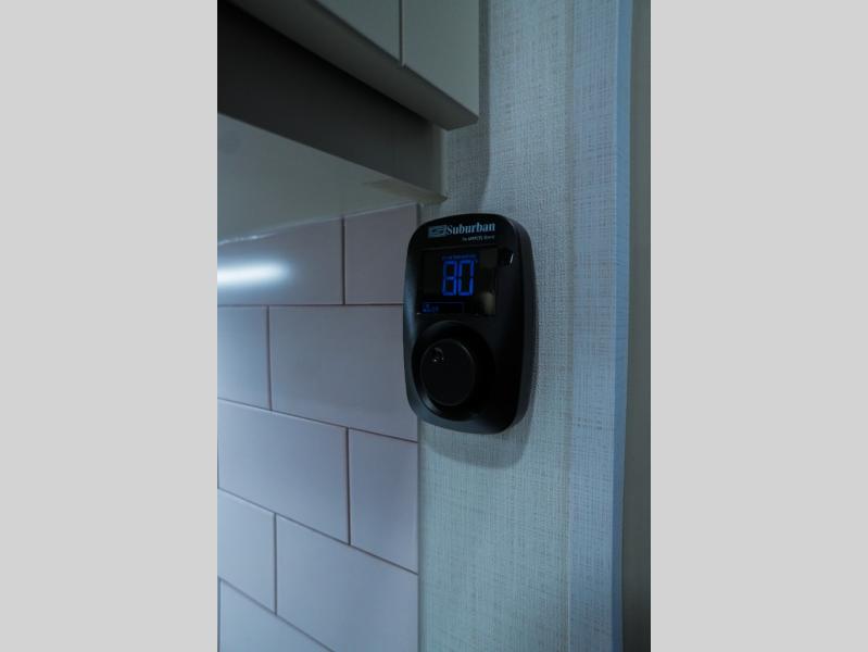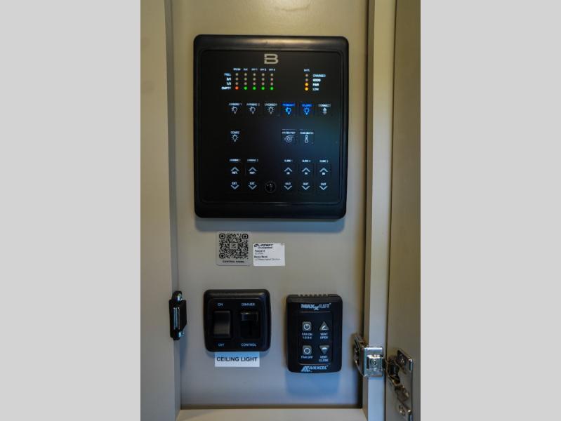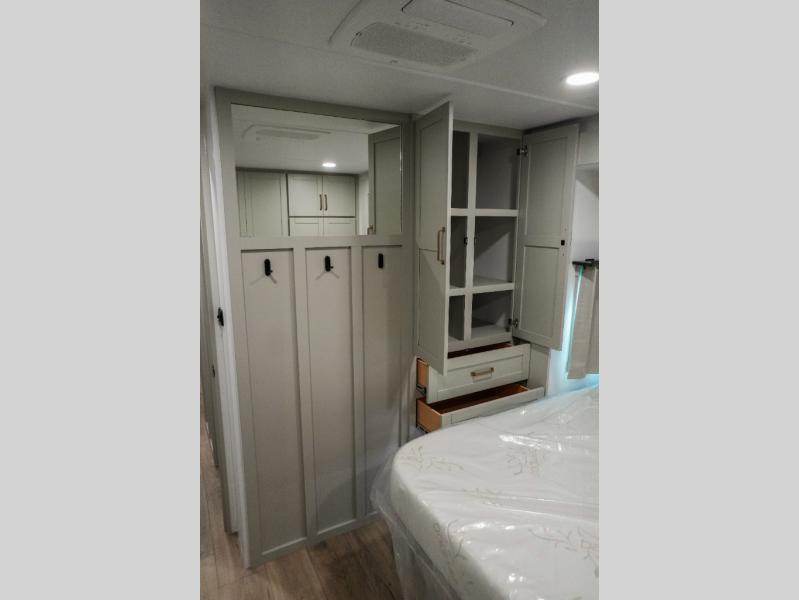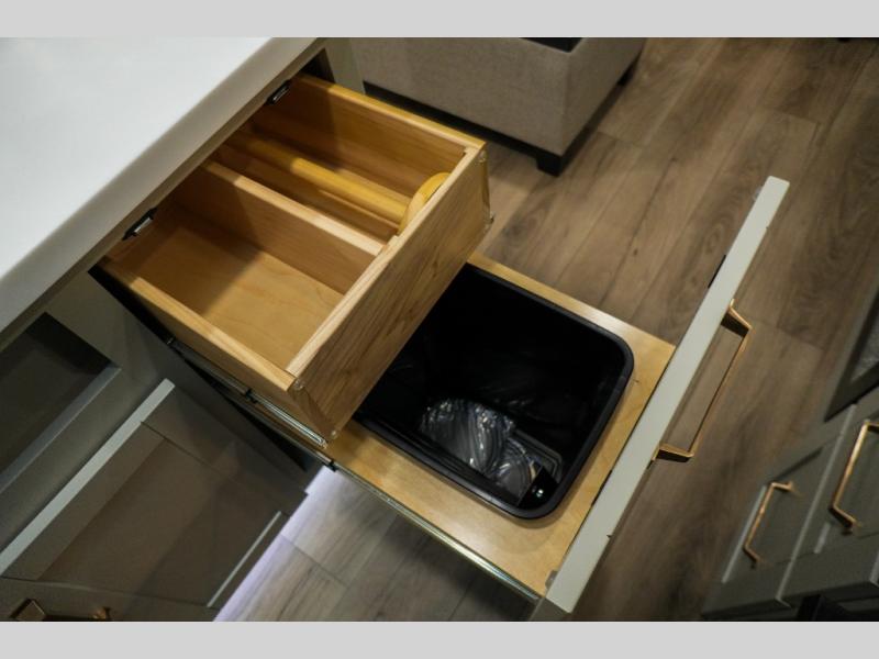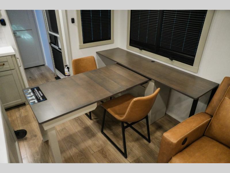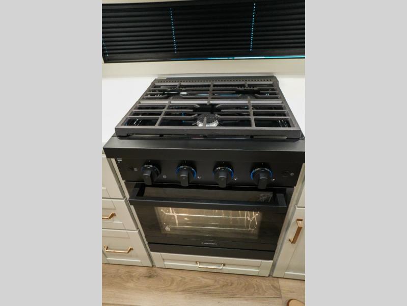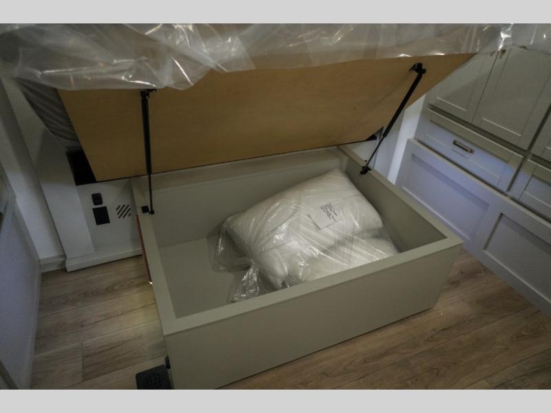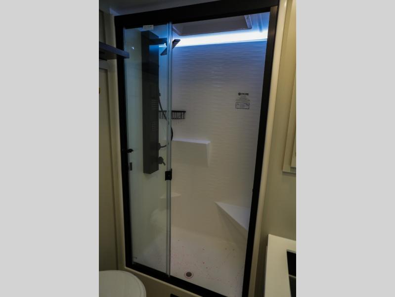 You will love all the space and features in this travel trailer! A luxurious rear living room offers plenty of room to spread out, with a 72" tri-fold sofa plus theater seats, all arranged with a perfect view of the 50" TV over the fireplace. A central kitchen area includes an island with hidden pet bowls. Find even more storage with the hutch plus pantry with adjustable shelves. The front bedroom comes with a queen bed, but if you'd like you can upgrade to a king for even more room. No matter which you choose, you will enjoy watching the 32" bedroom TV. The full-width wardrobe has room for all of your clothes and also includes prep for an optional washer and dryer. And the full bath includes a 30" x 42" one-piece fiberglass shower. Outside you'll enjoy two awnings, pass-through storage, and LED chassis lighting.