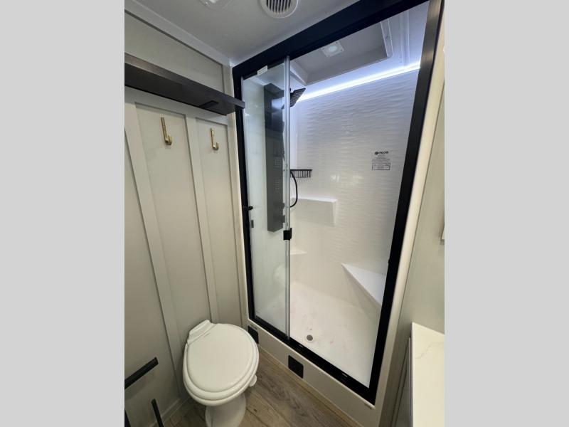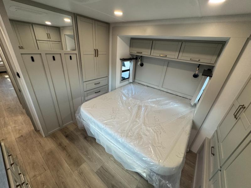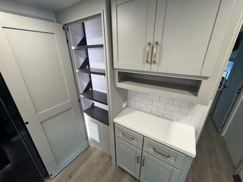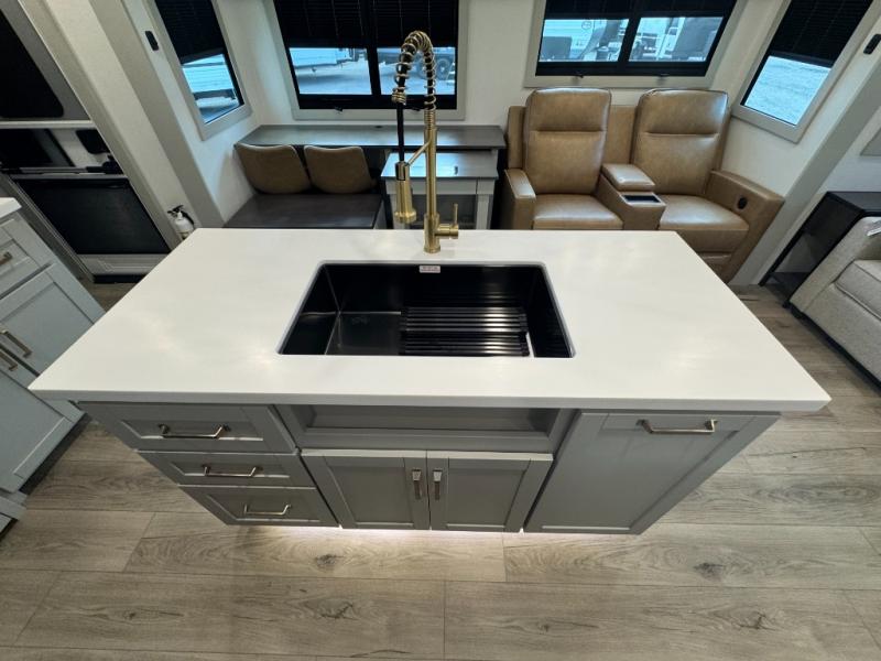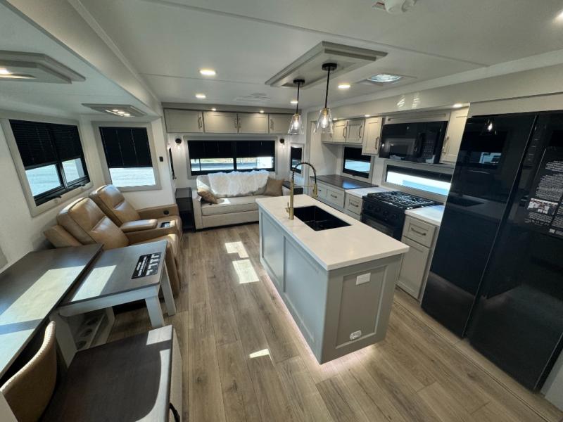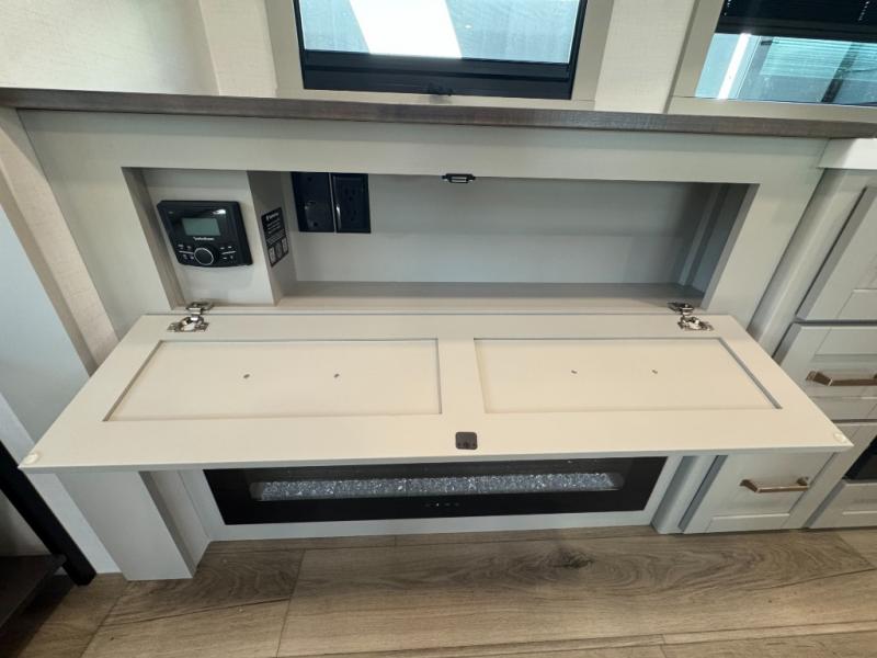 You will love all the space and features in this travel trailer! A luxurious rear living room offers plenty of room to spread out, with a 72" tri-fold sofa plus theater seats, all arranged with a perfect view of the 50" TV over the fireplace. A central kitchen area includes an island with hidden pet bowls. Find even more storage with the hutch plus pantry with adjustable shelves. The front bedroom comes with a queen bed, but if you'd like you can upgrade to a king for even more room. No matter which you choose, you will enjoy watching the 32" bedroom TV. The full-width wardrobe has room for all of your clothes and also includes prep for an optional washer and dryer. And the full bath includes a 30" x 42" one-piece fiberglass shower. Outside you'll enjoy two awnings, pass-through storage, and LED chassis lighting.